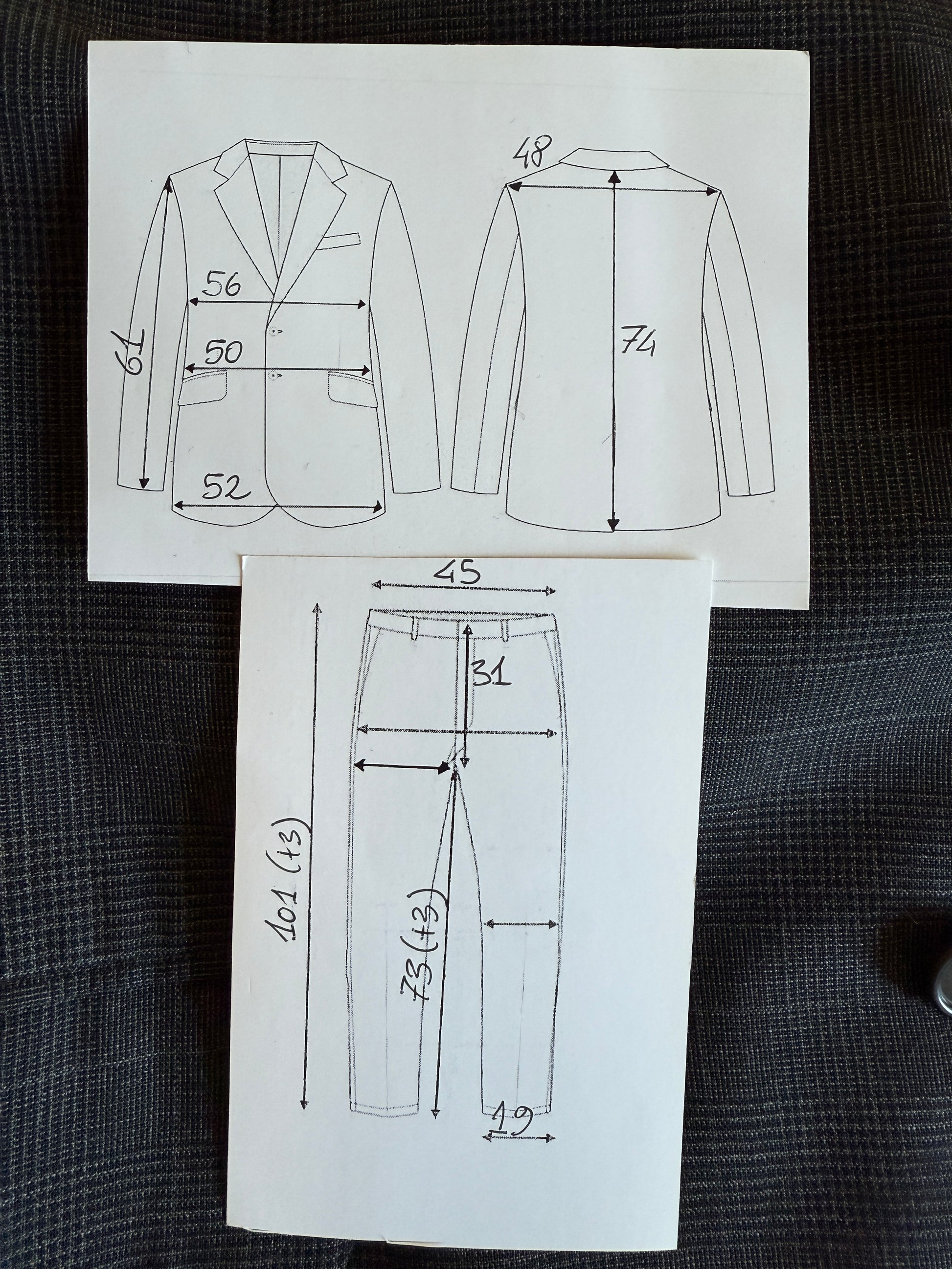 ⚠️ Per un confronto il più utile e accurato possibile, è necessario confrontare le misure solo fra abiti dal taglio simile: ad esempio, un abito dal taglio classico (giacca morbida e pantalone a vita alta) con un altro abito analogo, non con un abito slim fit o con un abito tipo anni '70 dal taglio snello e avvitato (e viceversa).