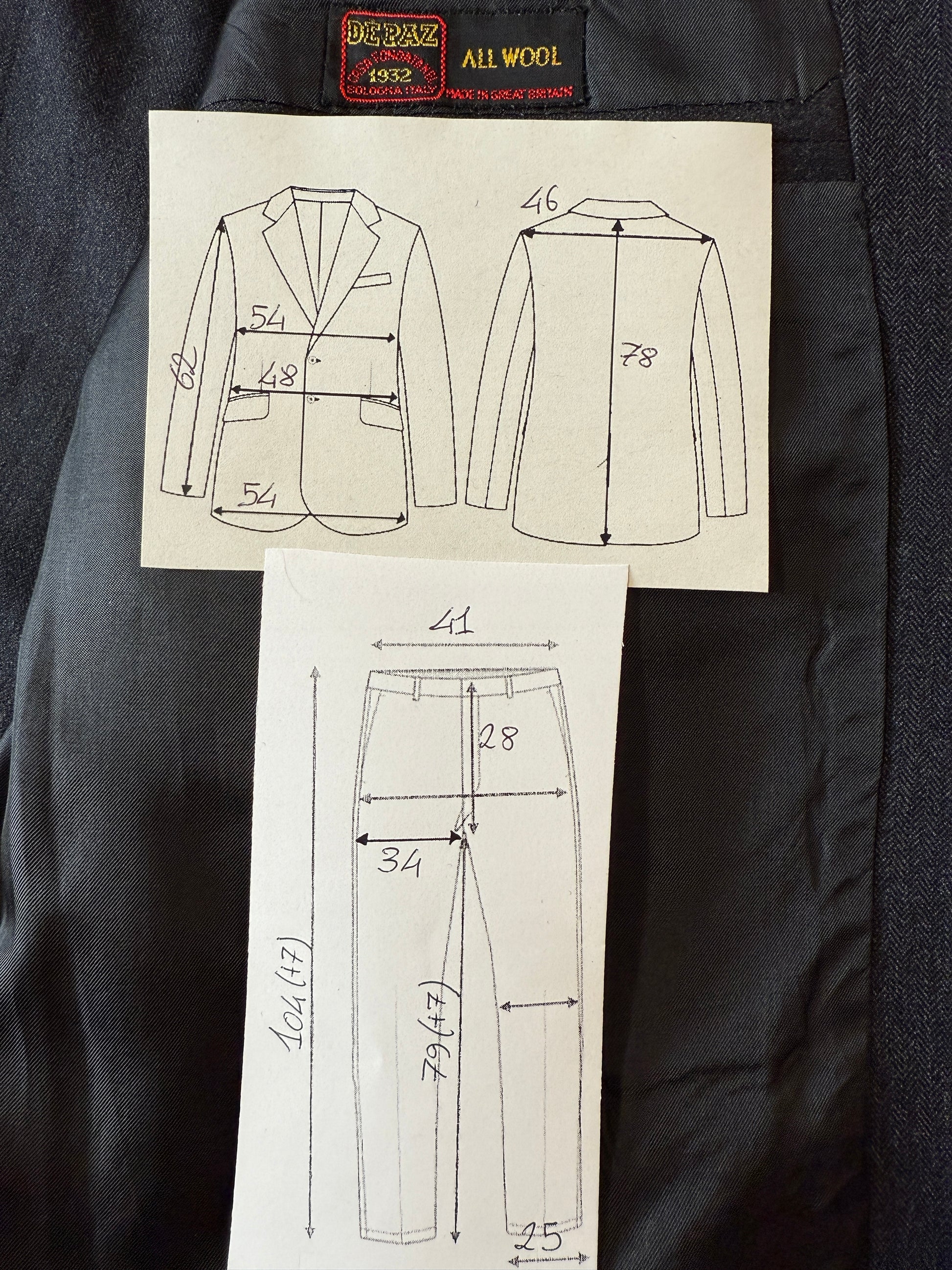 ⚠️ Per un confronto il più utile e accurato possibile, è necessario confrontare le misure solo fra abiti dal taglio simile: ad esempio, un abito dal taglio classico (giacca morbida e pantalone a vita alta) con un altro abito analogo, non con un abito slim fit o con un abito tipo anni '70 dal taglio snello e avvitato (e viceversa).