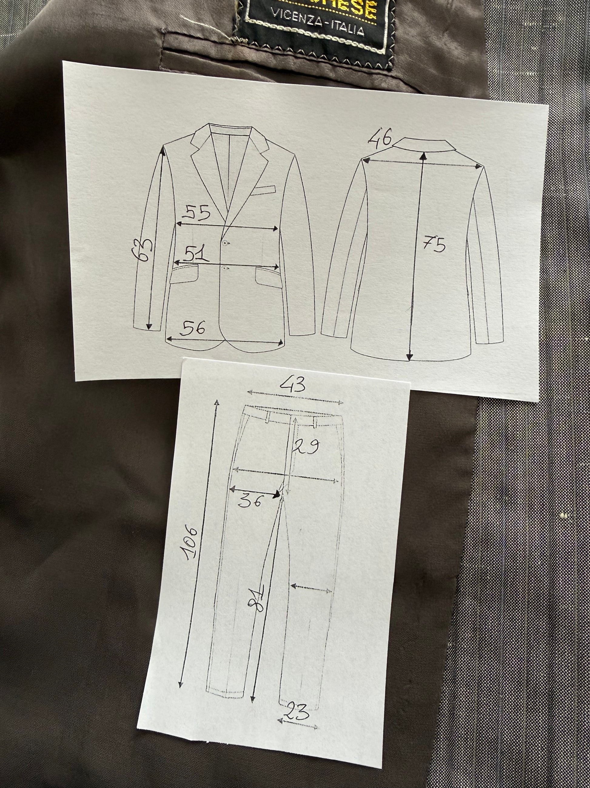 ⚠️ Per un confronto il più utile e accurato possibile, è necessario confrontare le misure solo fra abiti dal taglio simile: ad esempio, un abito dal taglio classico (giacca morbida e pantalone a vita alta) con un altro abito analogo, non con un abito slim fit o con un abito tipo anni '70 dal taglio snello e avvitato (e viceversa).
