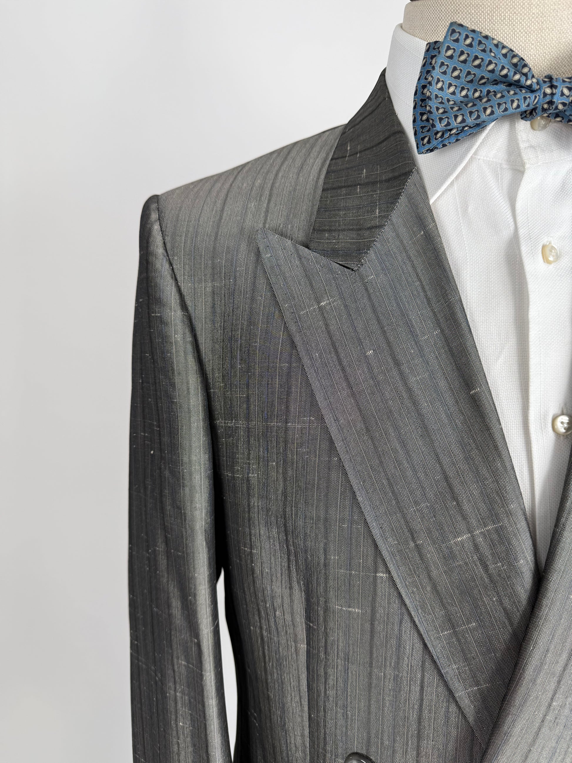 La giacca è un tipico doppiopetto allacciato a 1 (4x1), con baveri a lancia, tasche a filetto, e doppio spacco posteriore.