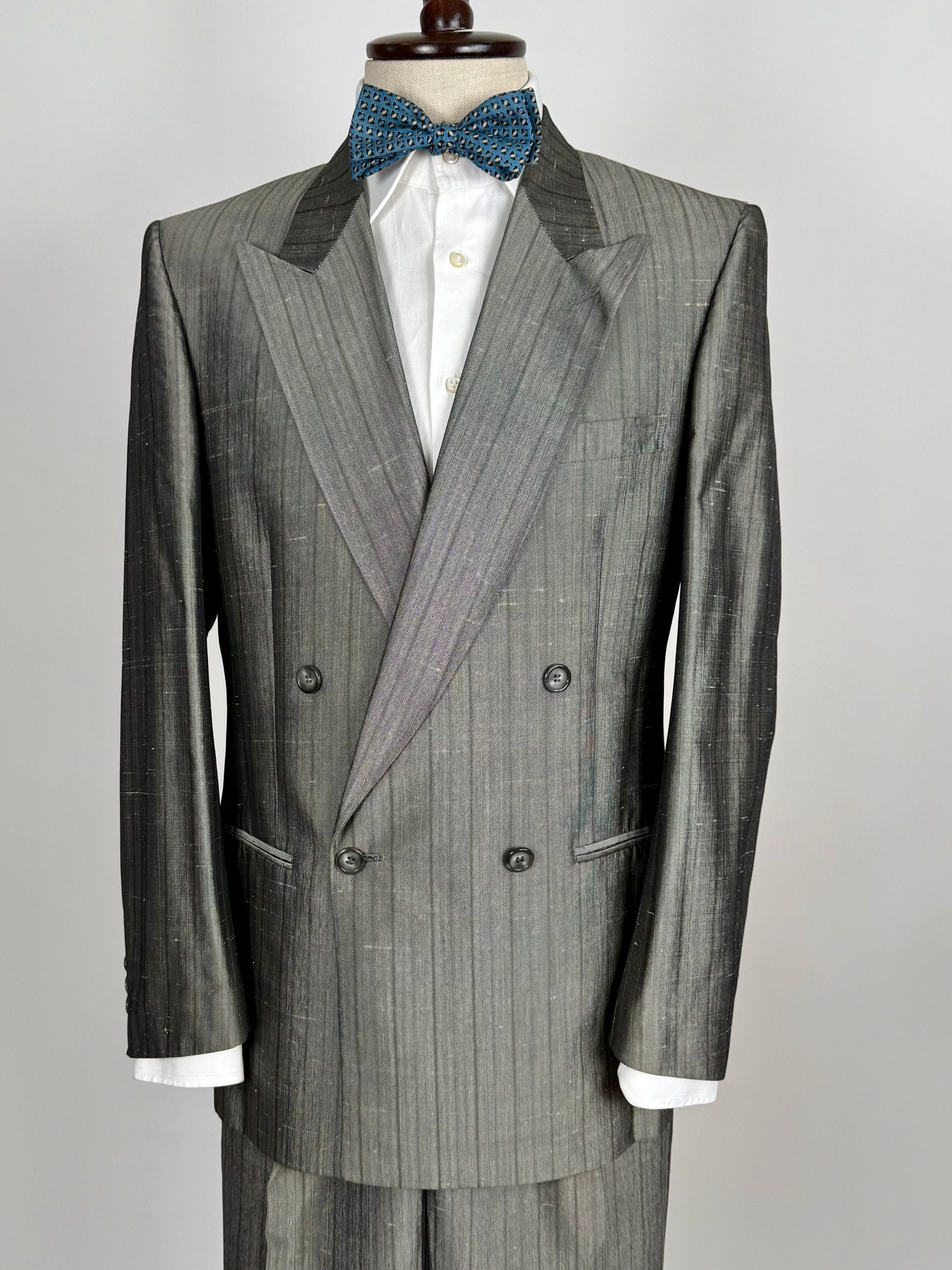 Abito doppiopetto di tipica confezione anni '70/'80, in un bellissimo tessuto 100% seta shantung.