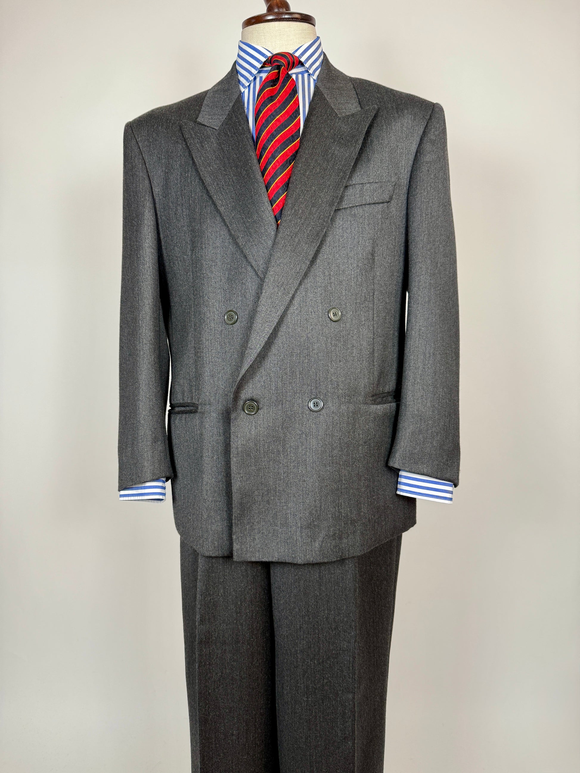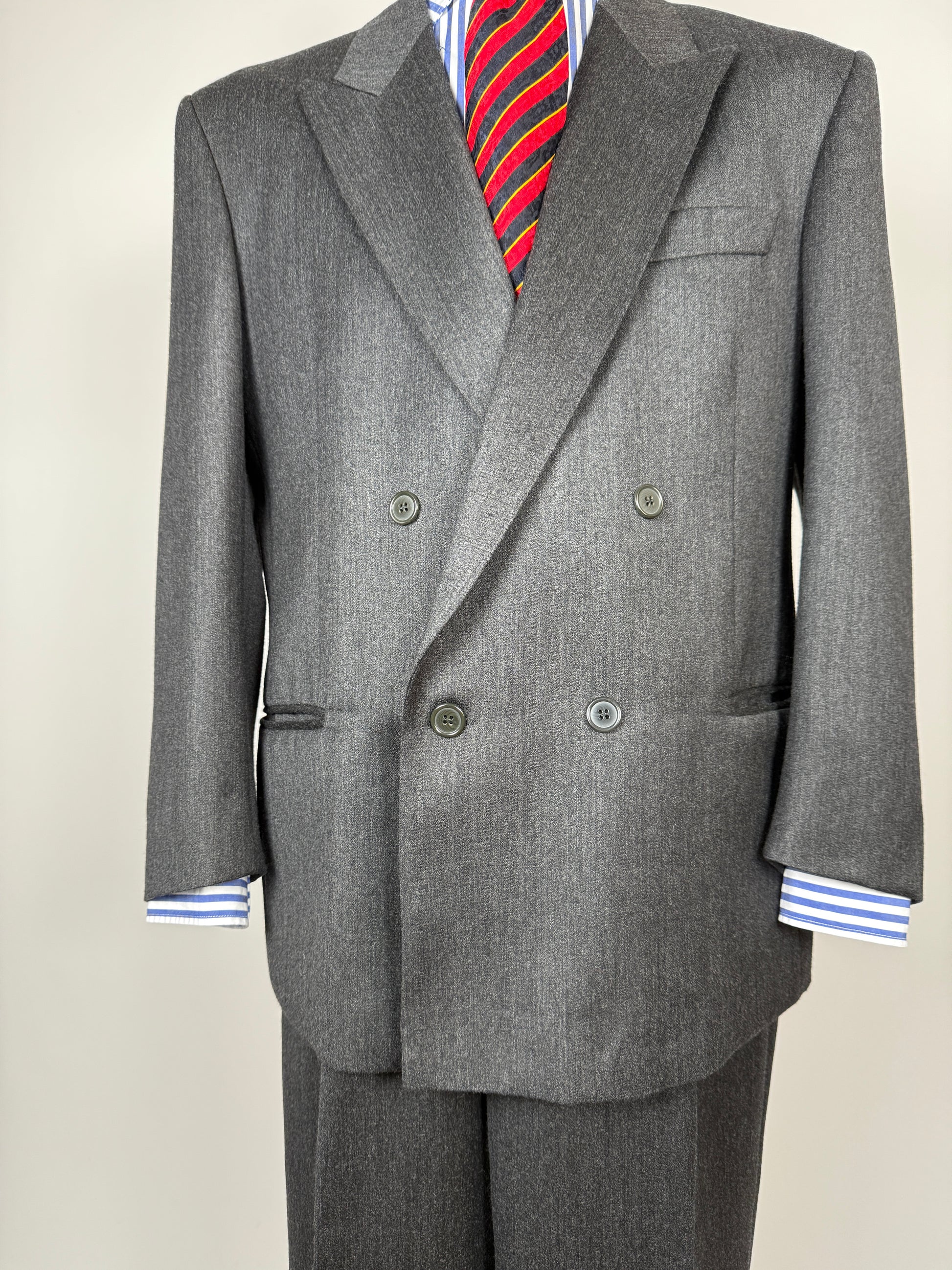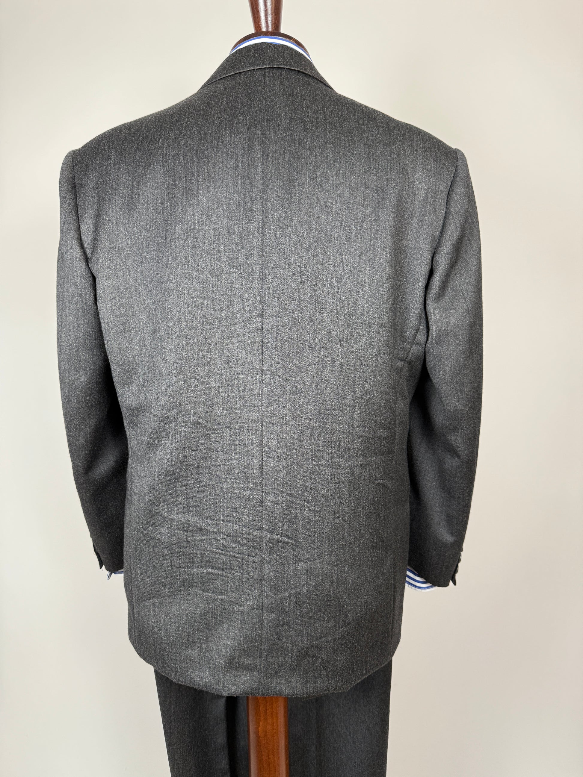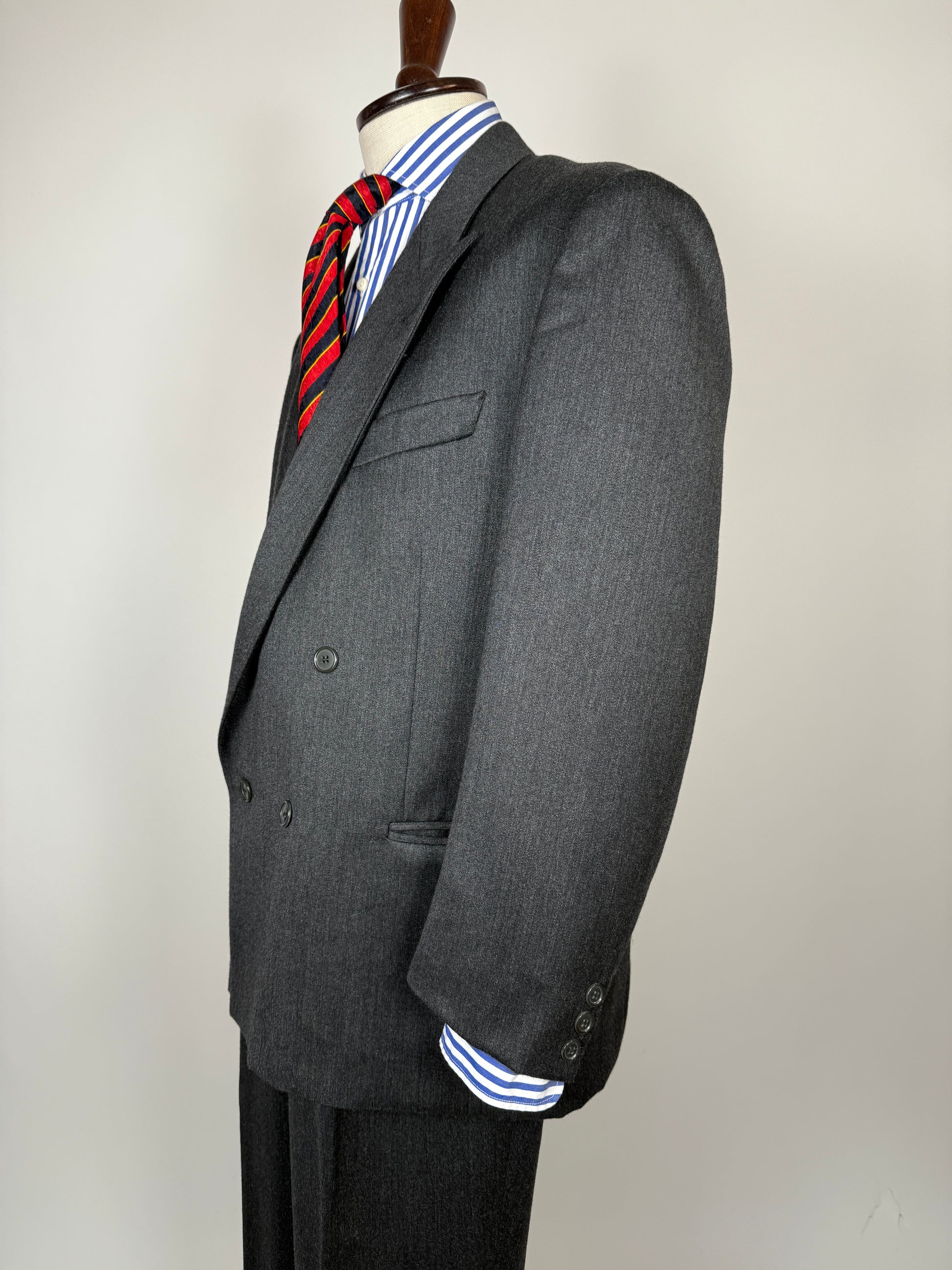 Abito doppiopetto di confezione anni ‘80, in flanella pettinata 100% lana color grigio antracite.