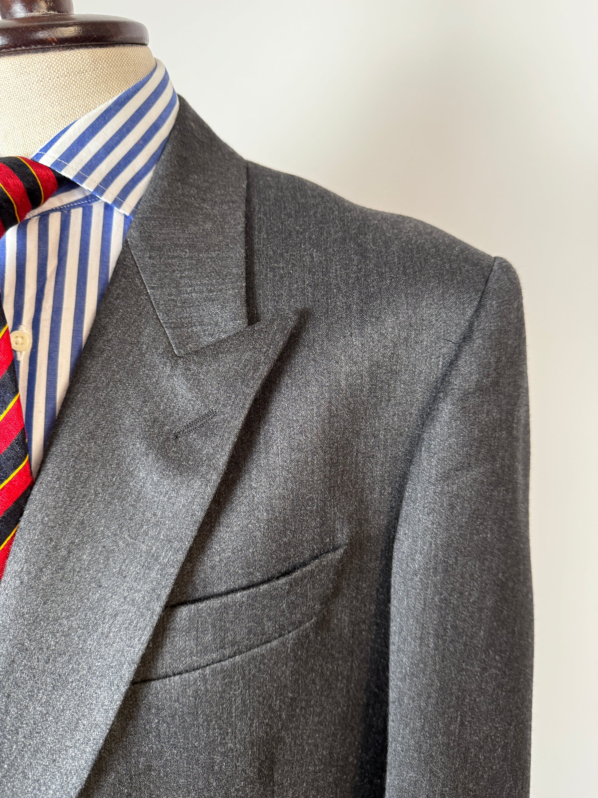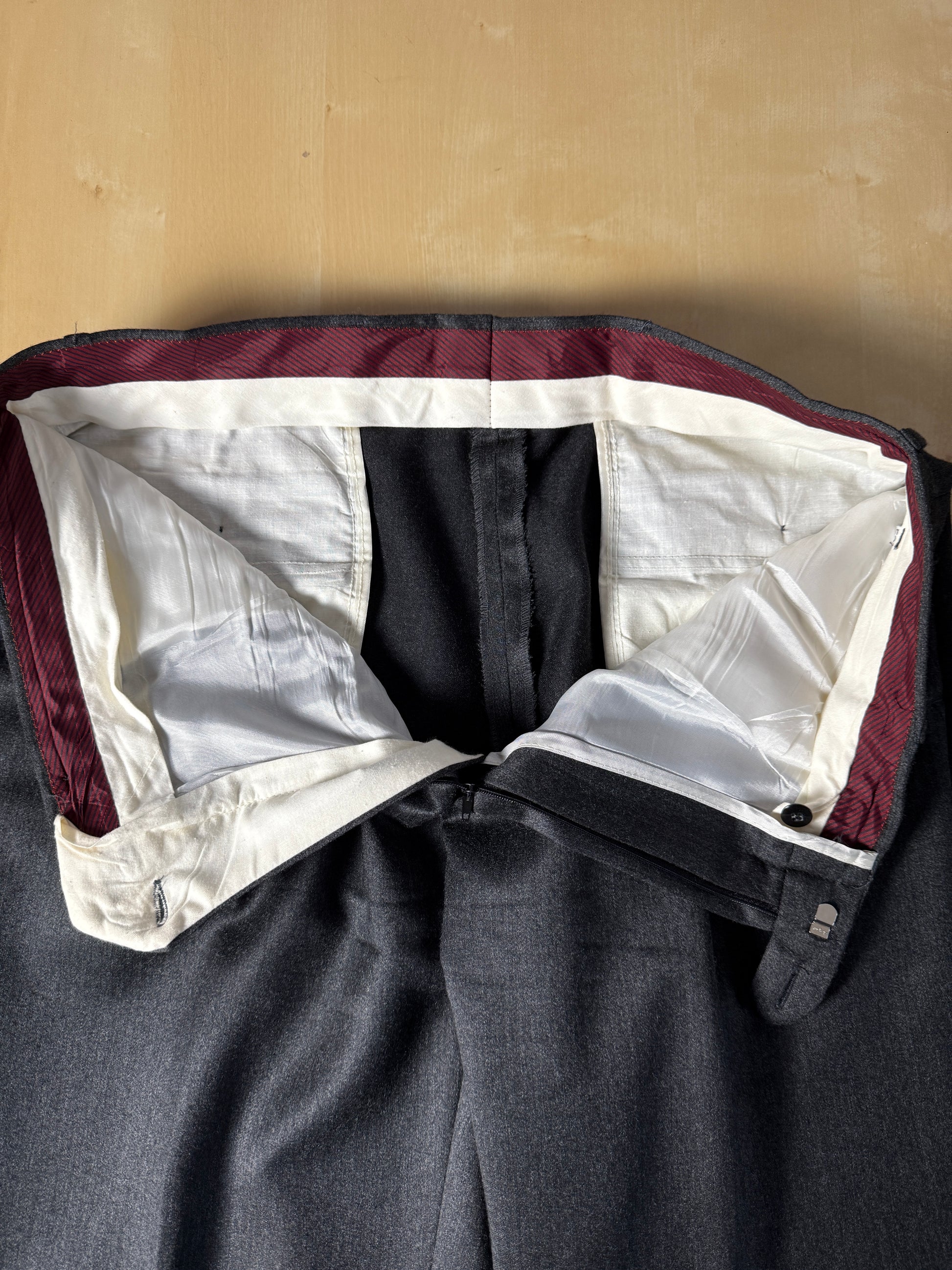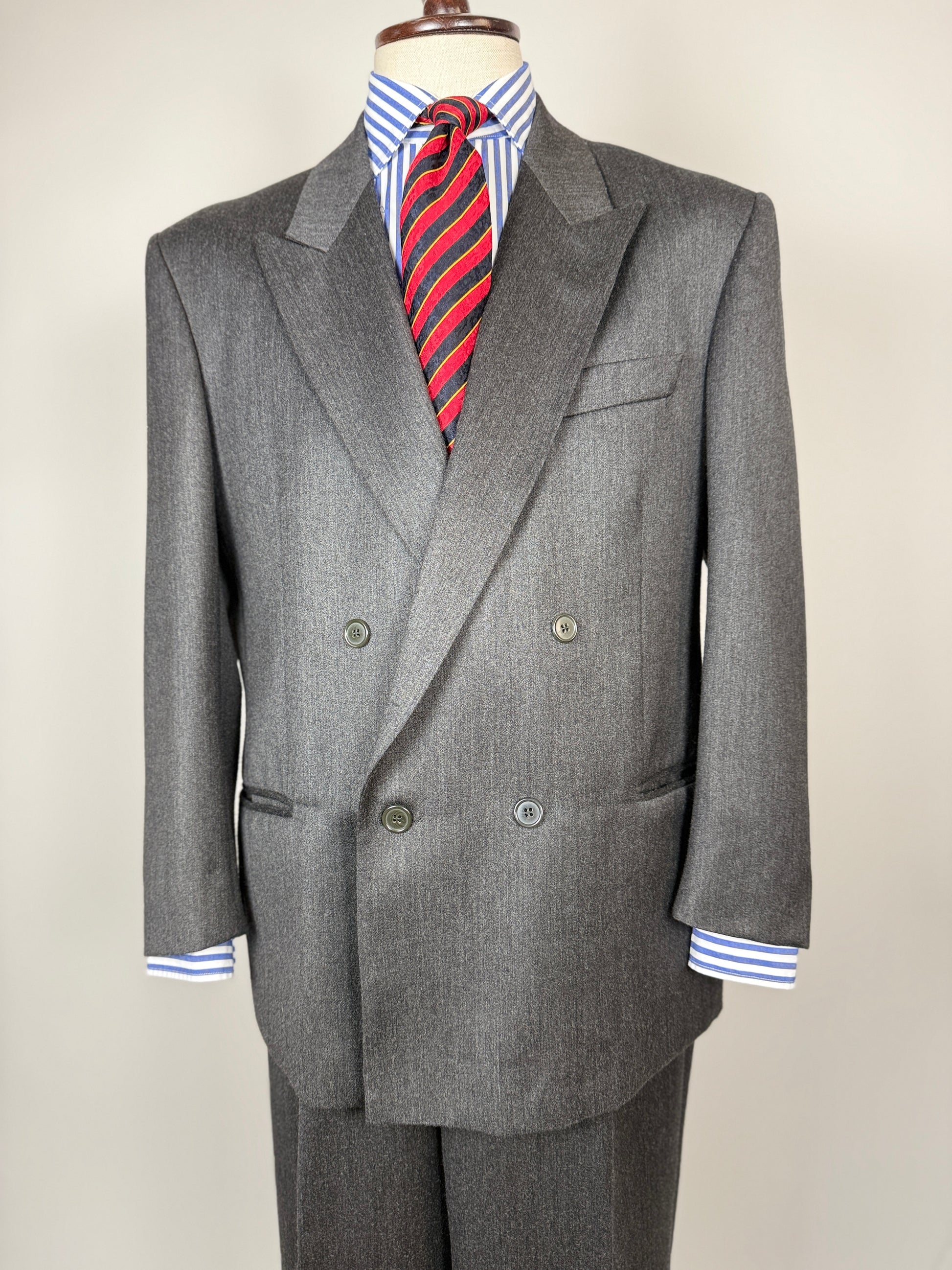 Abito doppiopetto di confezione anni ‘80, in flanella pettinata 100% lana color grigio antracite.
