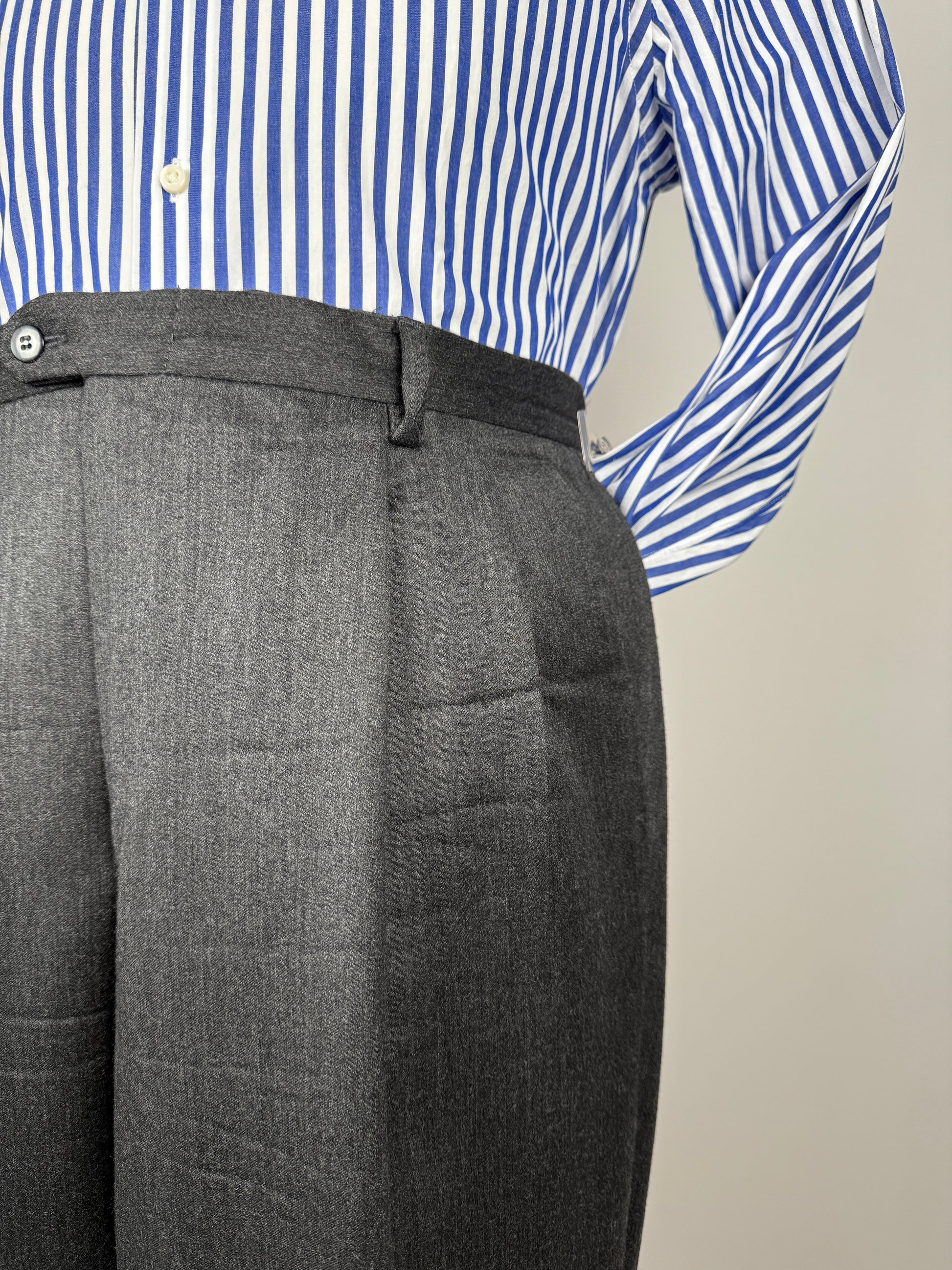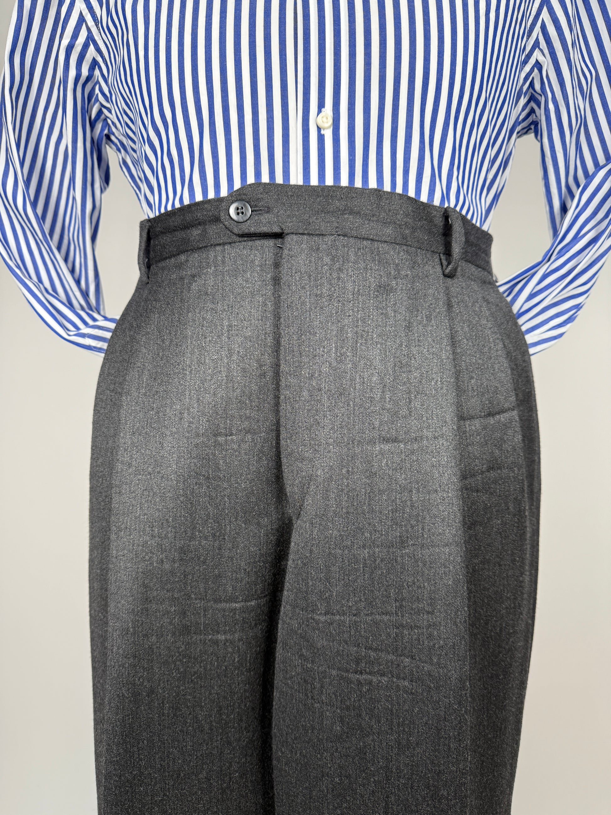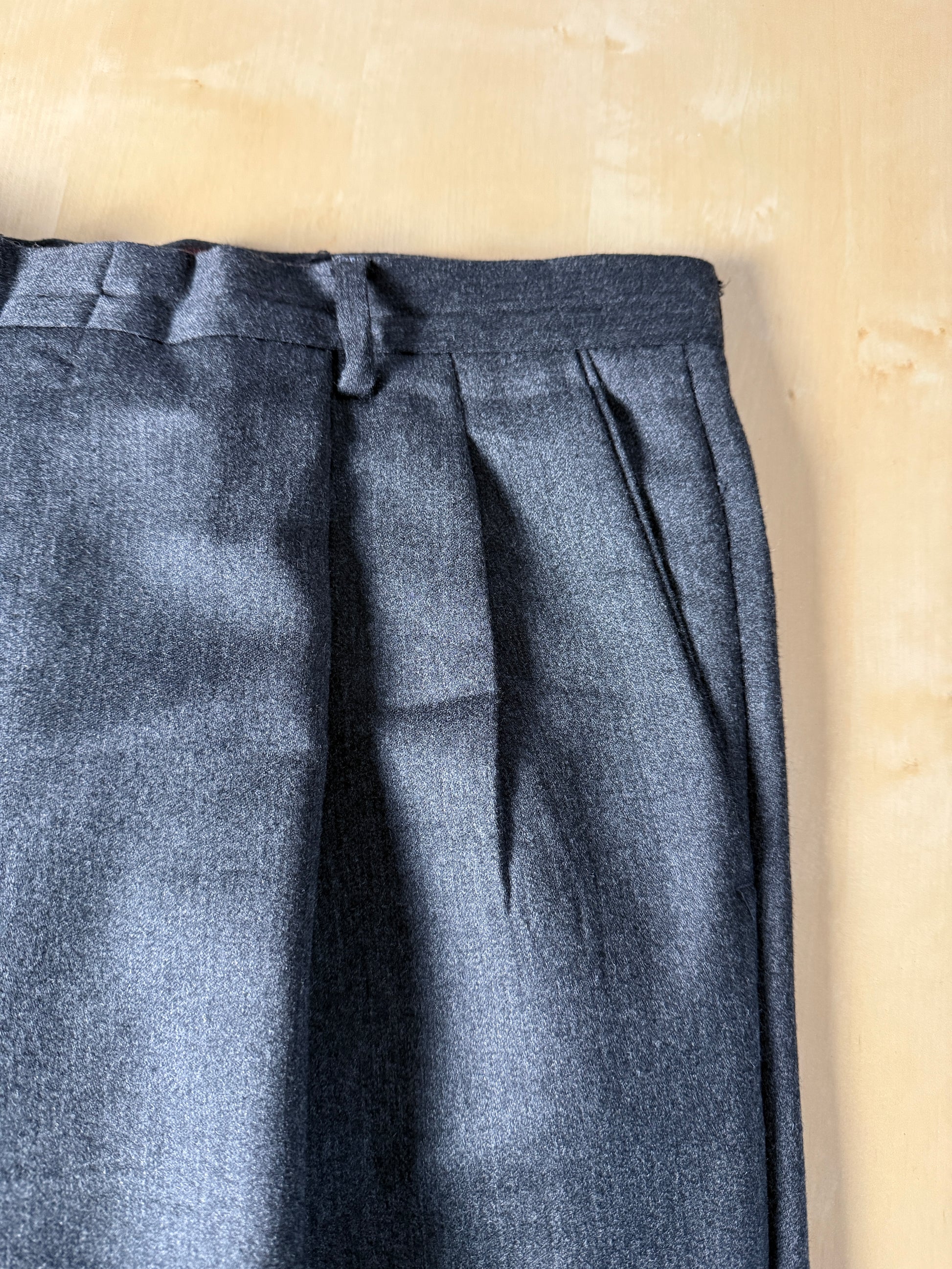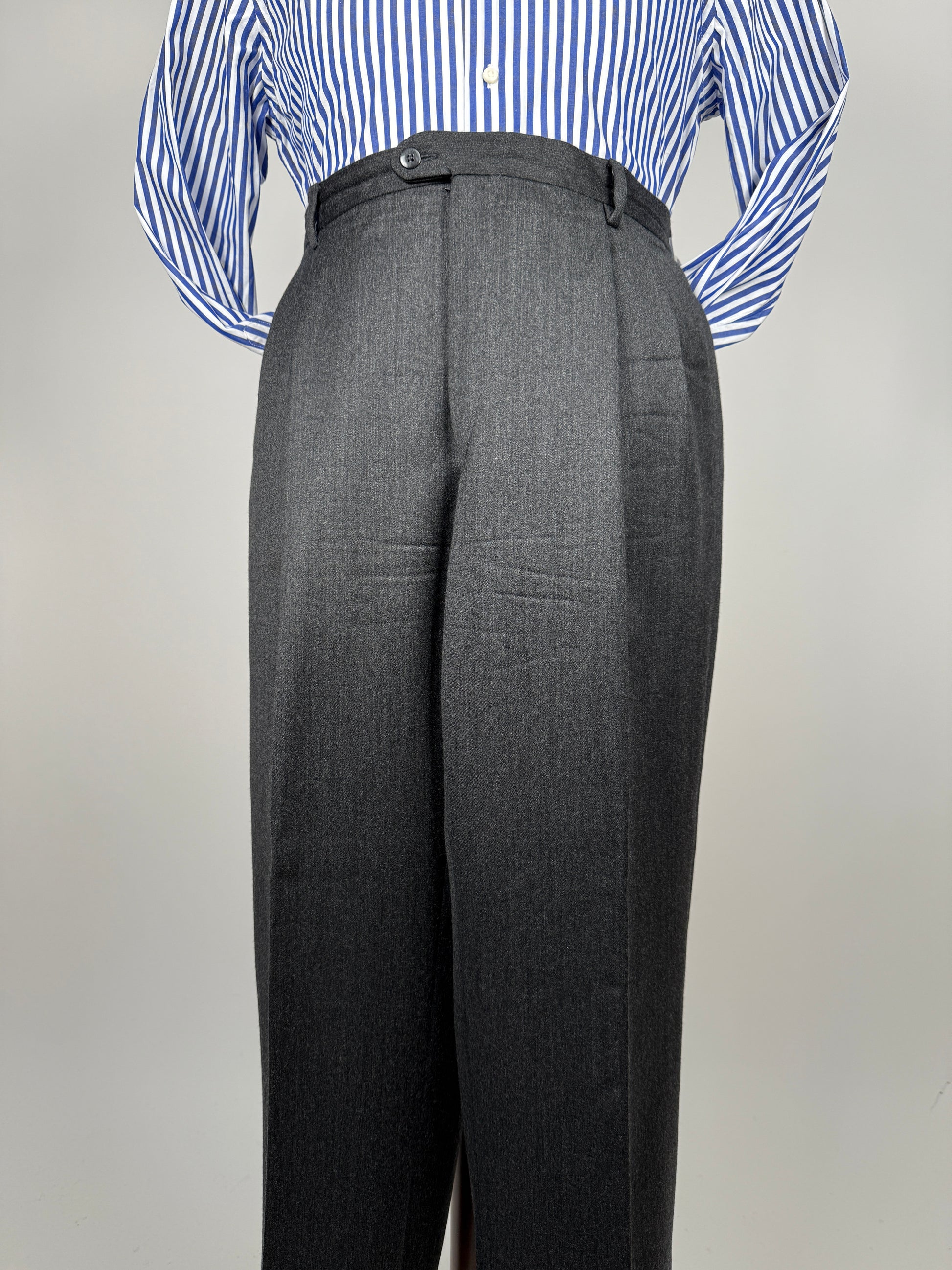 Abito doppiopetto di confezione anni ‘80, in flanella pettinata 100% lana color grigio antracite.