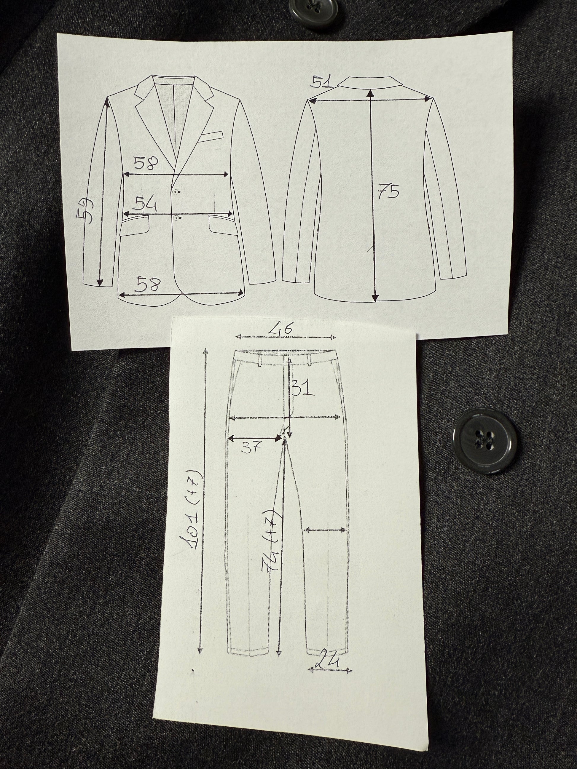 ⚠️ Per un confronto il più utile e accurato possibile, è necessario confrontare le misure solo fra abiti dal taglio simile: ad esempio, un abito dal taglio classico (giacca morbida e pantalone a vita alta) con un altro abito analogo, non con un abito slim fit o con un abito tipo anni '70 dal taglio snello e avvitato (e viceversa).