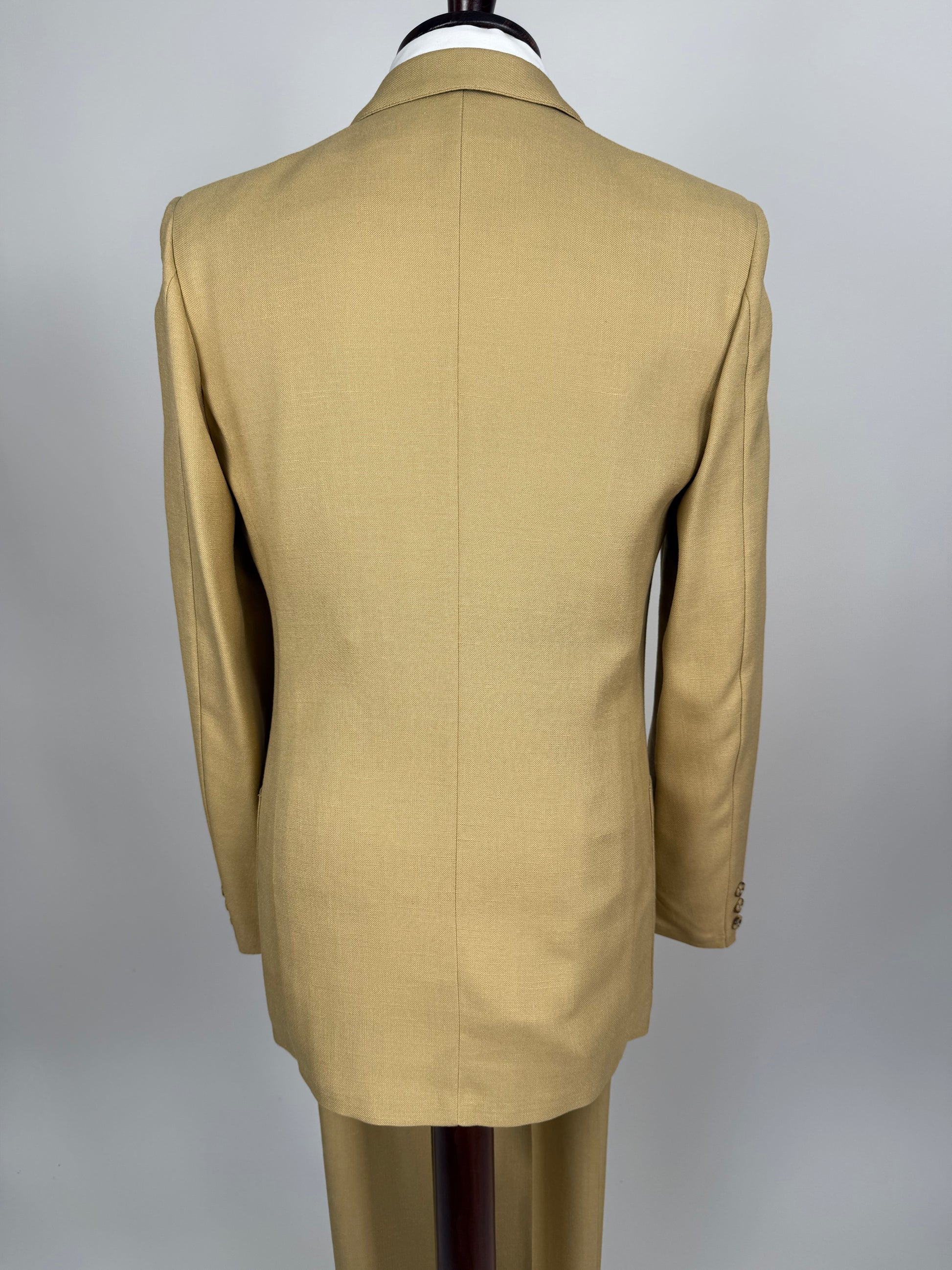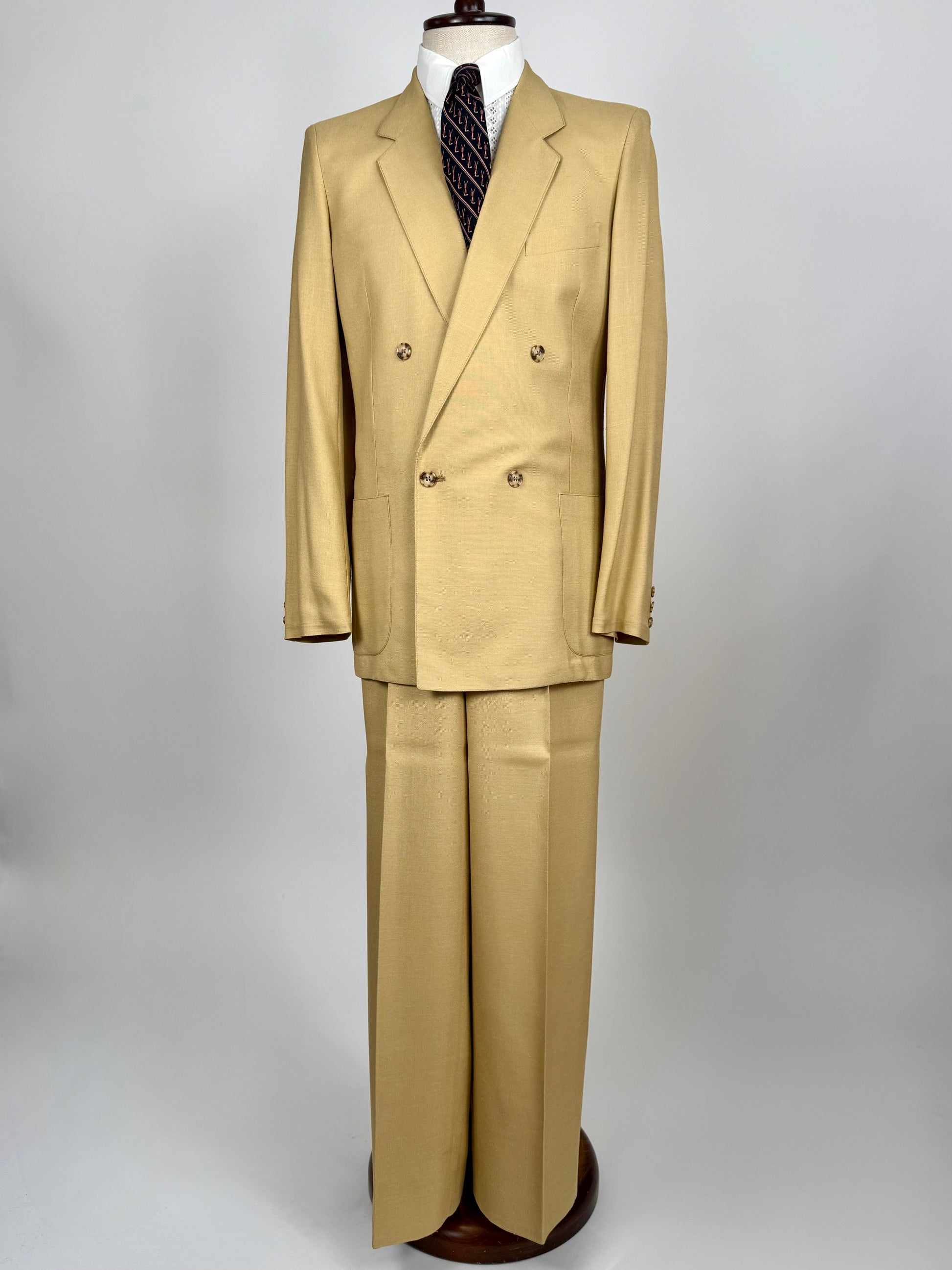 Tipico abito estivo anni ‘70/‘80, di un bel colore beige acceso, con la comune configurazione a doppiopetto 4x1 abbinato ai baveri a dente.