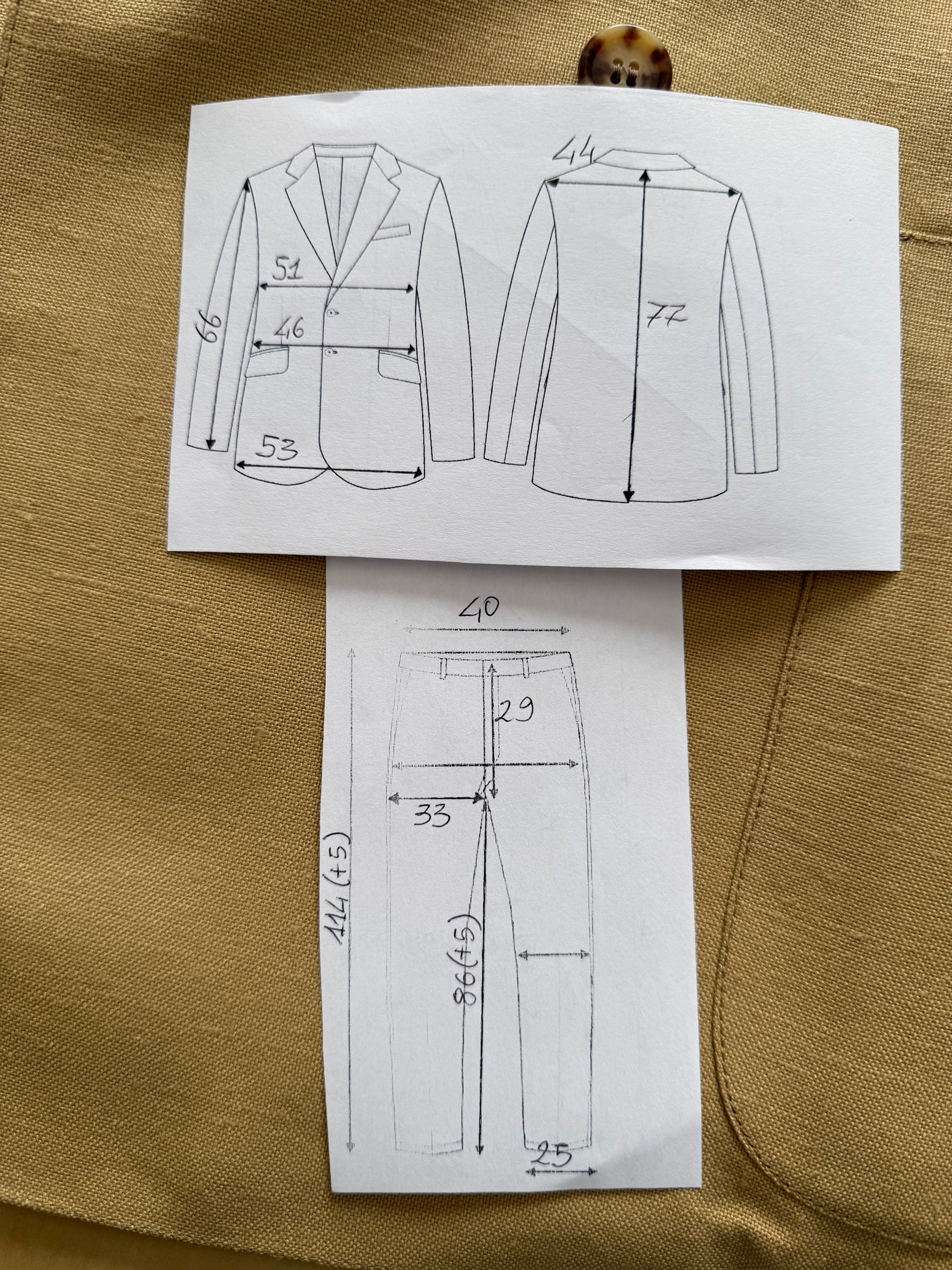 ⚠️ Per un confronto il più utile e accurato possibile, è necessario confrontare le misure solo fra abiti dal taglio simile: ad esempio, un abito dal taglio classico (giacca morbida e pantalone a vita alta) con un altro abito analogo, non con un abito slim fit o con un abito tipo anni '70 dal taglio snello e avvitato (e viceversa).