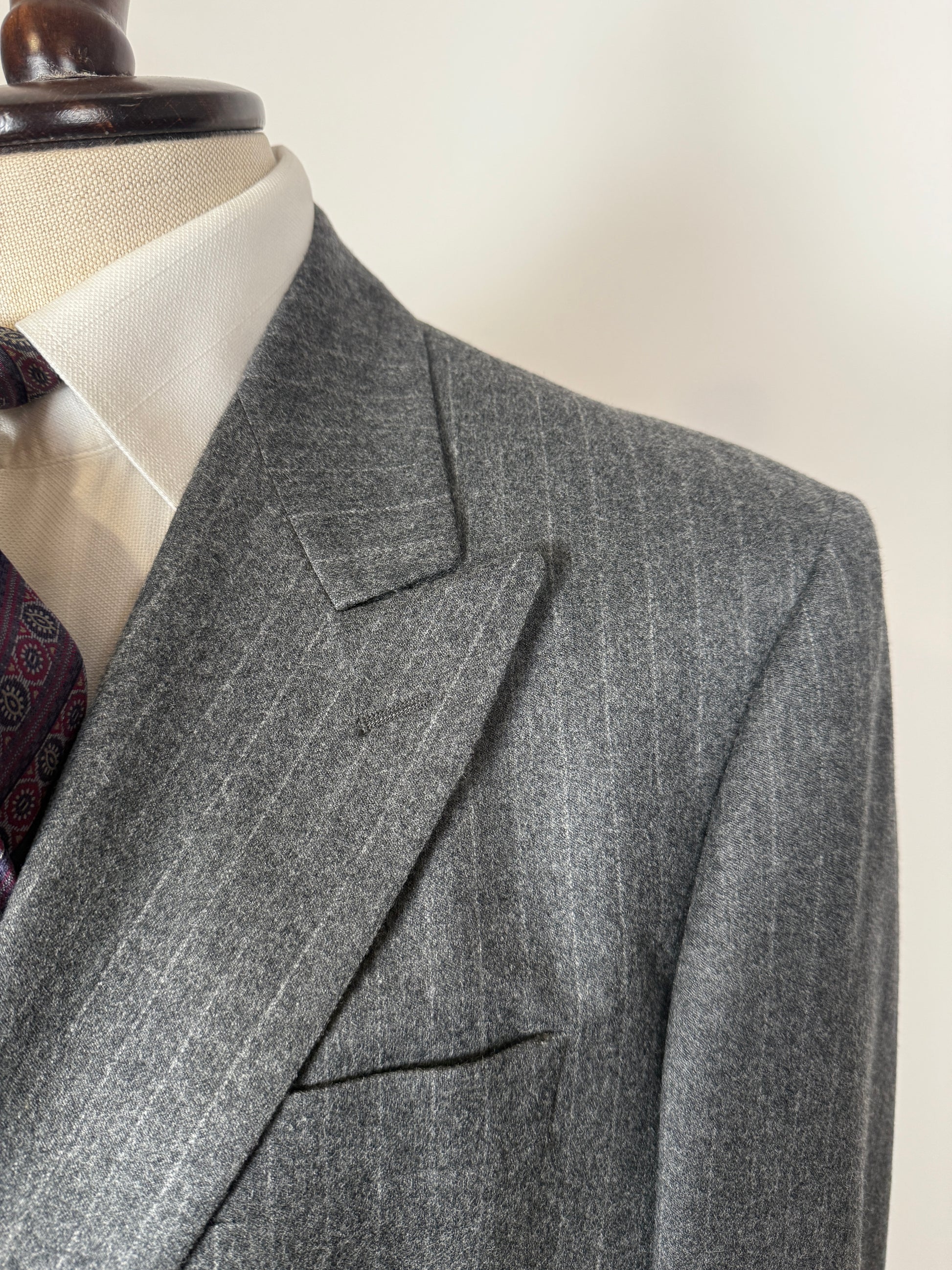 Bell'abito doppiopetto di confezione anni ‘80/‘90, in flanella di lana invernale grigio gessato.
