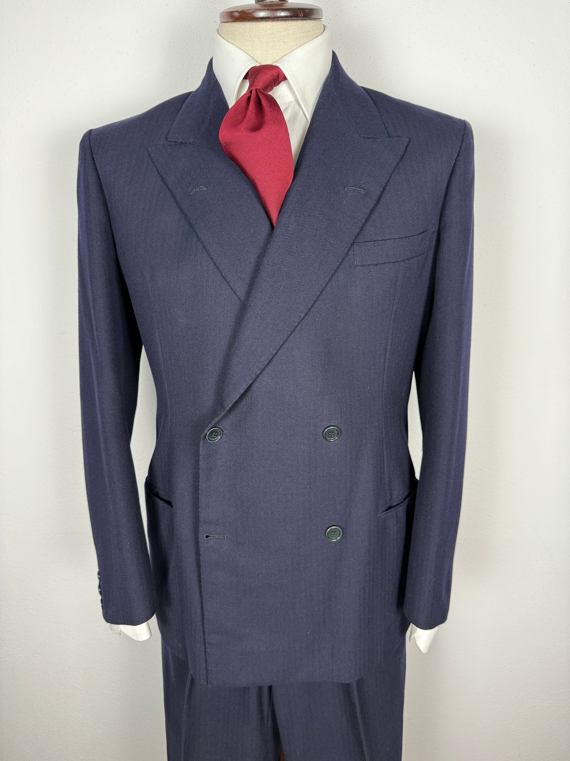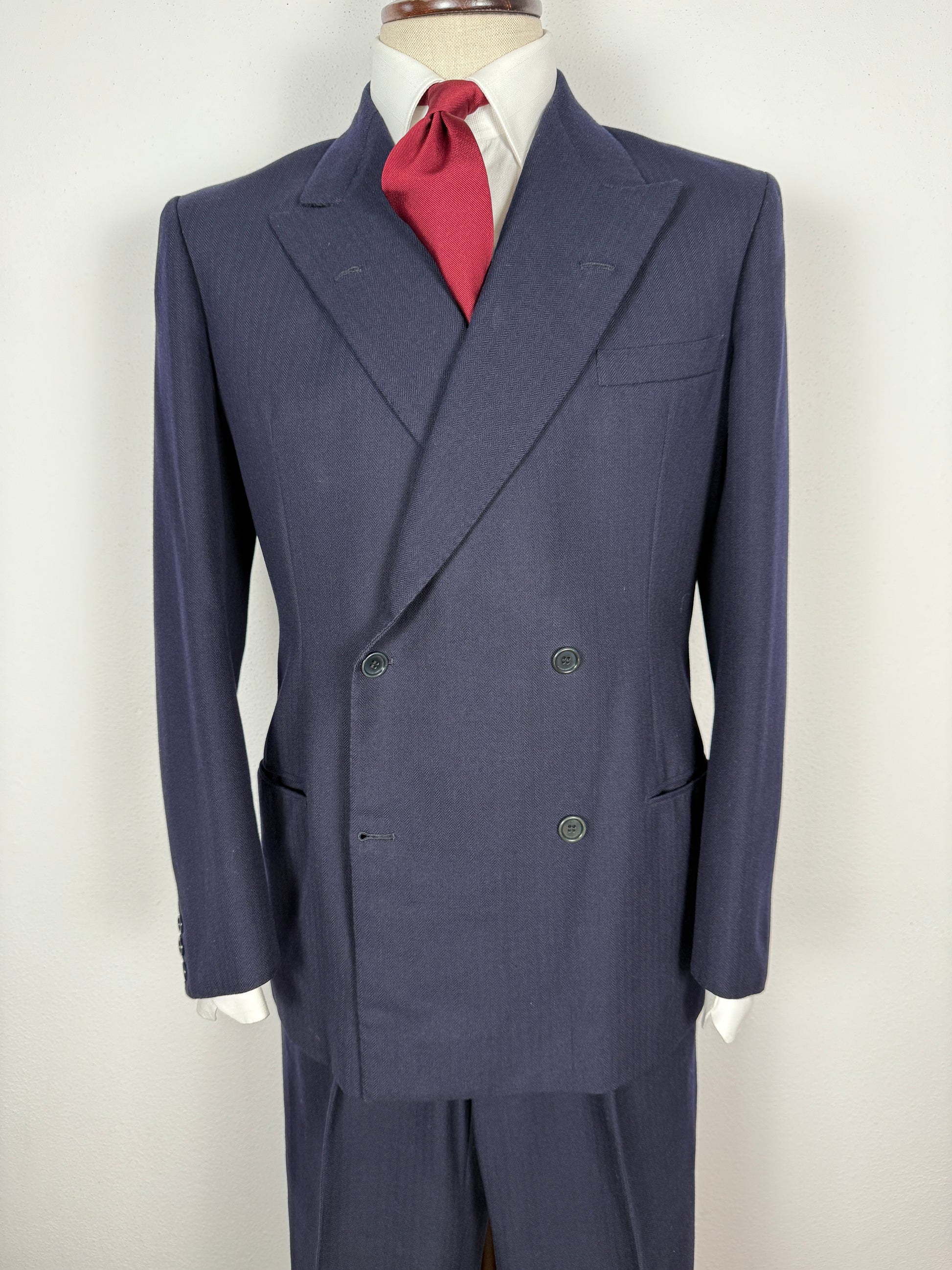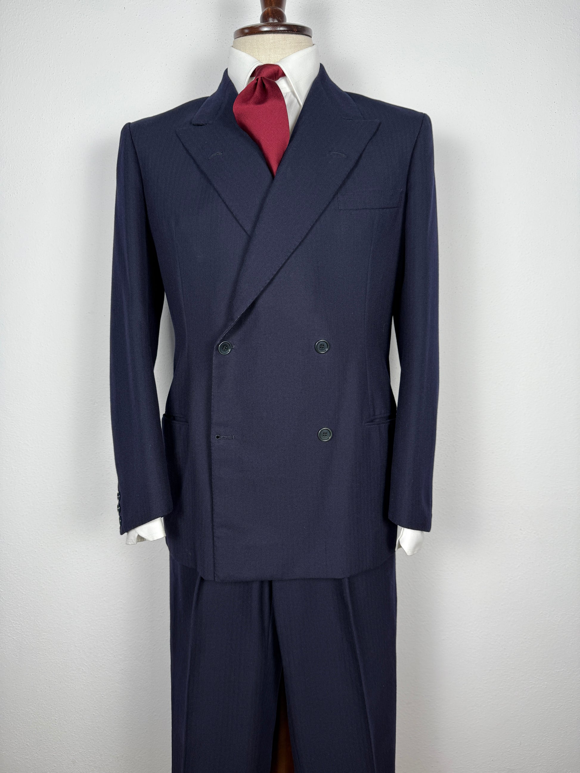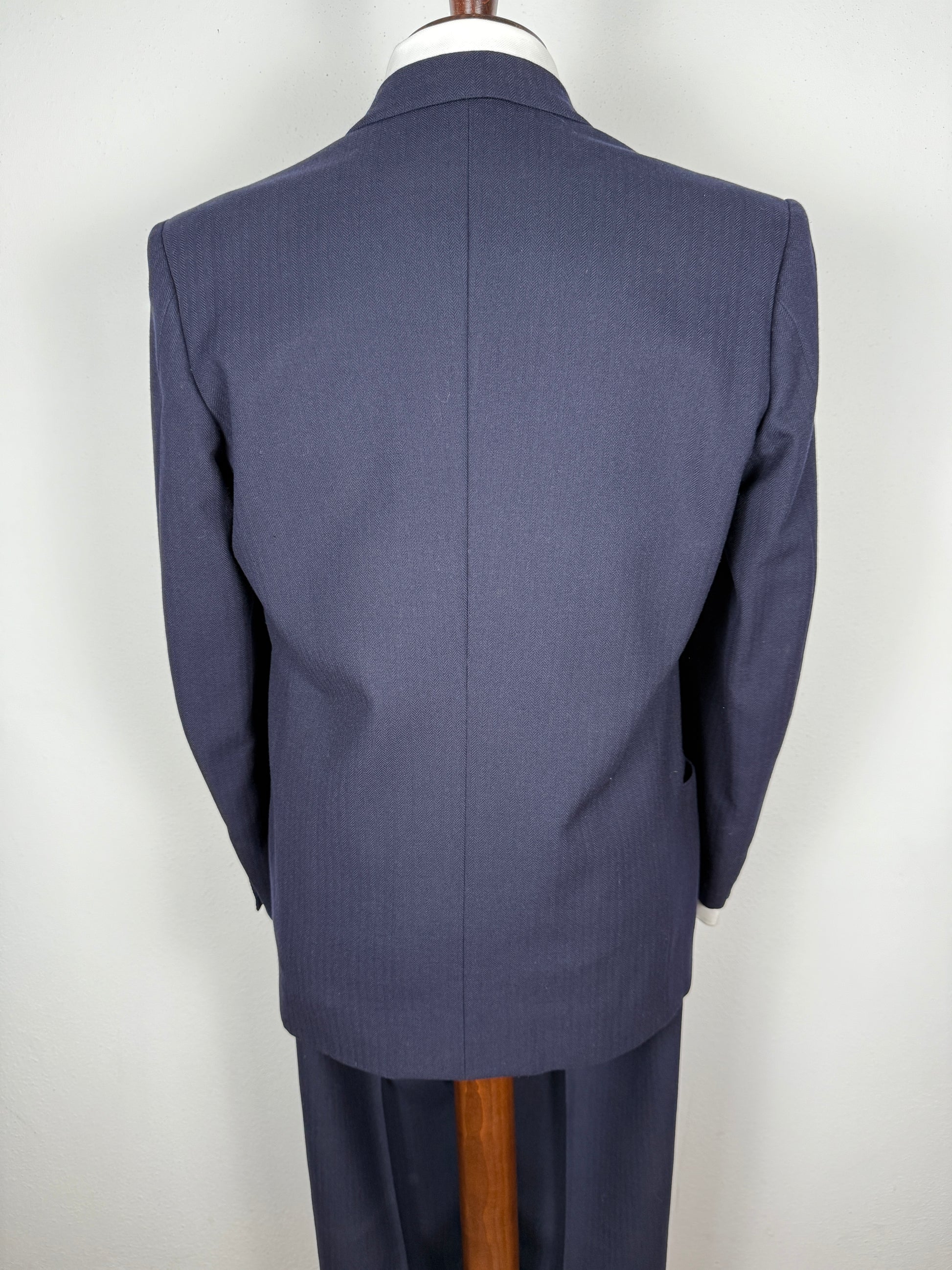 Magnifico abito sartoriale doppiopetto degli anni ‘50/fine ‘40, in pesante lana finemente cardata color blu navy, dalla sottile trama herringbone (spigato).
