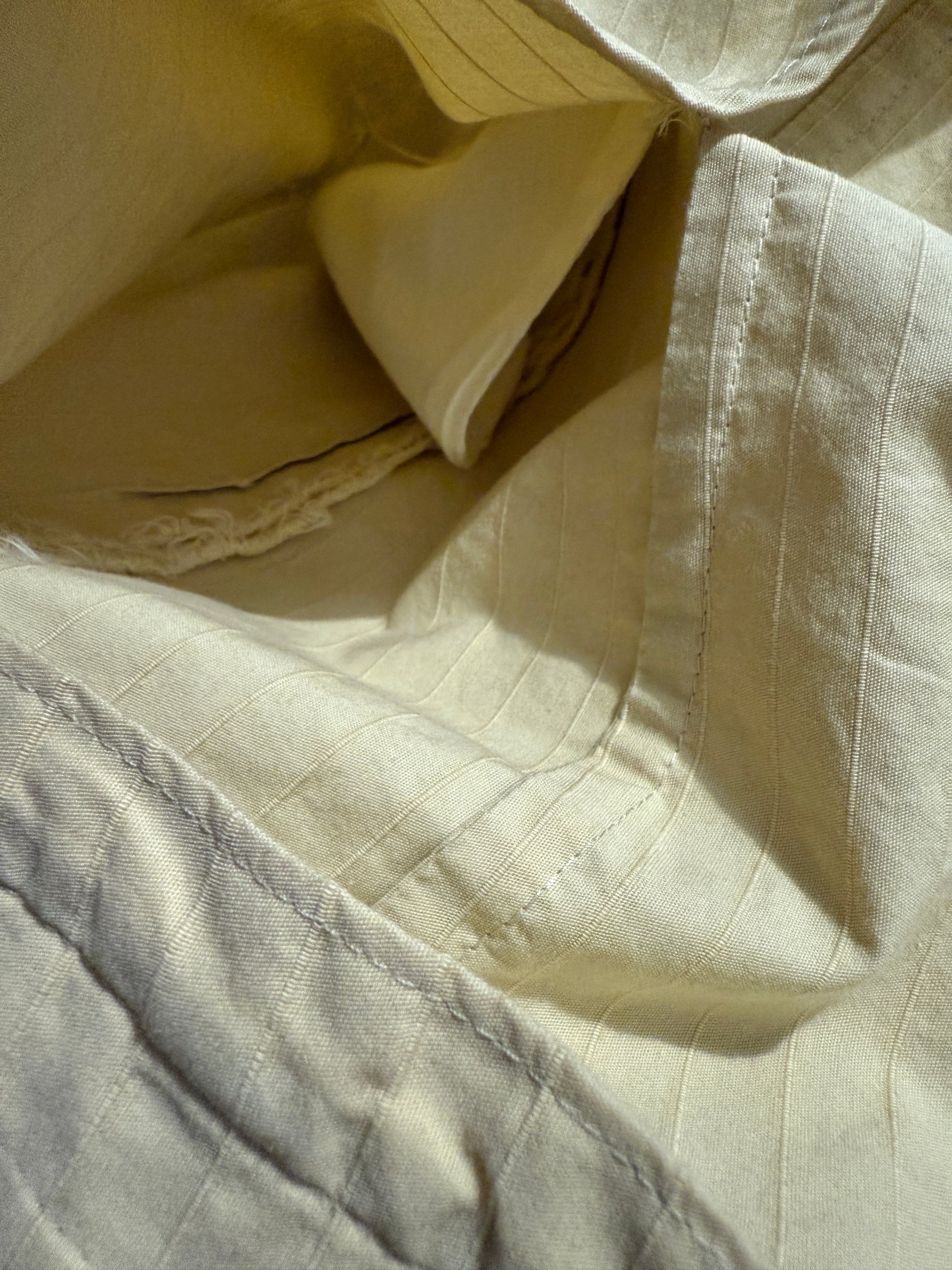 La giacca è completamente sfoderata, senza nessuna fodera e nessun tipo di intelatura interna, con spalla destrutturata e morbida. Risulta quindi leggerissima e traspirante, ottima con il caldo.