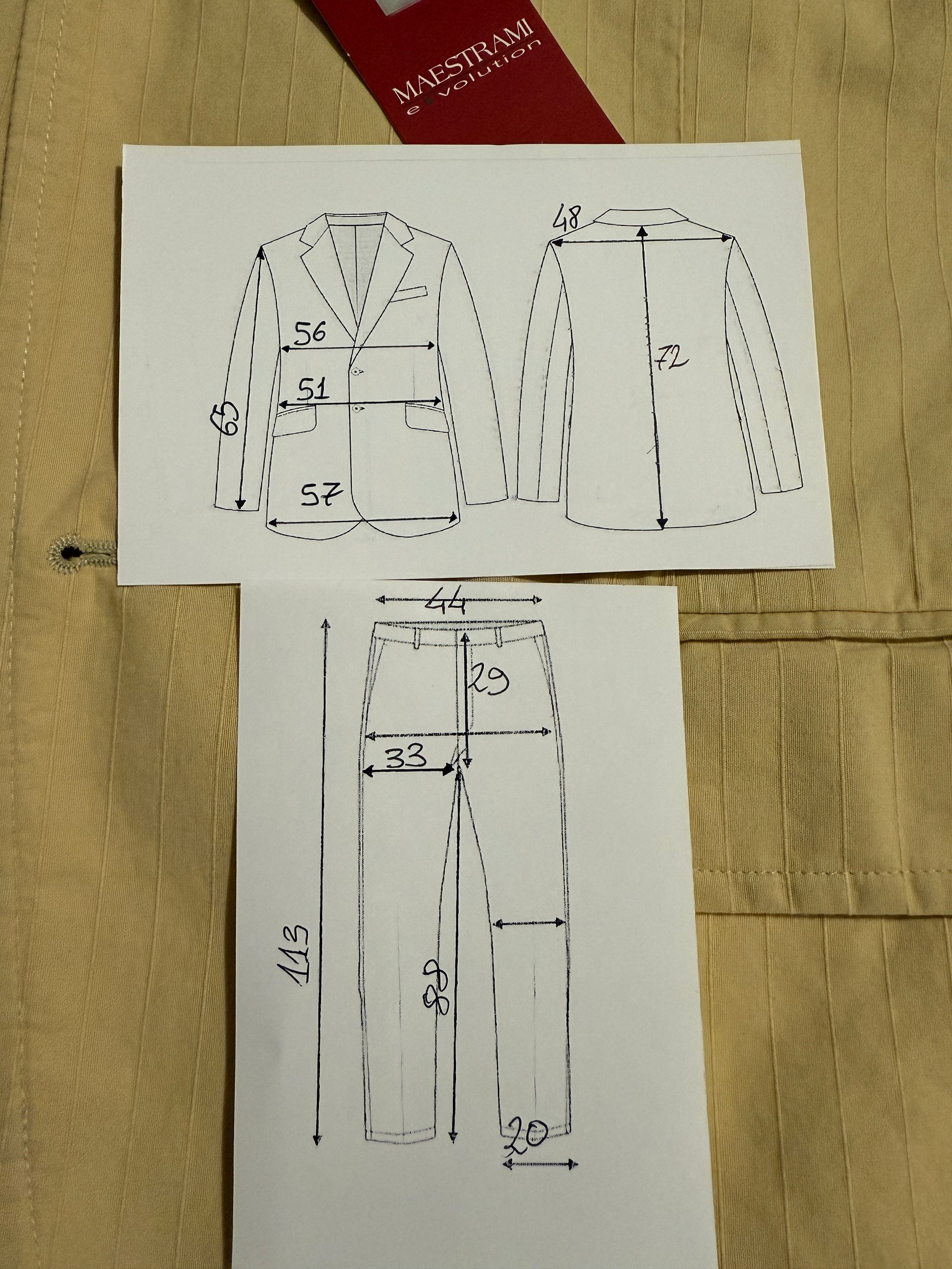 ⚠️ Per un confronto il più utile e accurato possibile, è necessario confrontare le misure solo fra abiti dal taglio simile: ad esempio, un abito dal taglio classico (giacca morbida e pantalone a vita alta) con un altro abito analogo, non con un abito slim fit o con un abito tipo anni '70 dal taglio snello e avvitato (e viceversa).