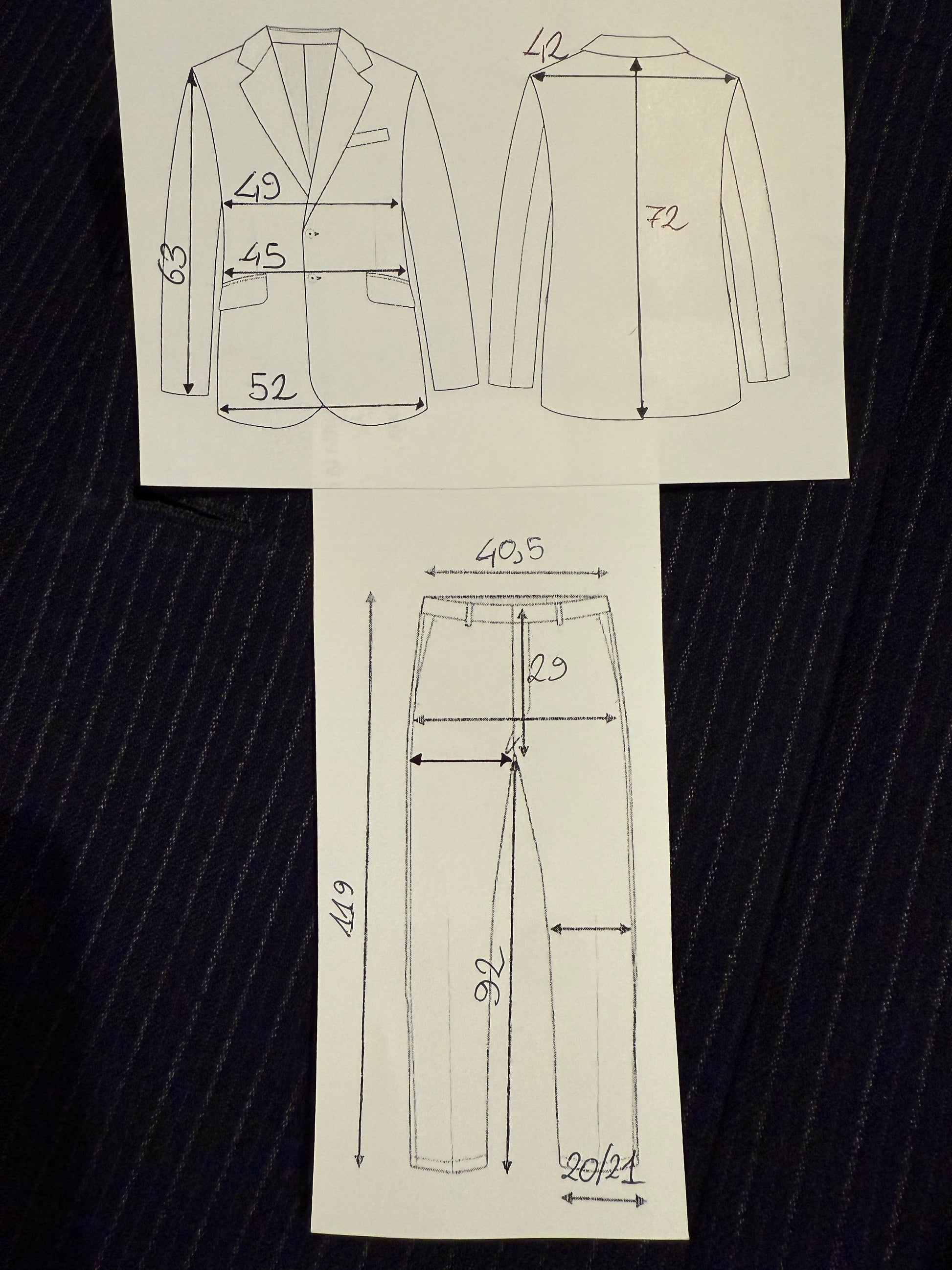 ⚠️ Per un confronto il più utile e accurato possibile, è necessario confrontare le misure solo fra abiti dal taglio simile: ad esempio, un abito dal taglio classico (giacca morbida e pantalone a vita alta) con un altro abito analogo, non con un abito slim fit o con un abito tipo anni '70 dal taglio snello e avvitato (e viceversa).