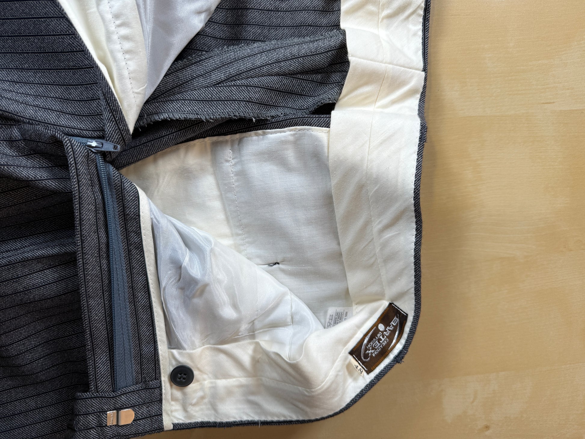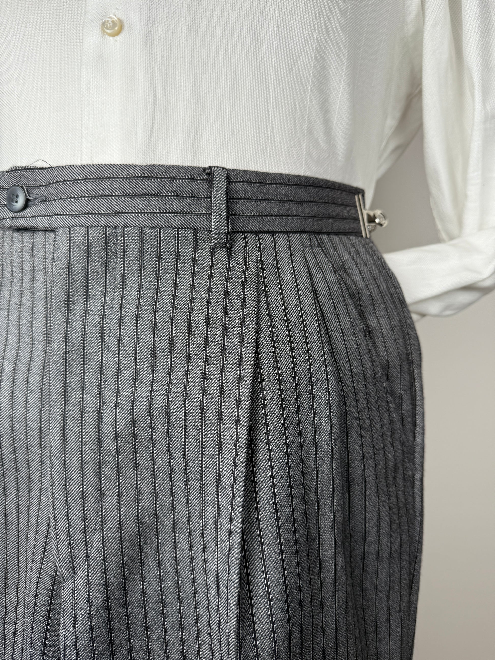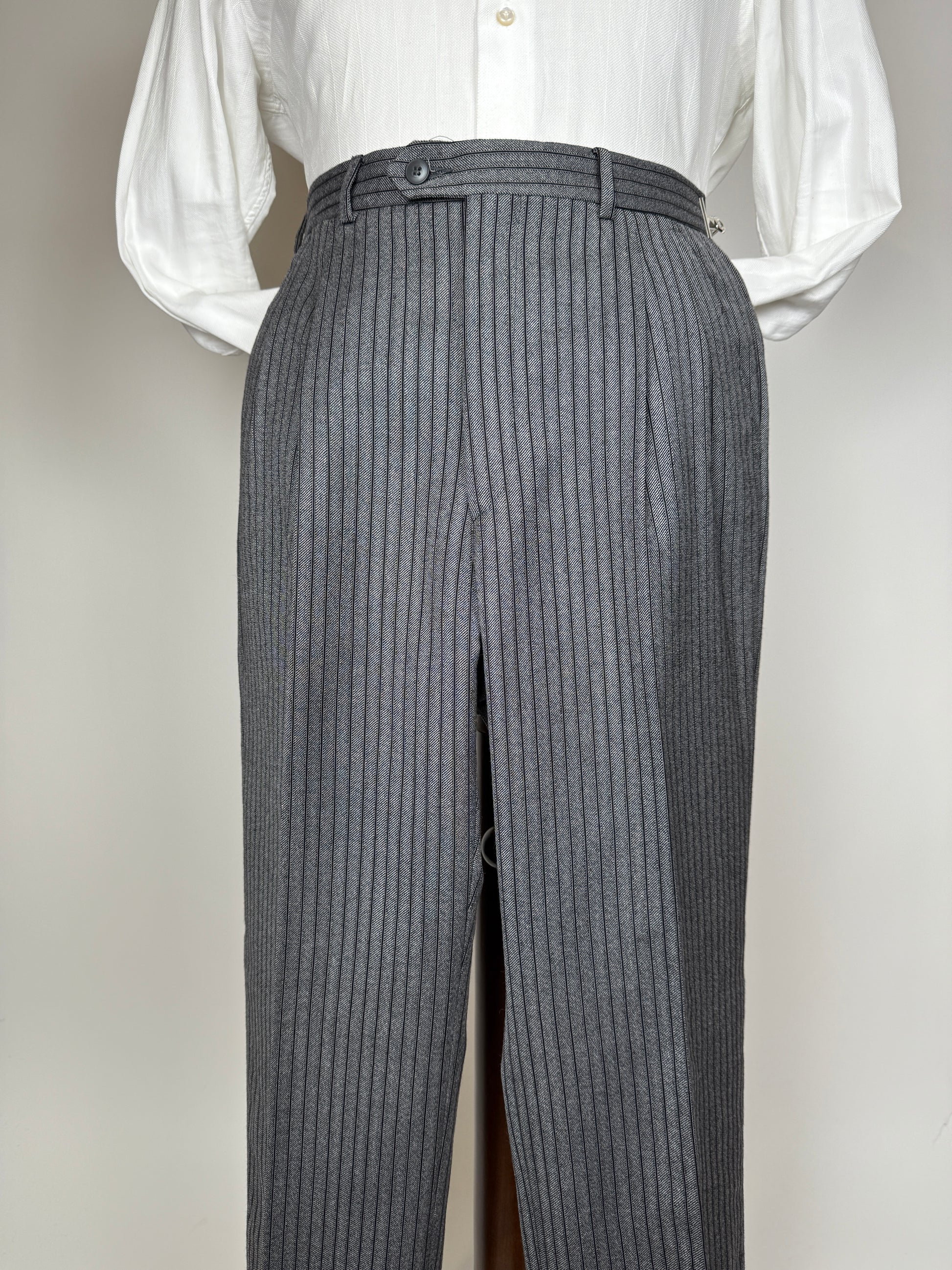 I pantaloni sono in flanella 100% lana, grigio medio a righe nere. Taglio a vita alta con doppie pinces e splendido fondo da 25 cm.