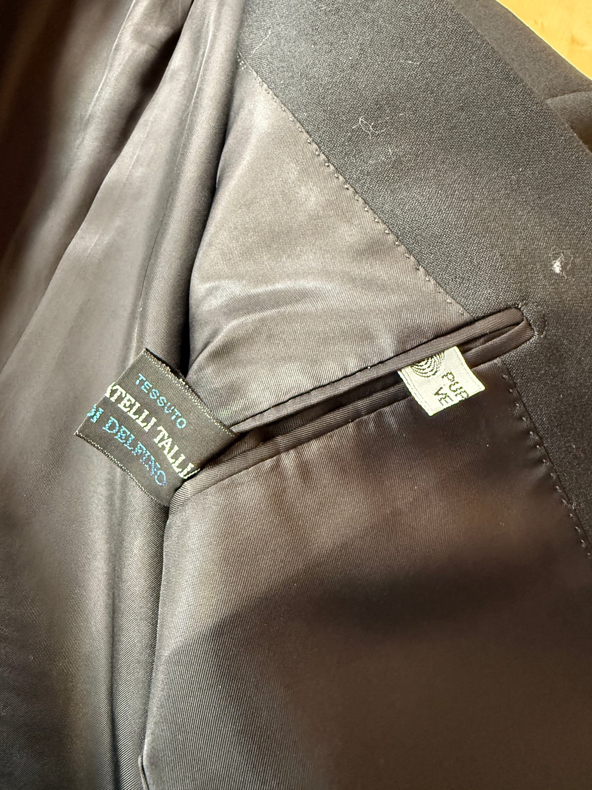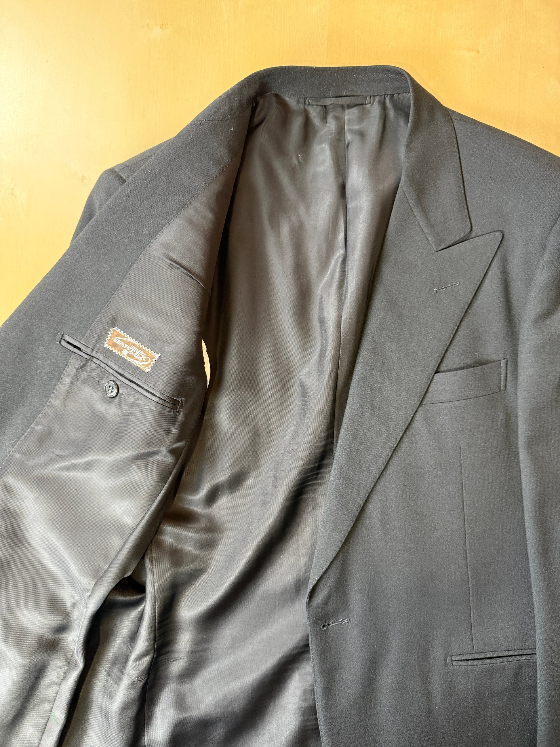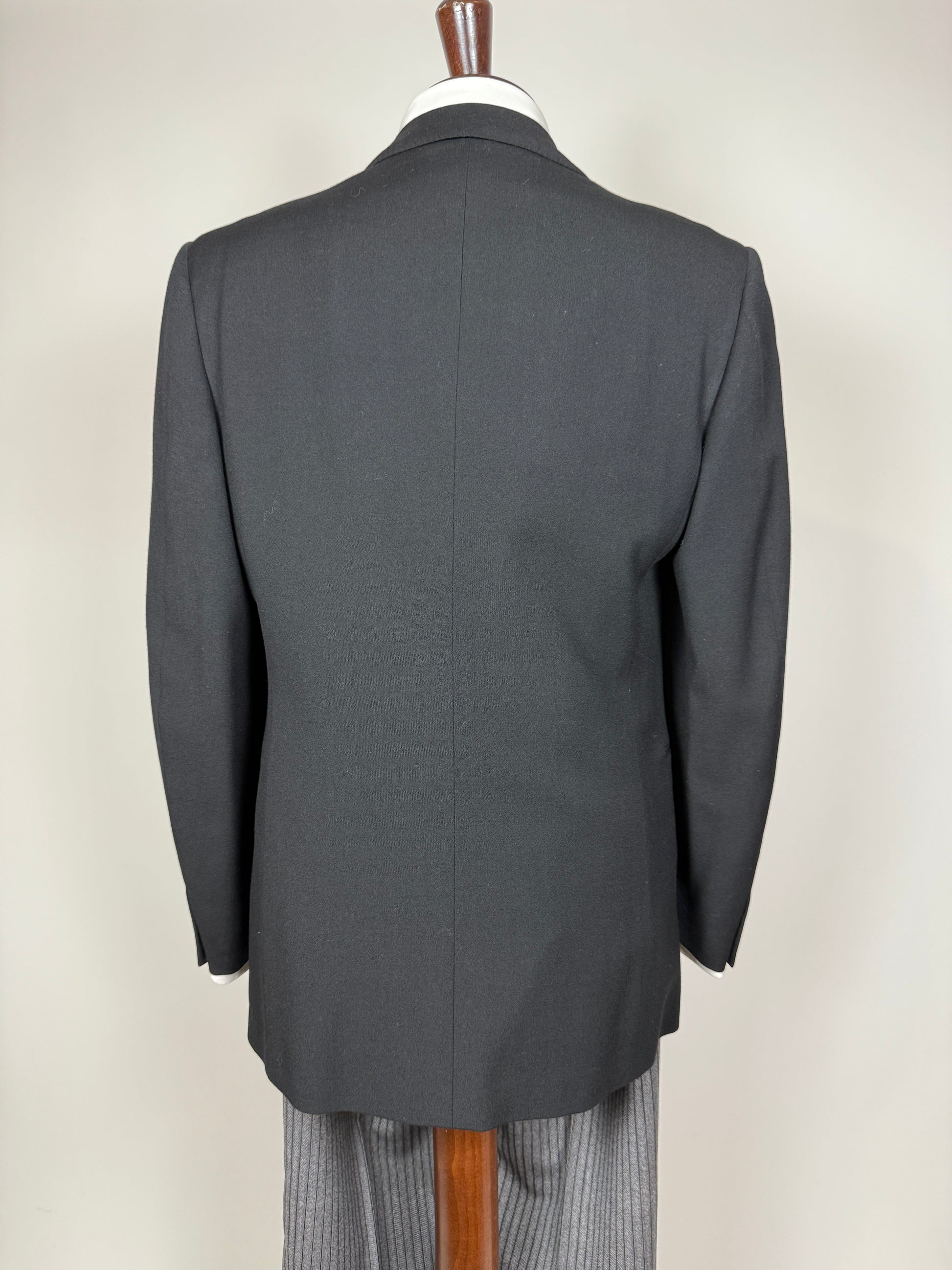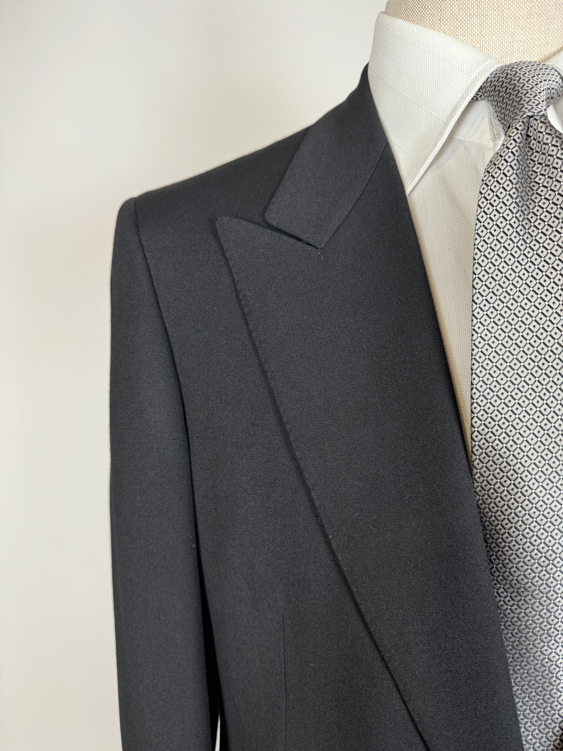 La giacca è in barathea 100% lana di colore nero, dal tipico taglio monopetto con revers a lancia e bottone singolo, tasche a filetto e senza spacchi. Abbottonatura a baricentro basso in pieno stile anni ‘80, che slancia molto la figura.