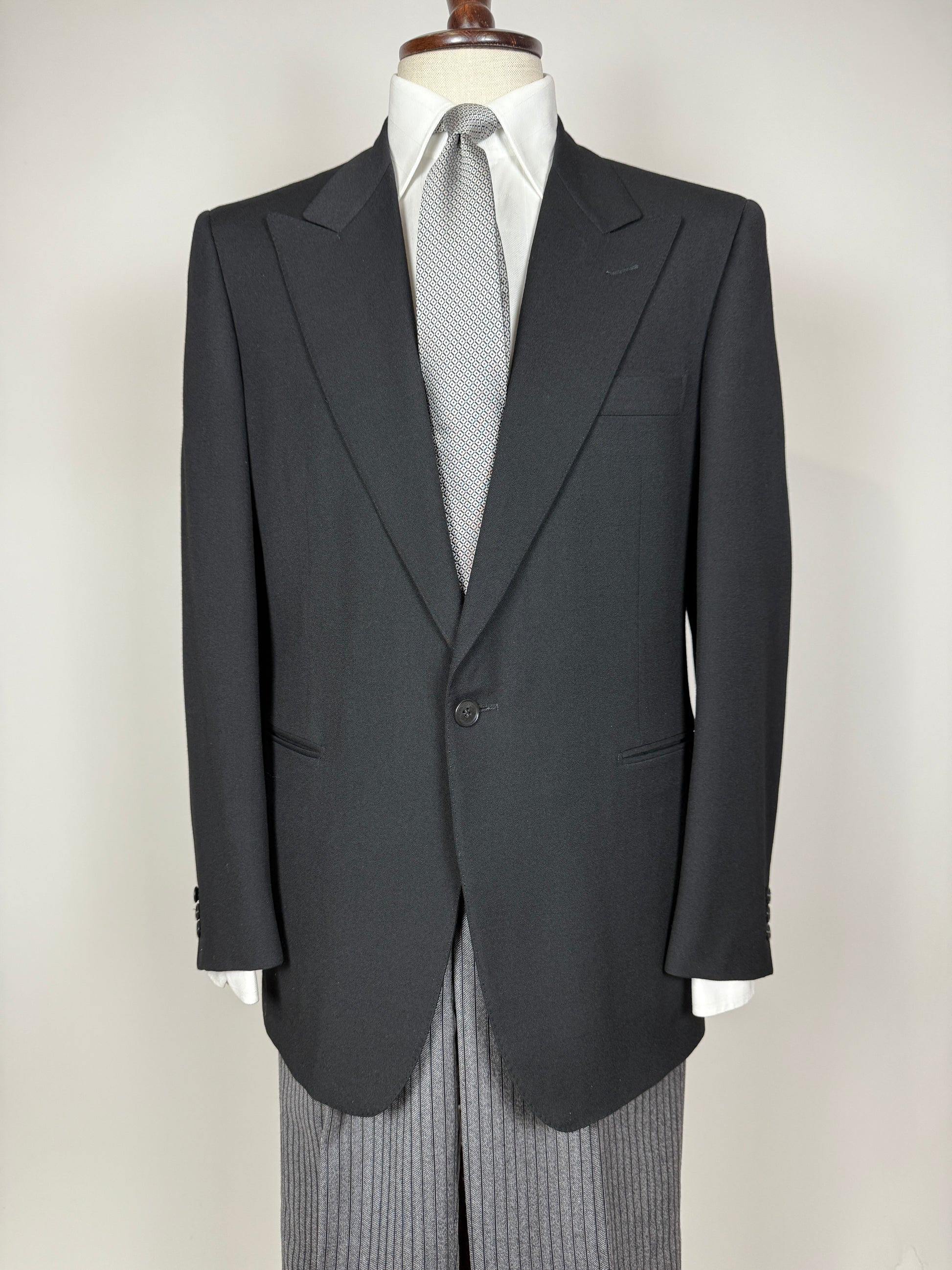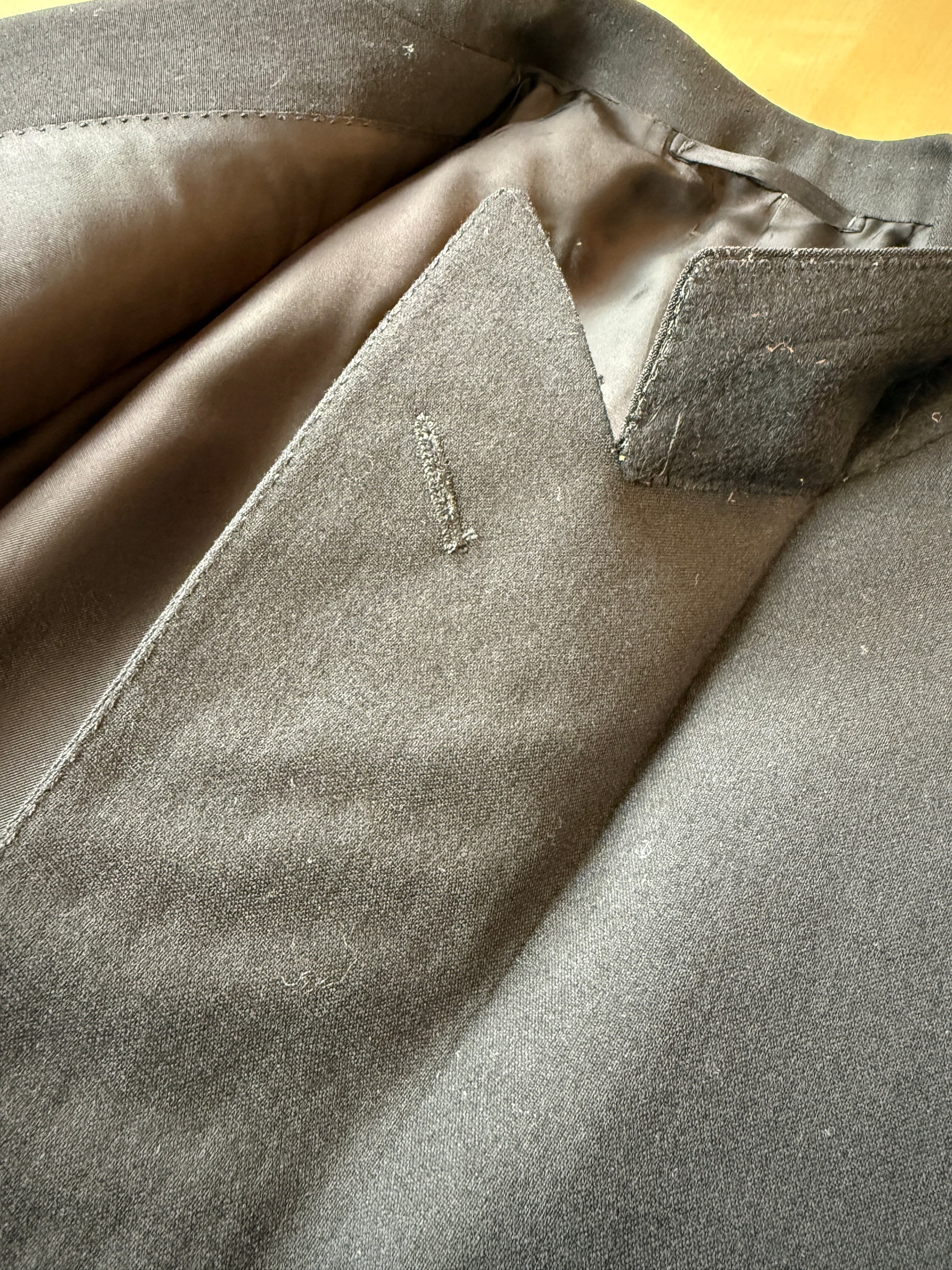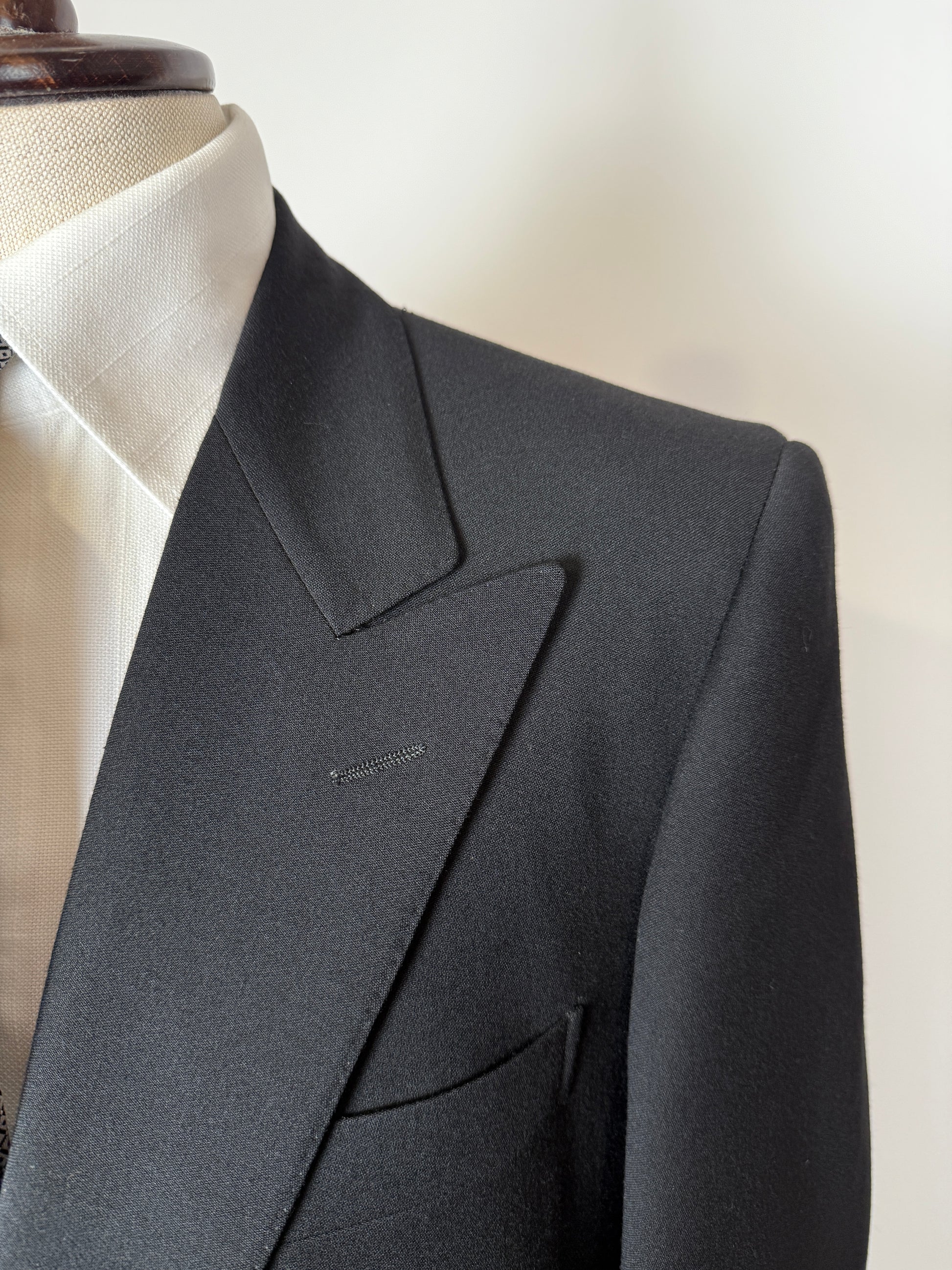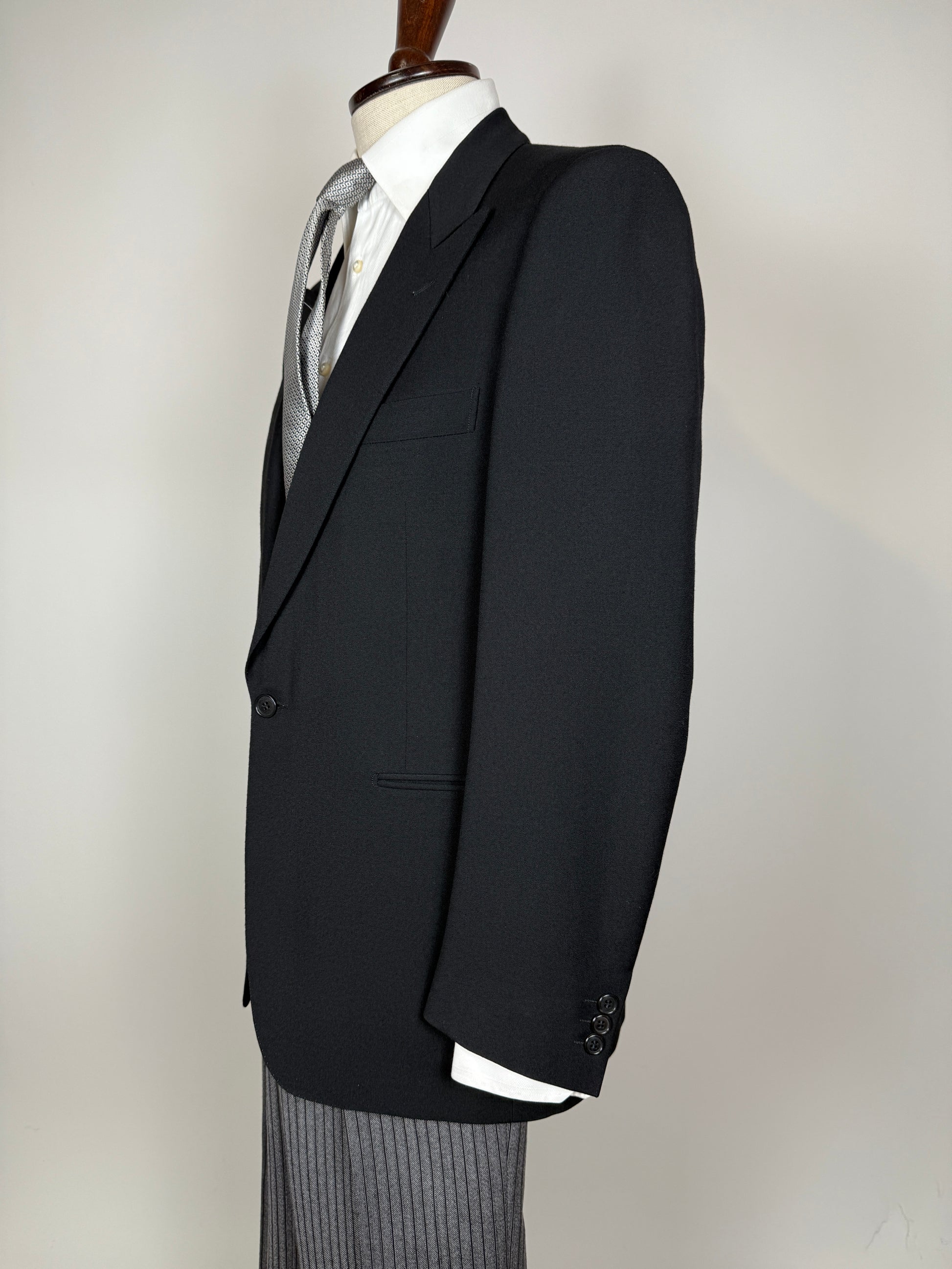 La giacca è in barathea 100% lana di colore nero, dal tipico taglio monopetto con revers a lancia e bottone singolo, tasche a filetto e senza spacchi. Abbottonatura a baricentro basso in pieno stile anni ‘80, che slancia molto la figura.