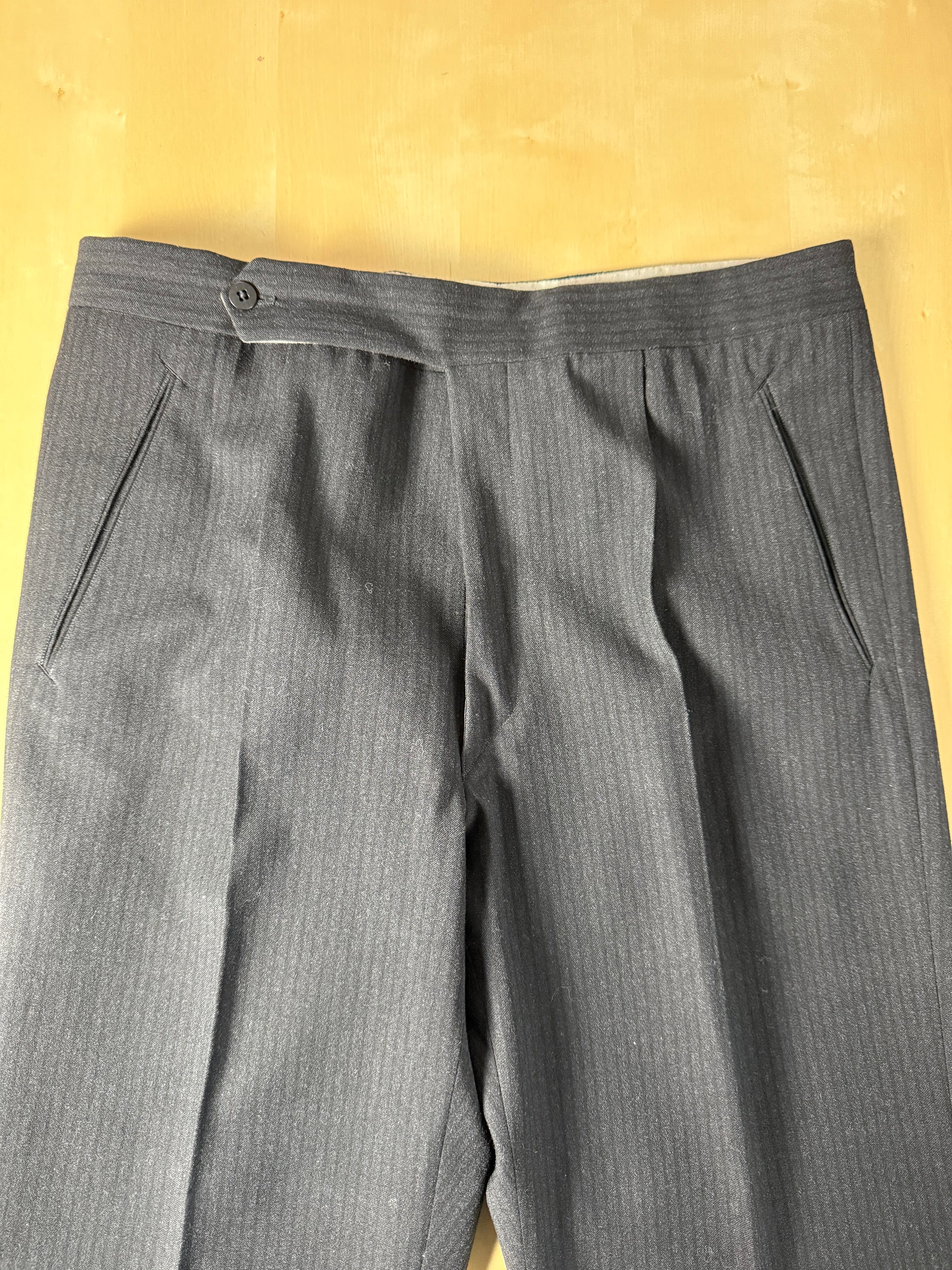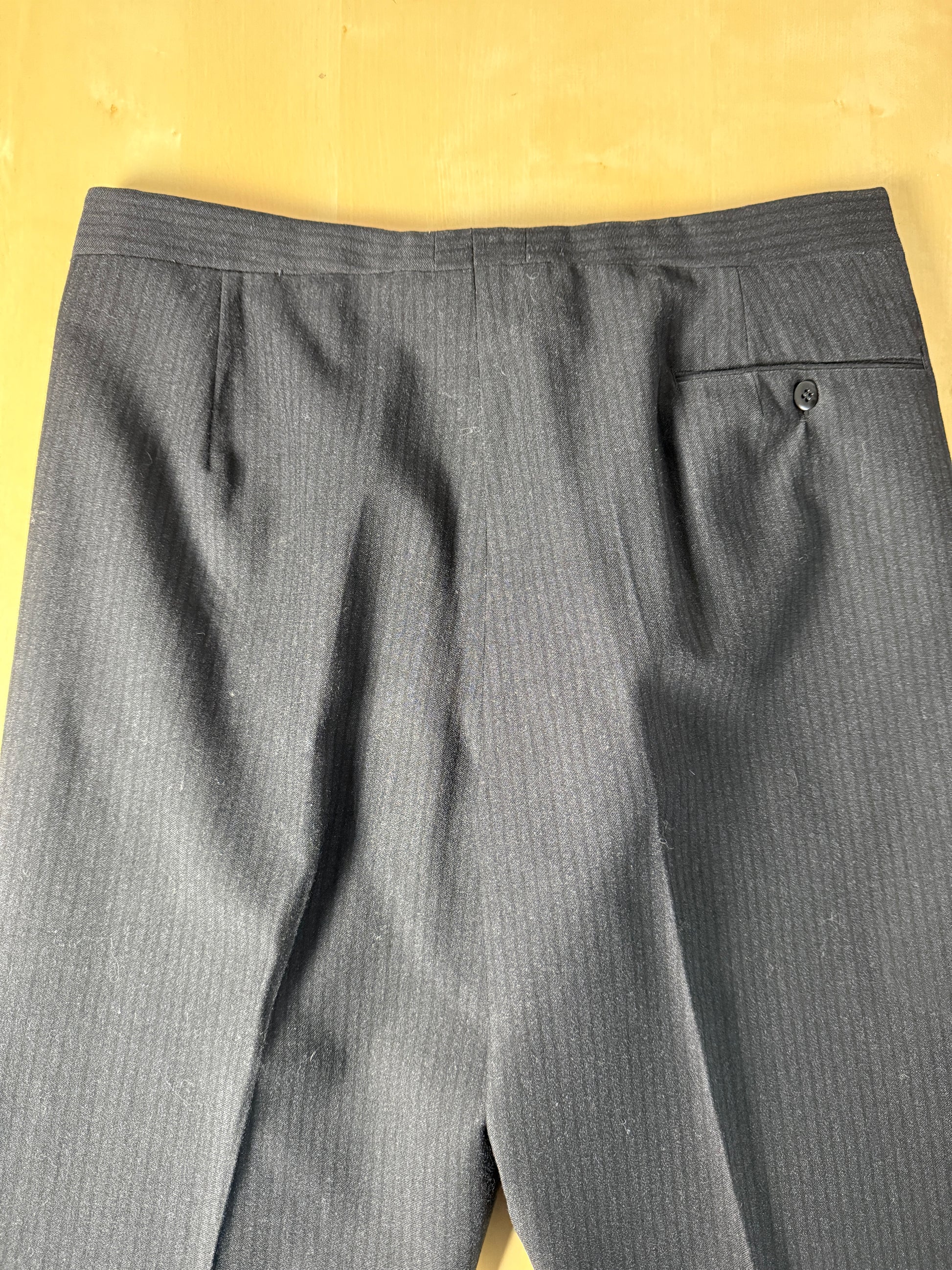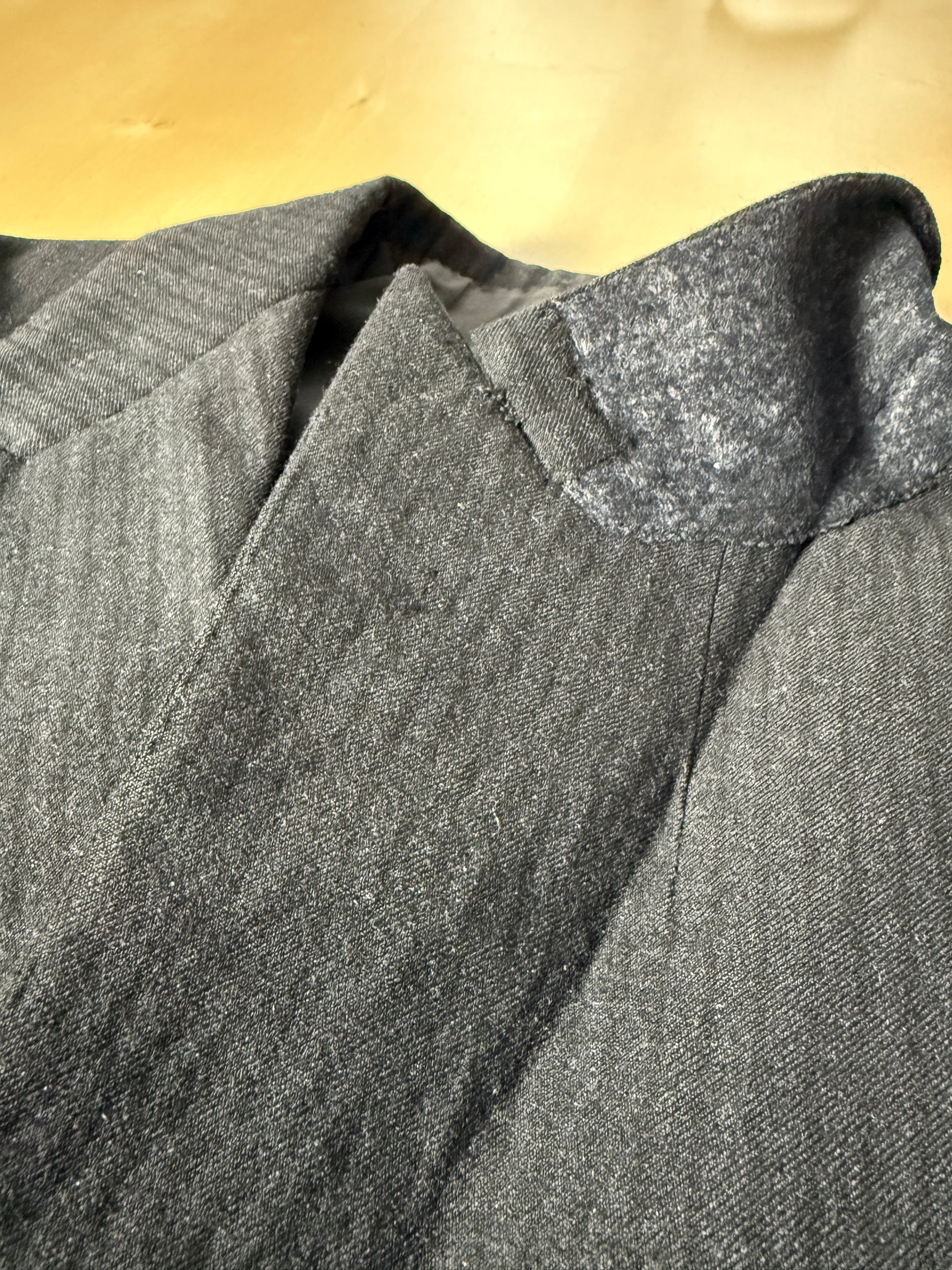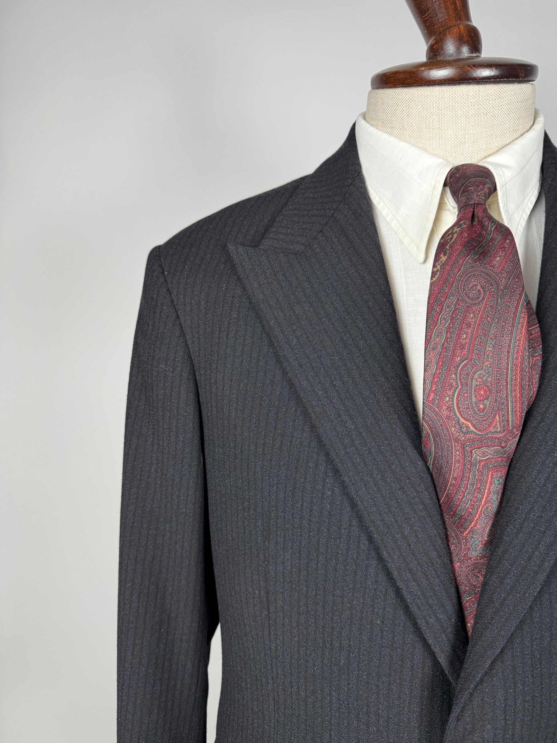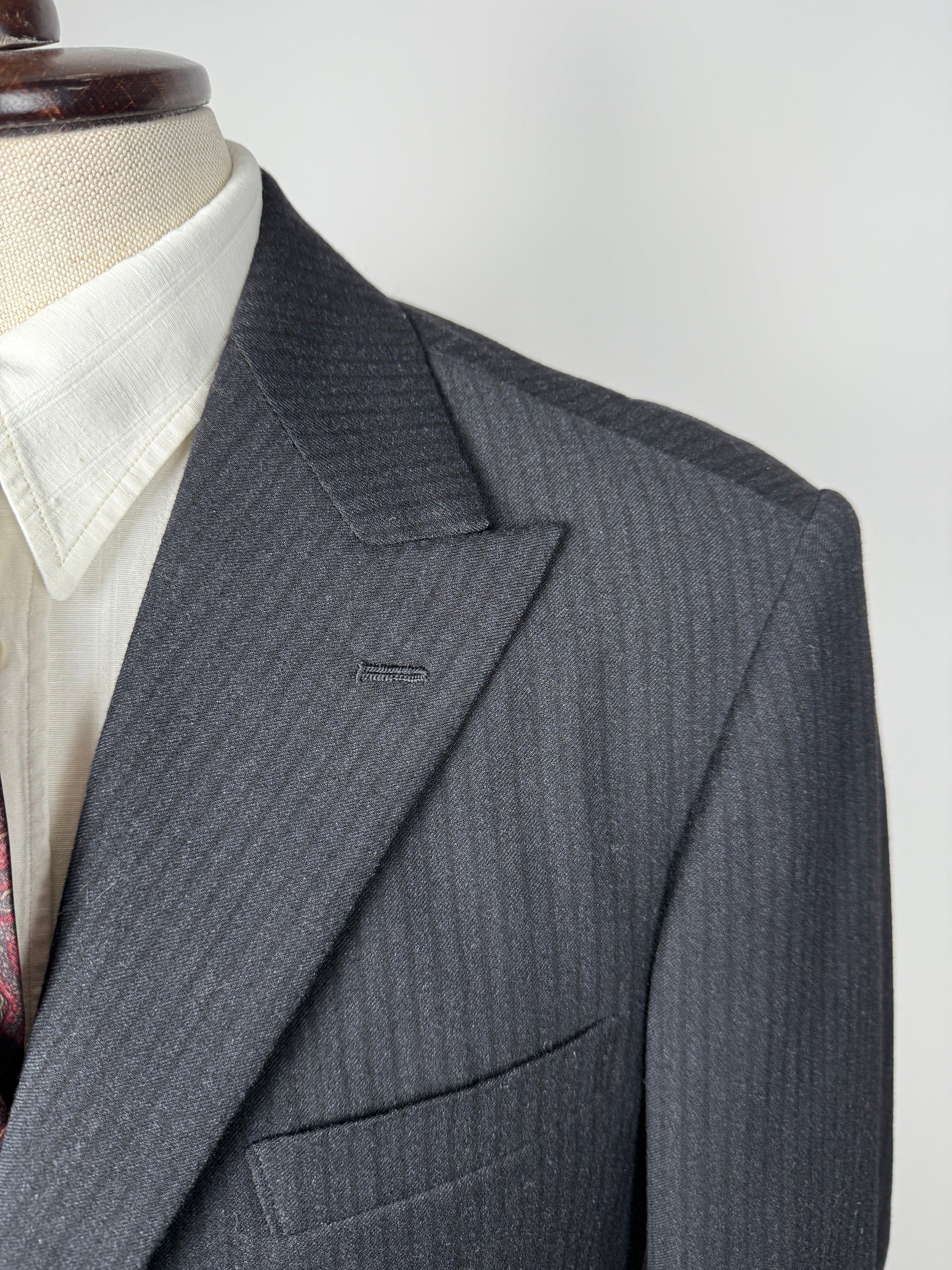 Il tessuto è una lana pettinata di peso invernale piuttosto sostenuto, colore grigio antracite molto scuro con fantasia a riga tono su tono.