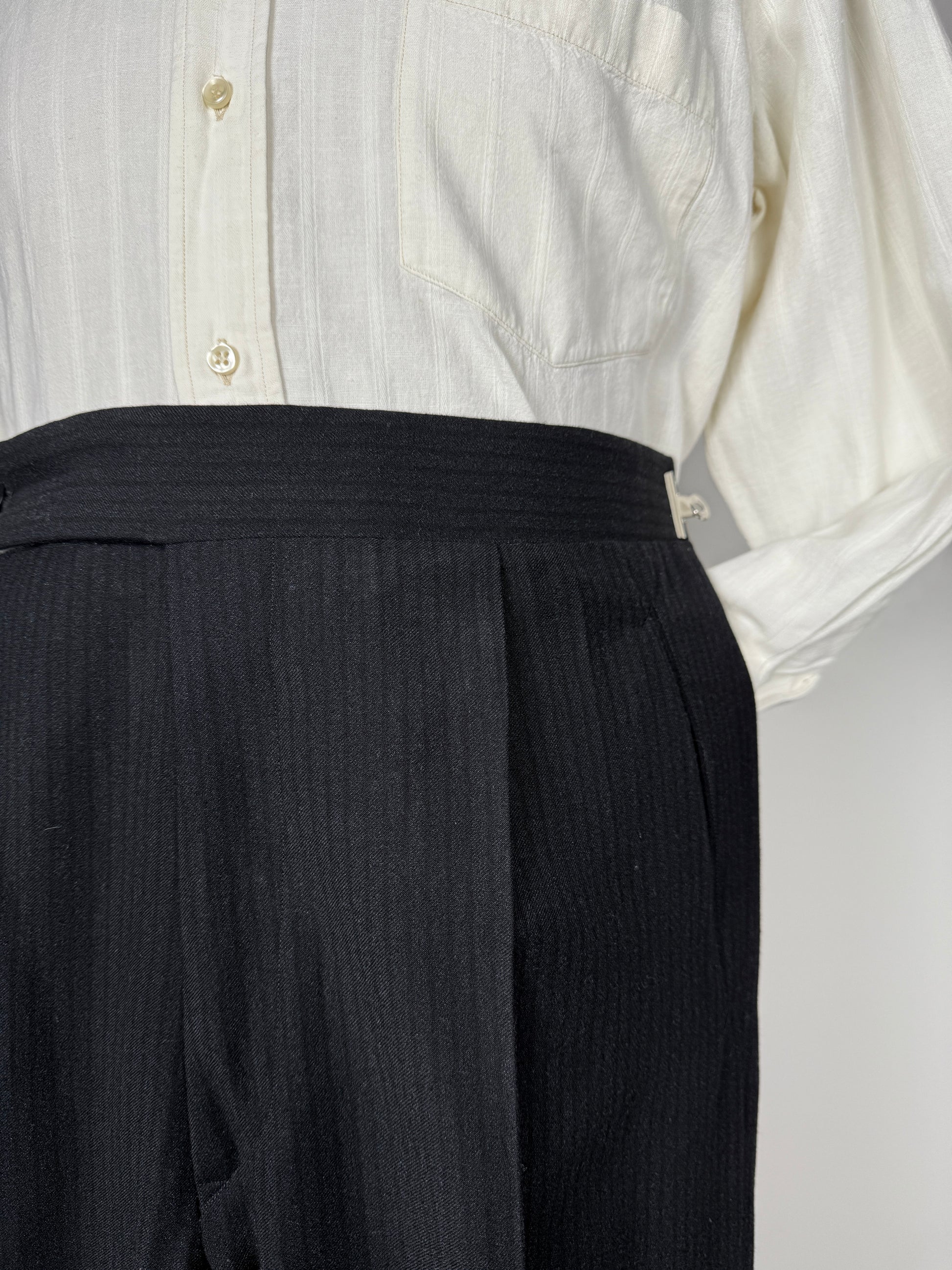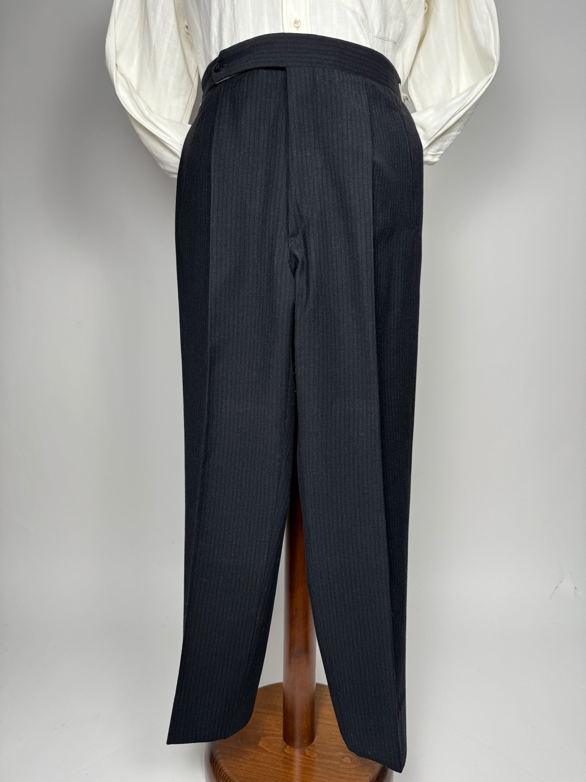 Pantaloni a vita alta, con pince singola, cintura senza passanti con chiusura prolungata, gamba ampia con tipico fondo leggermente rastremato da 22 cm.