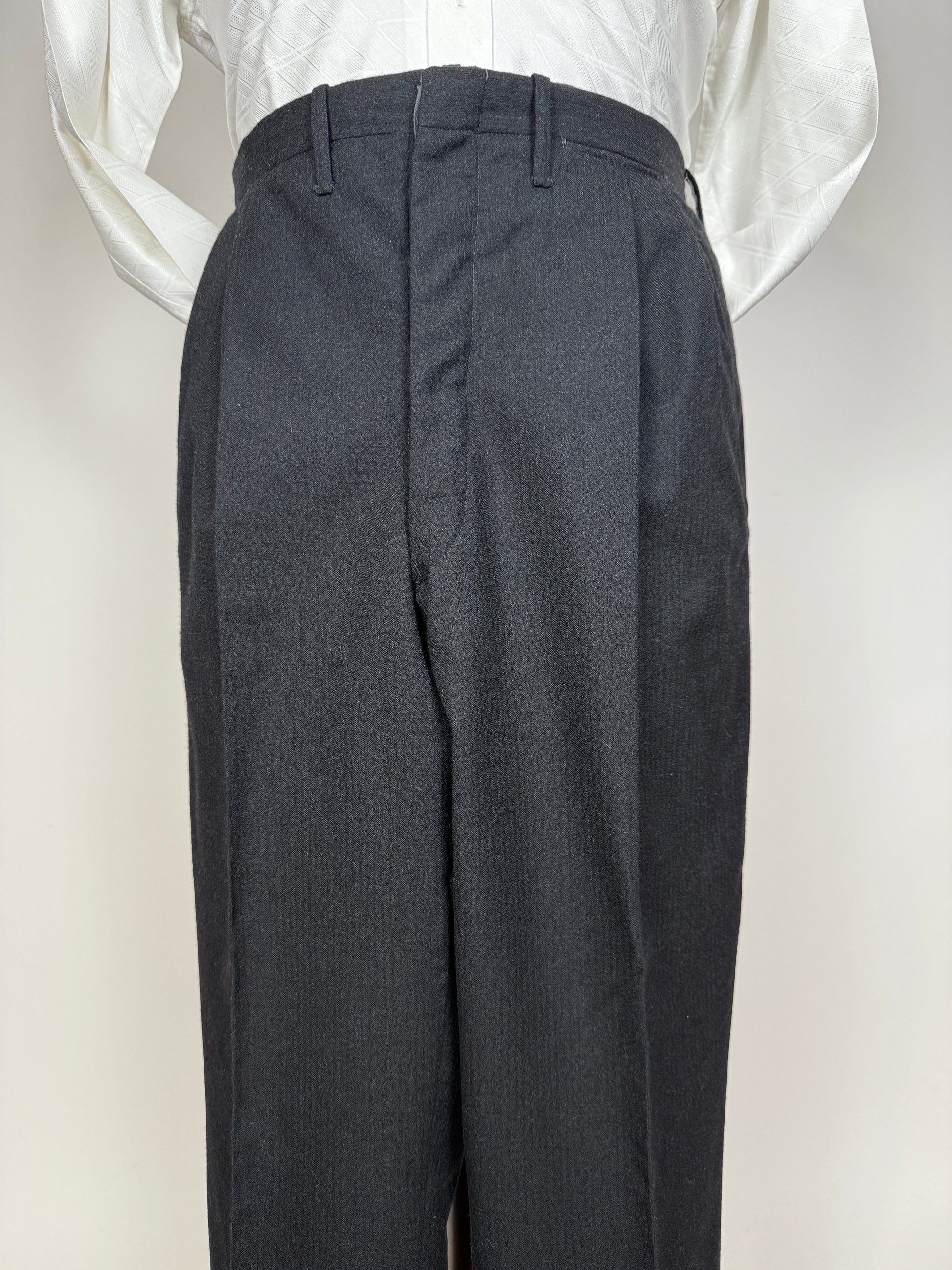 Pantaloni a vita alta, doppie pinces, chiusura centrata e patta a bottoni, fondo da 23-24 cm.