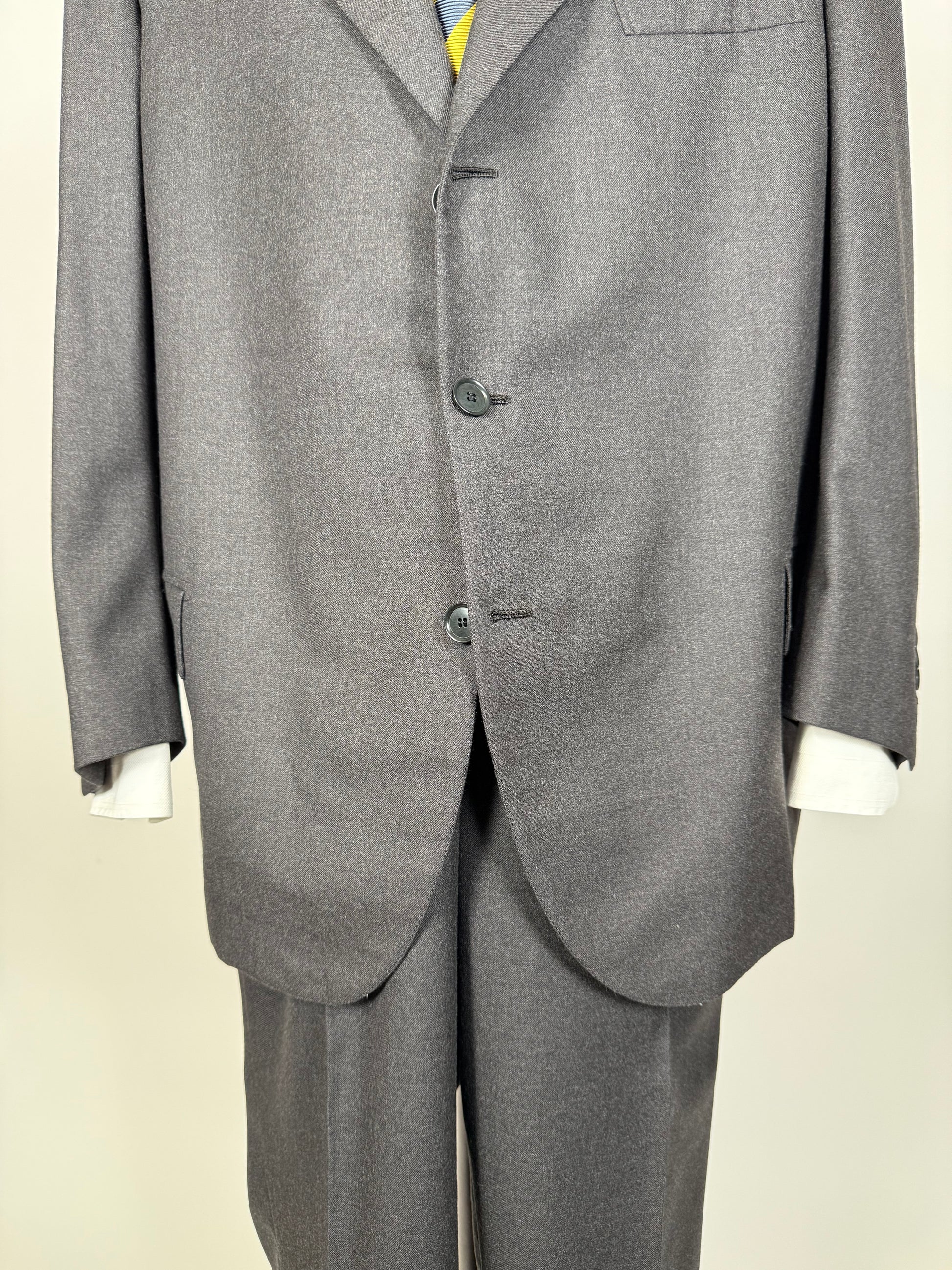 Un sobrio abito da giorno e da ufficio, confezionato con una flanella 100% lana super 100S inglese, dalla mano piuttosto pettinata e dalla grammatura media.