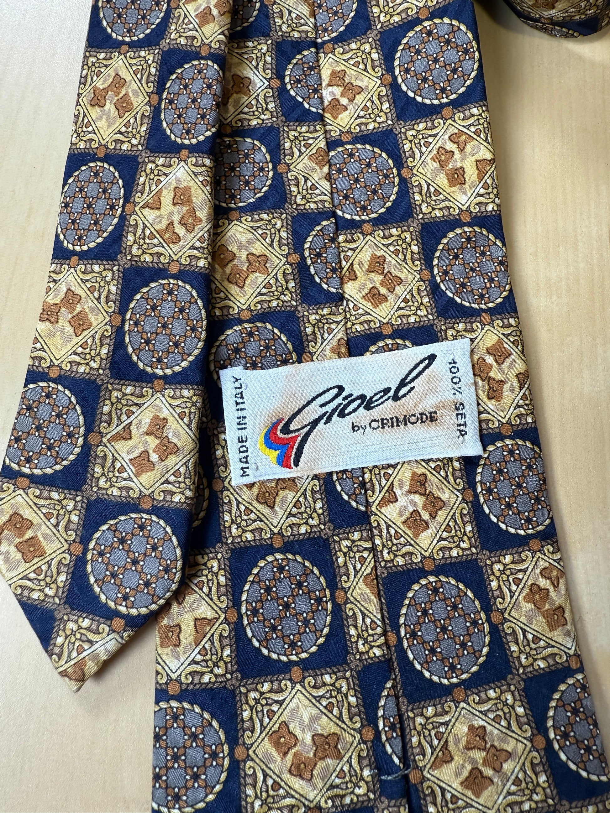 Cravatta vintage anni ‘80 con bellissima fantasia a quadri oro e medaglioni blu, 100% seta con lavorazione jacquard.