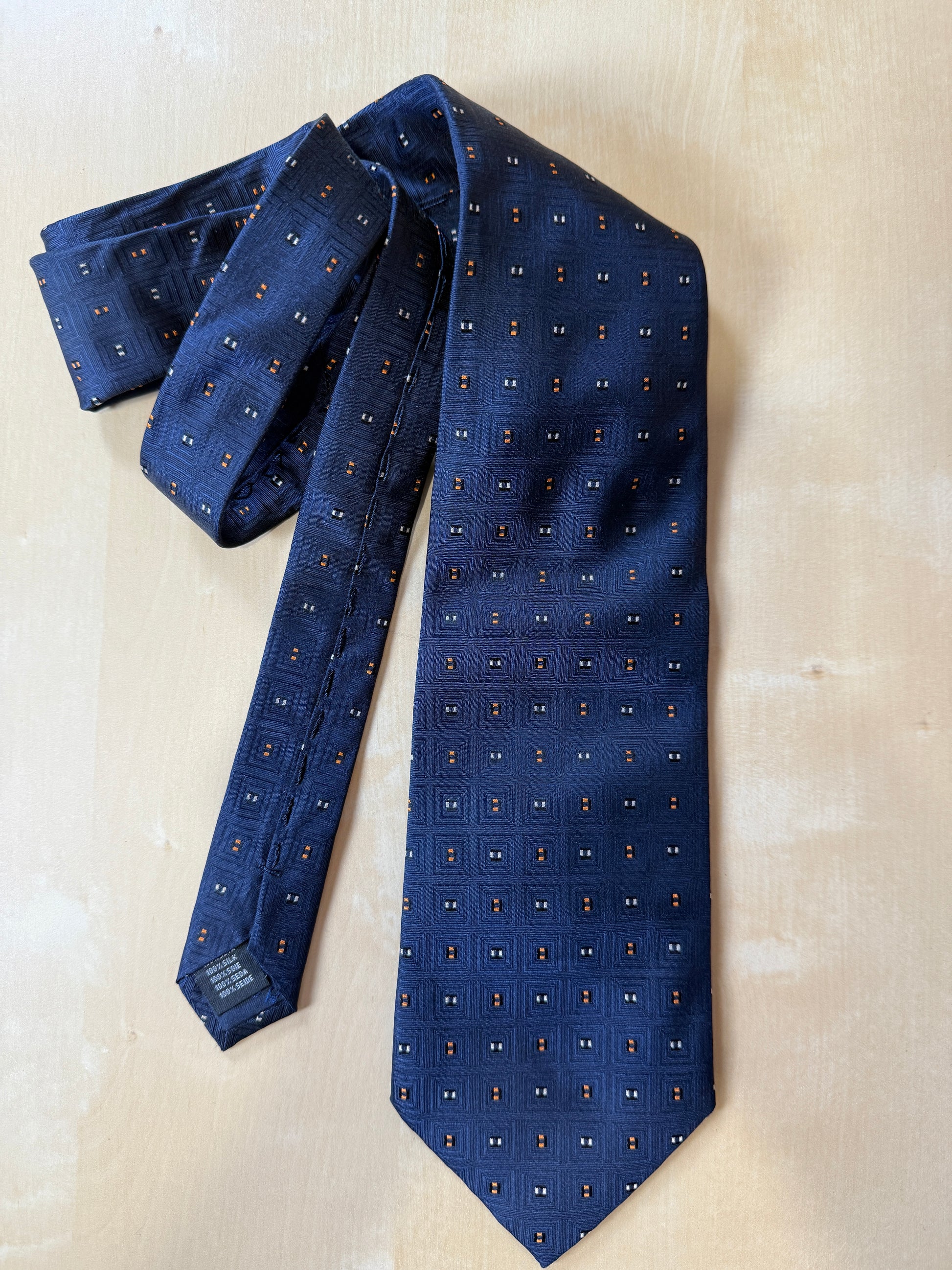 Cravatta in pura seta colore blu notte, con micro fantasia a quadri arancioni e lavorazione jacquard.