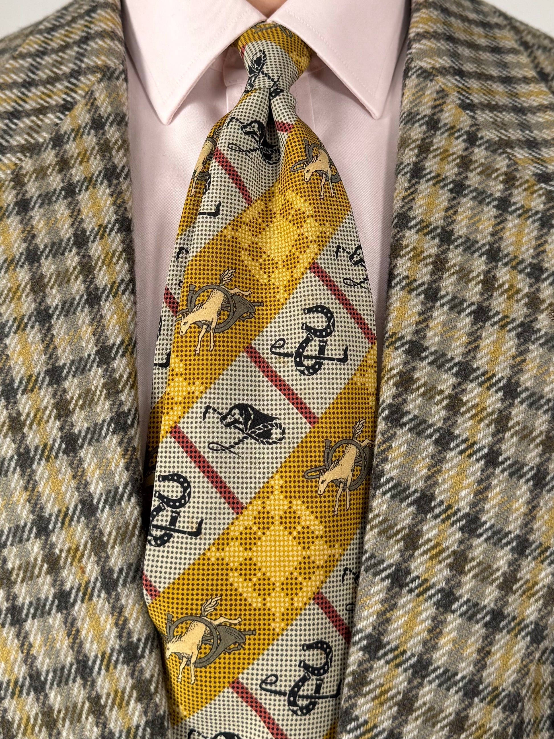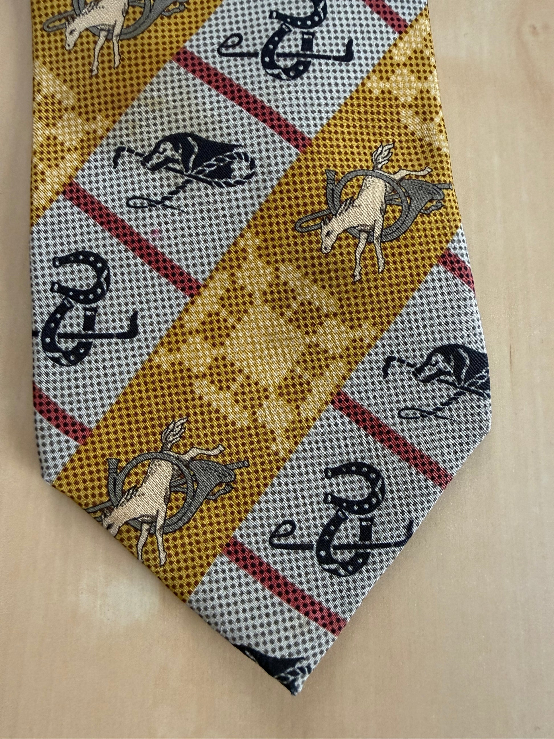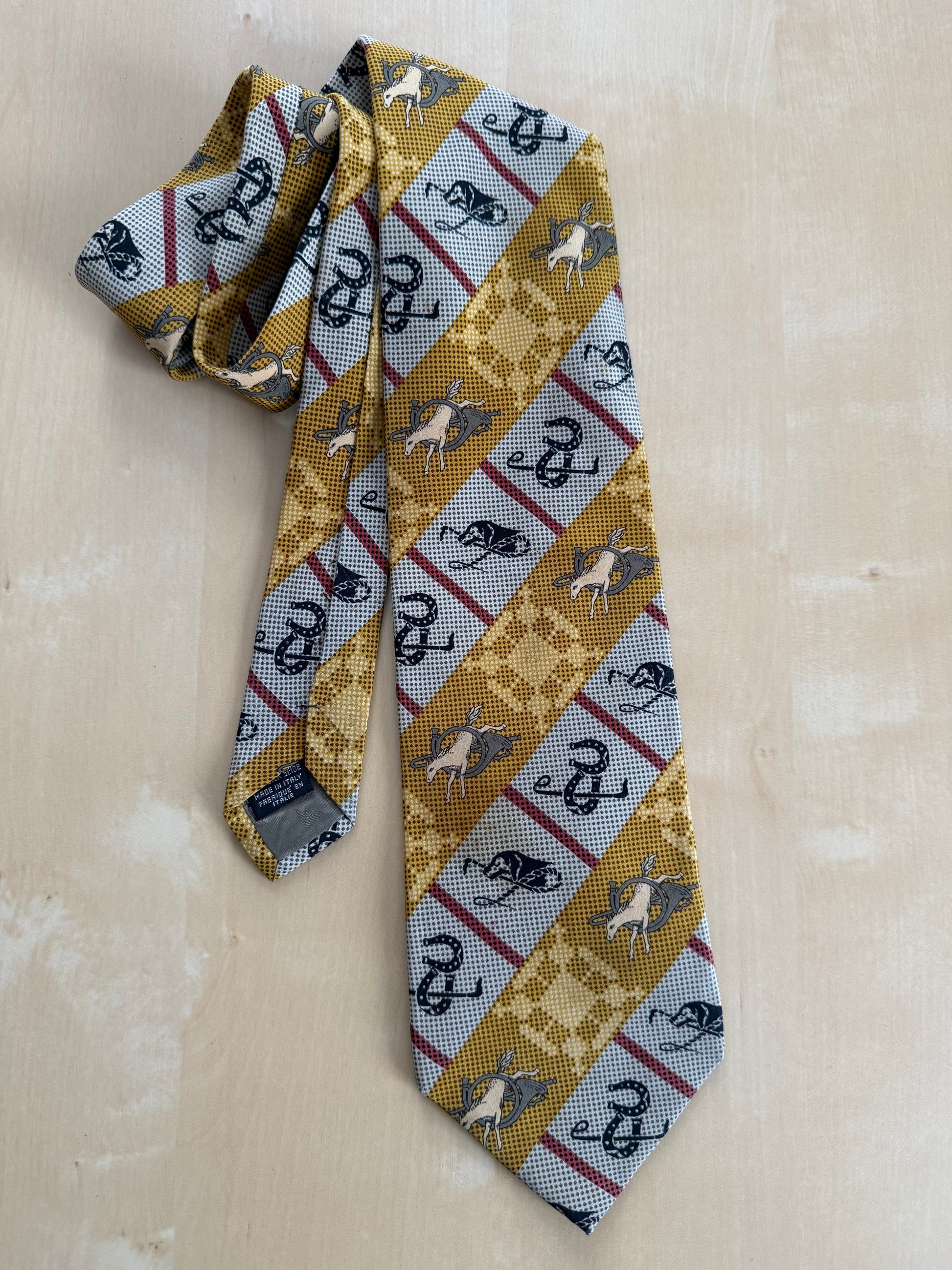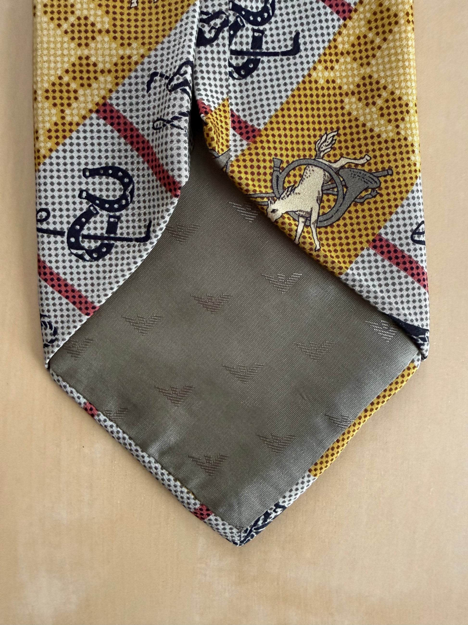 Cravatta Emporio Armani vintage anni ‘80, in crêpe 100% seta con stampa a fantasia equestre (cavalli, corni da caccia, ferri di cavallo) su bande diagonali giallo e grigio.