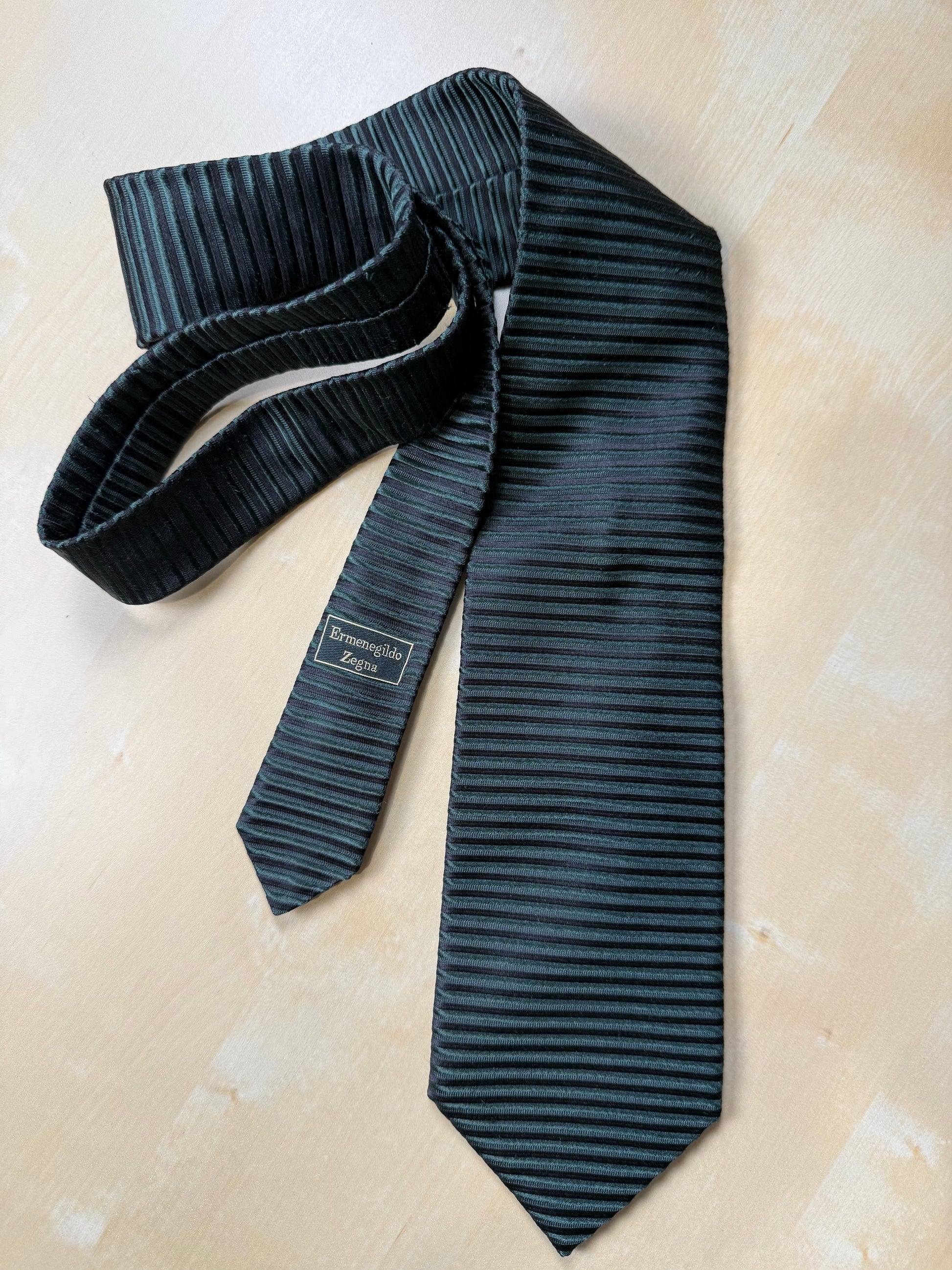 Cravatta Ermenegildo Zegna in 100% seta, con lavorazione cannettata a coste ampie orizzontali, in colore verde scuro e nero.