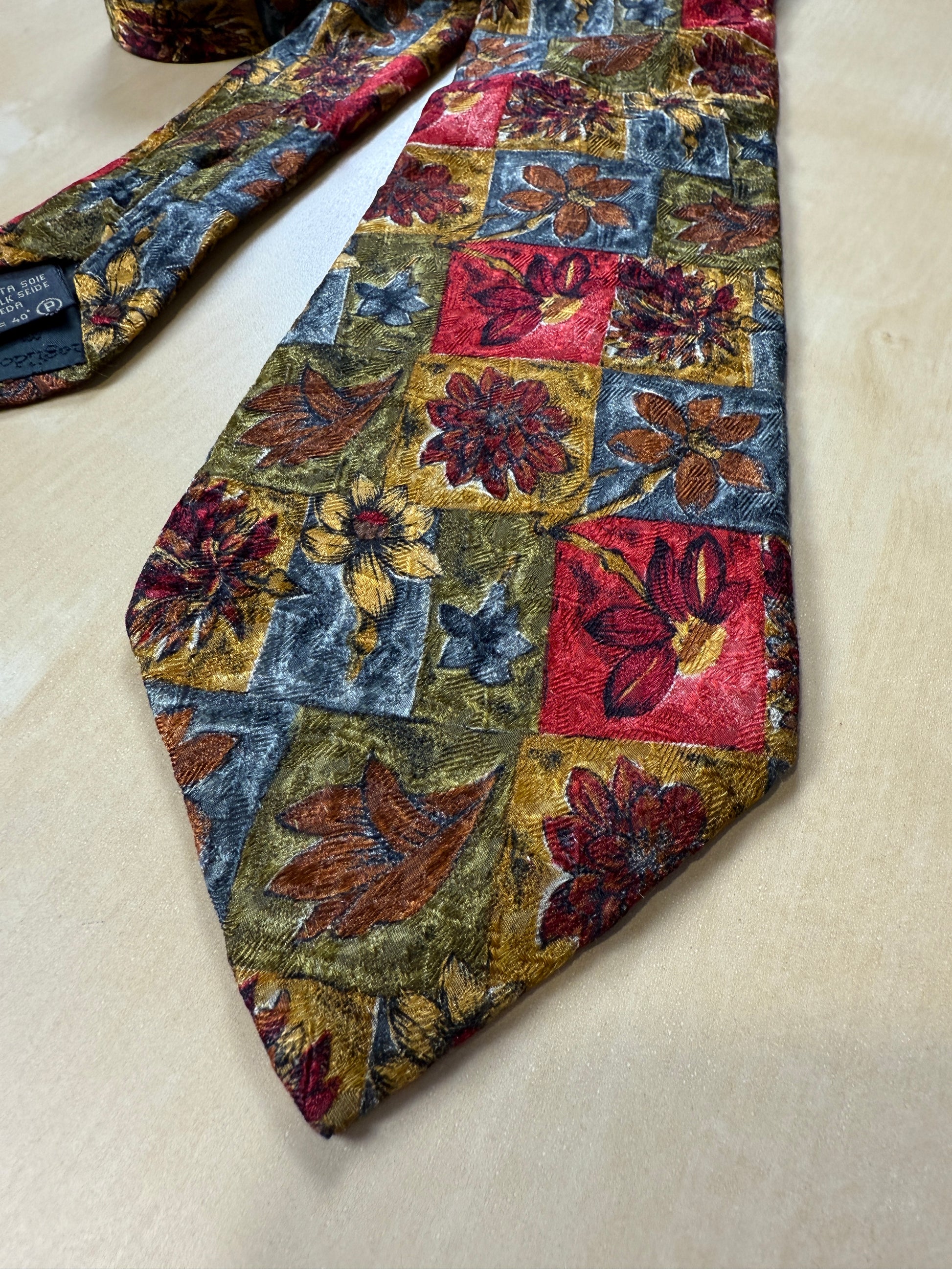 Stupenda cravatta Ermenegildo Zegna in pura seta morbidissima lavorata a jacquard, con stampa pittorica floreale dentro quadri multicolore (rosso, giallo, blu, verde).