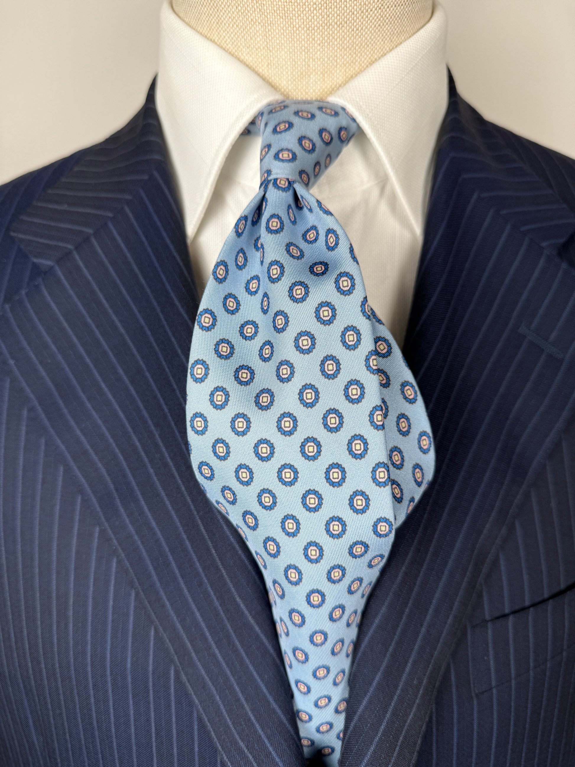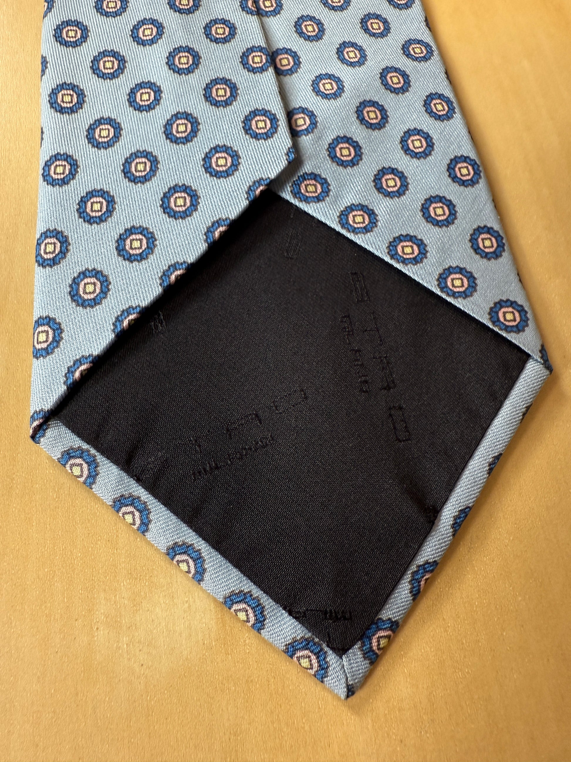 Cravatta Etro in twill di pura seta, colore celeste con piccoli medaglioni azzurri e blu.