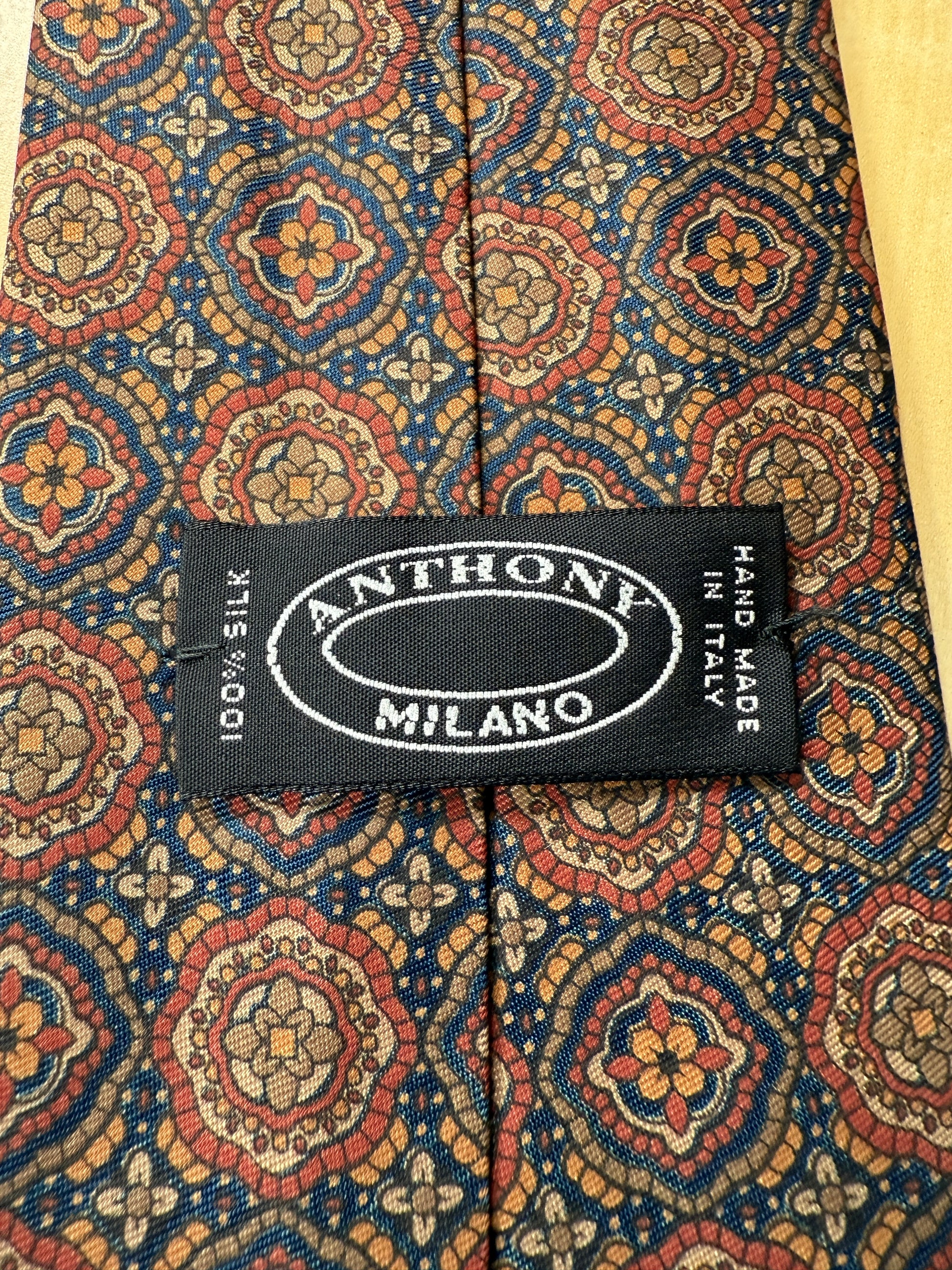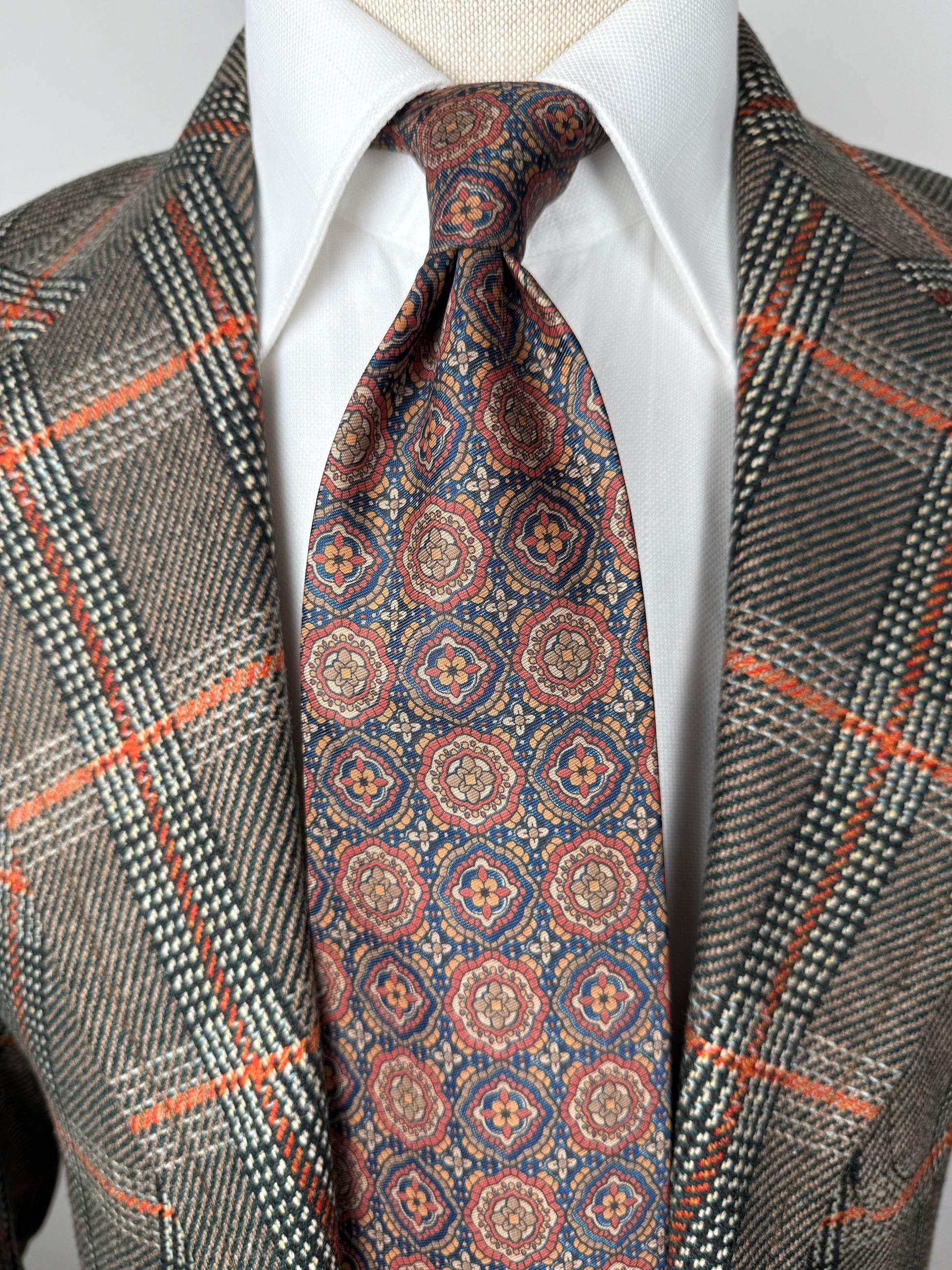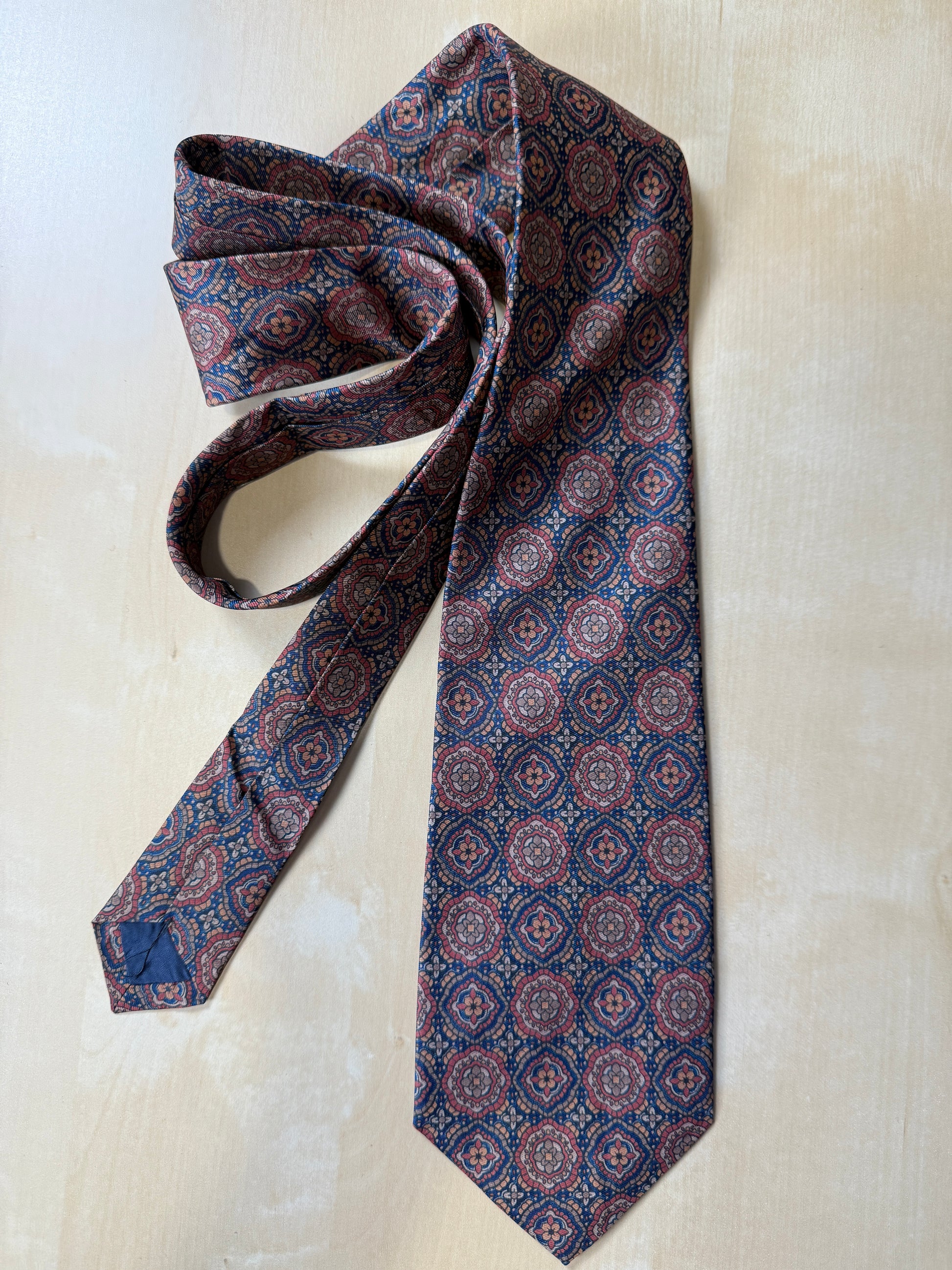 Cravatta in pura seta con splendida fantasia geometrica a medaglioni mandala, nei toni del marrone, cachi, ruggine.