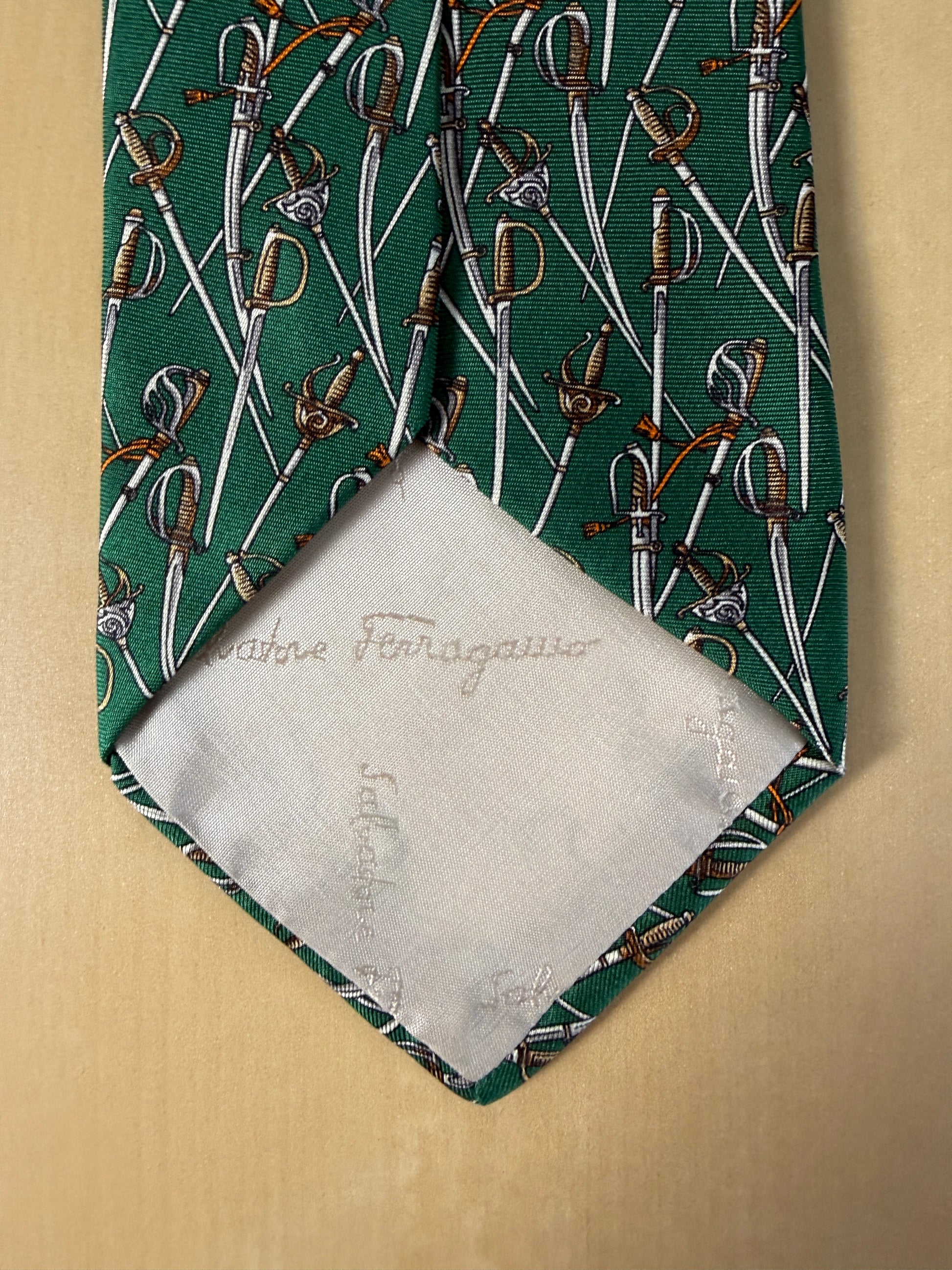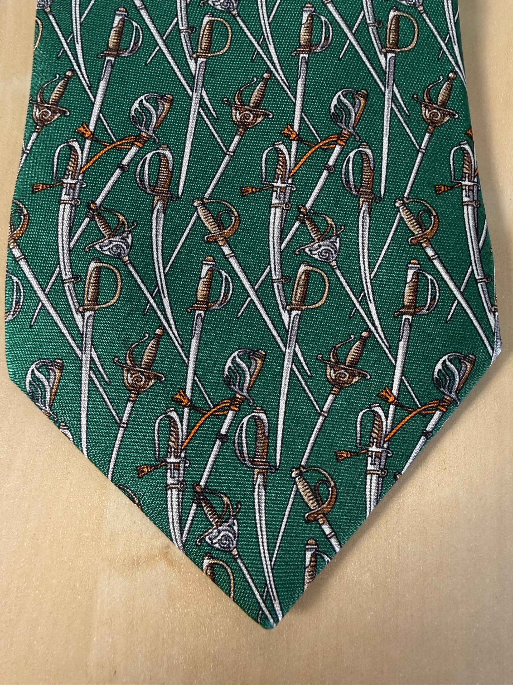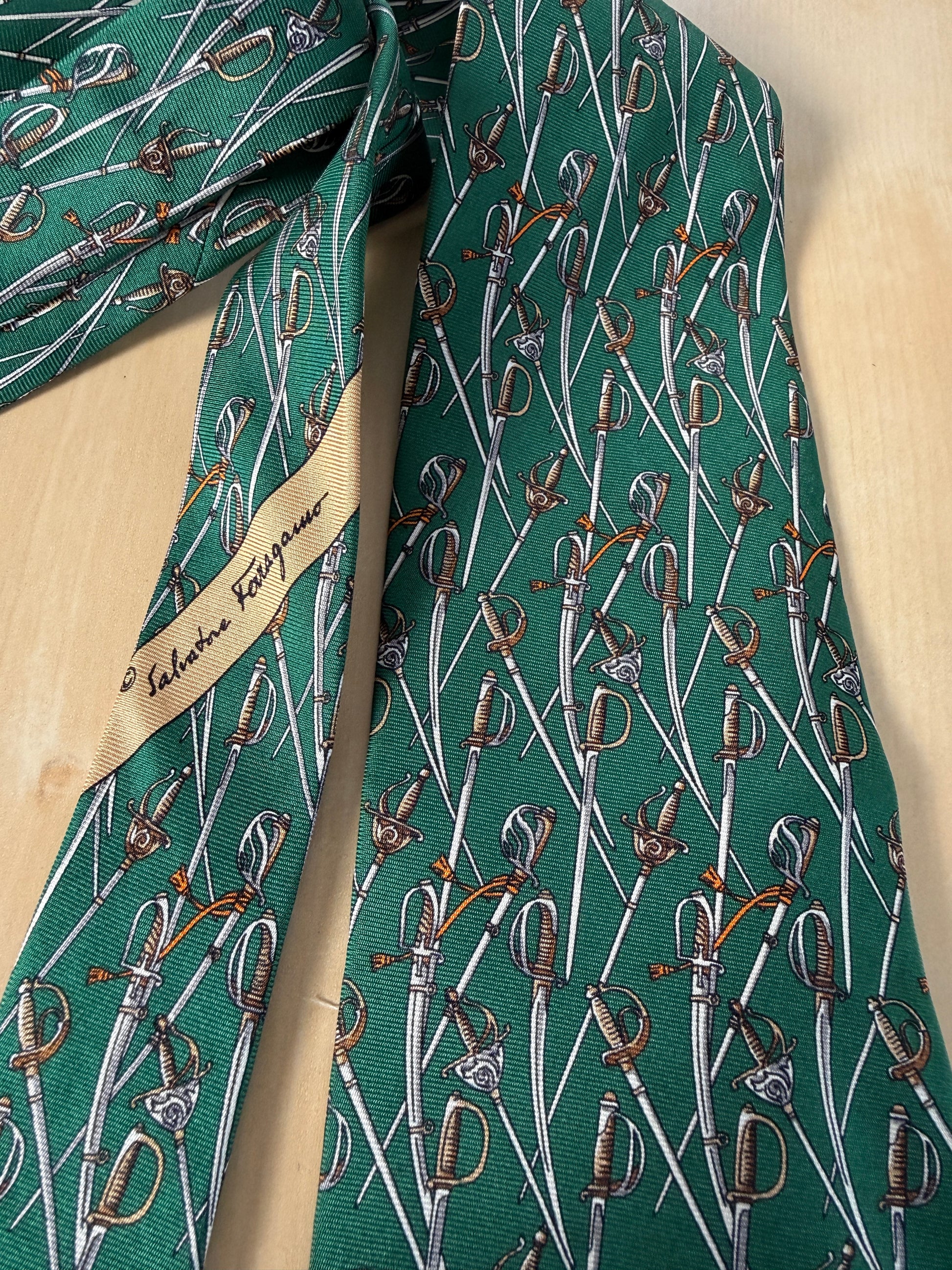 Cravatta Salvatore Ferragamo con rara stampa esclusiva per l’Arma dei Carabinieri: twill 100% seta verde, con fantasia di sciabole e spade.