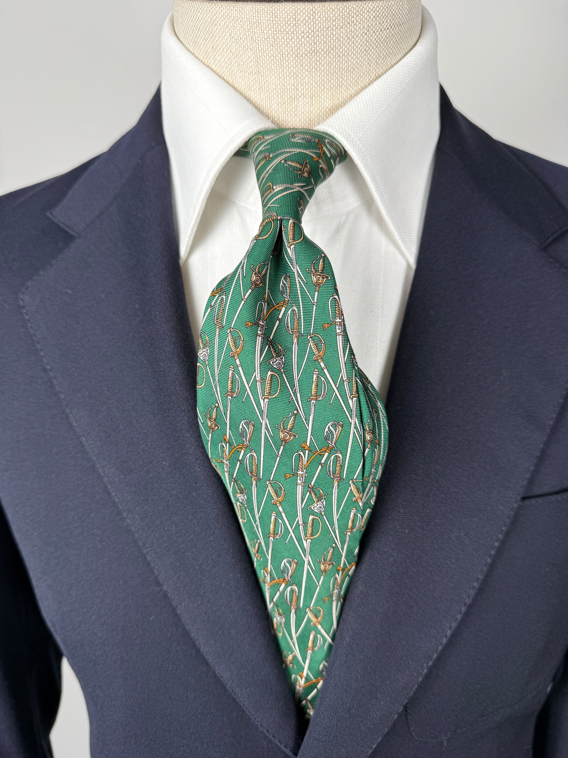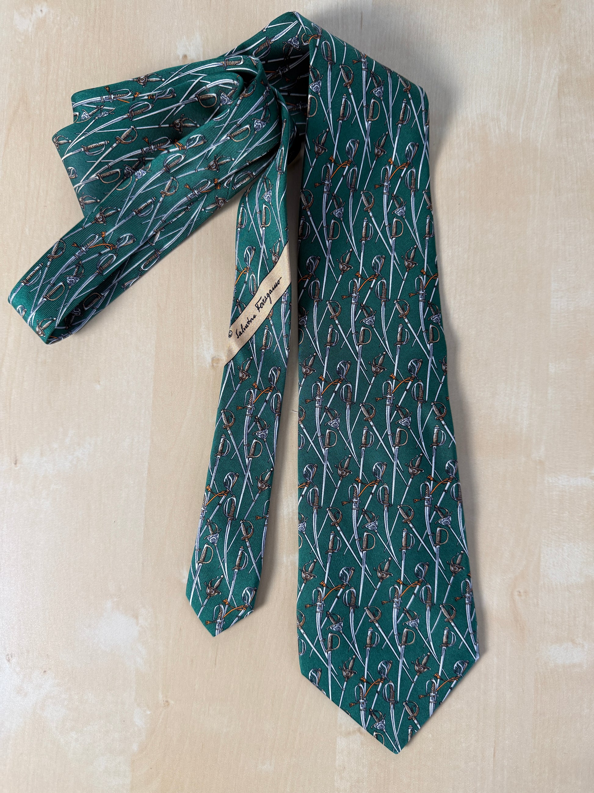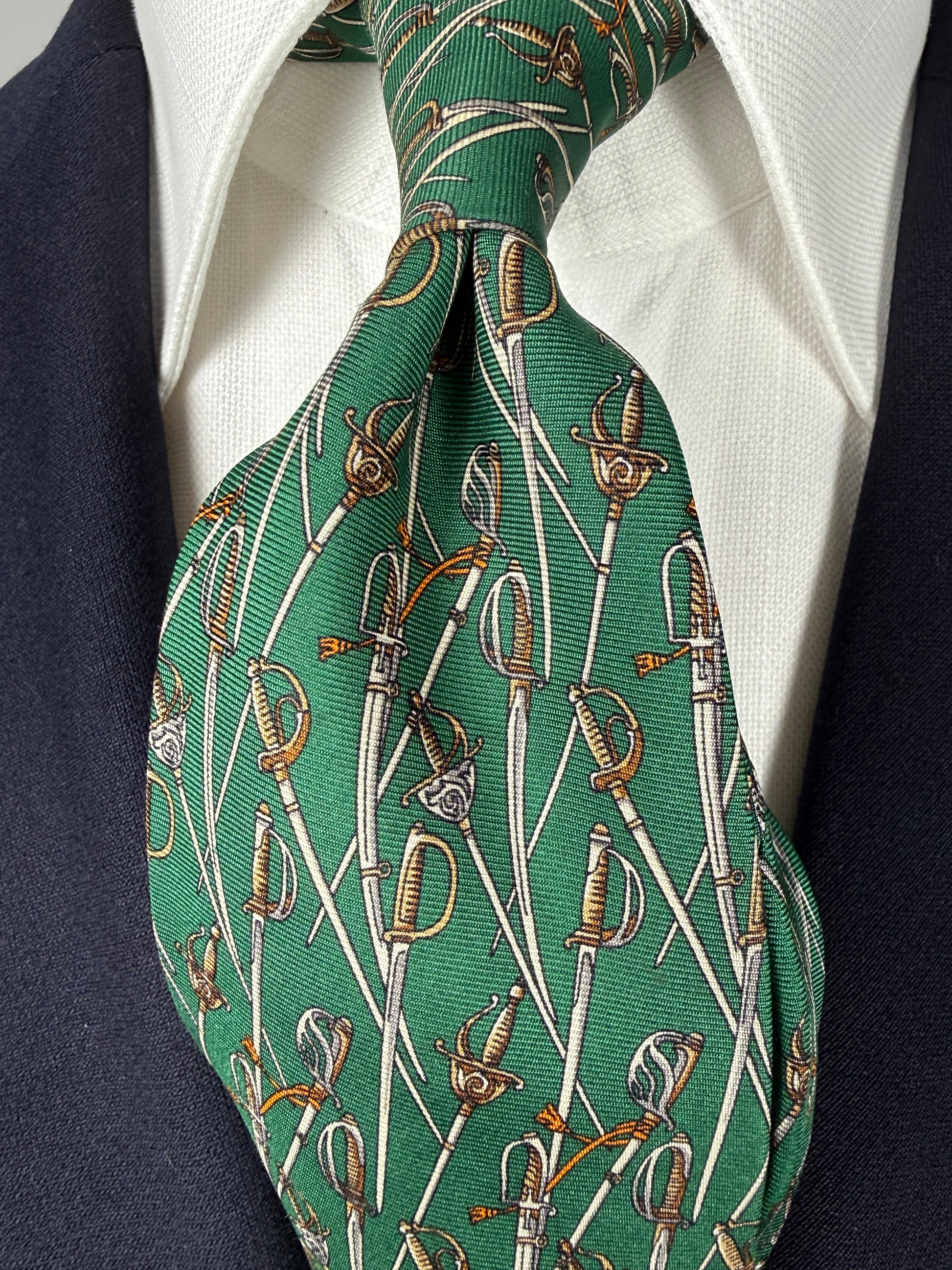 Cravatta Salvatore Ferragamo con rara stampa esclusiva per l’Arma dei Carabinieri: twill 100% seta verde, con fantasia di sciabole e spade.
