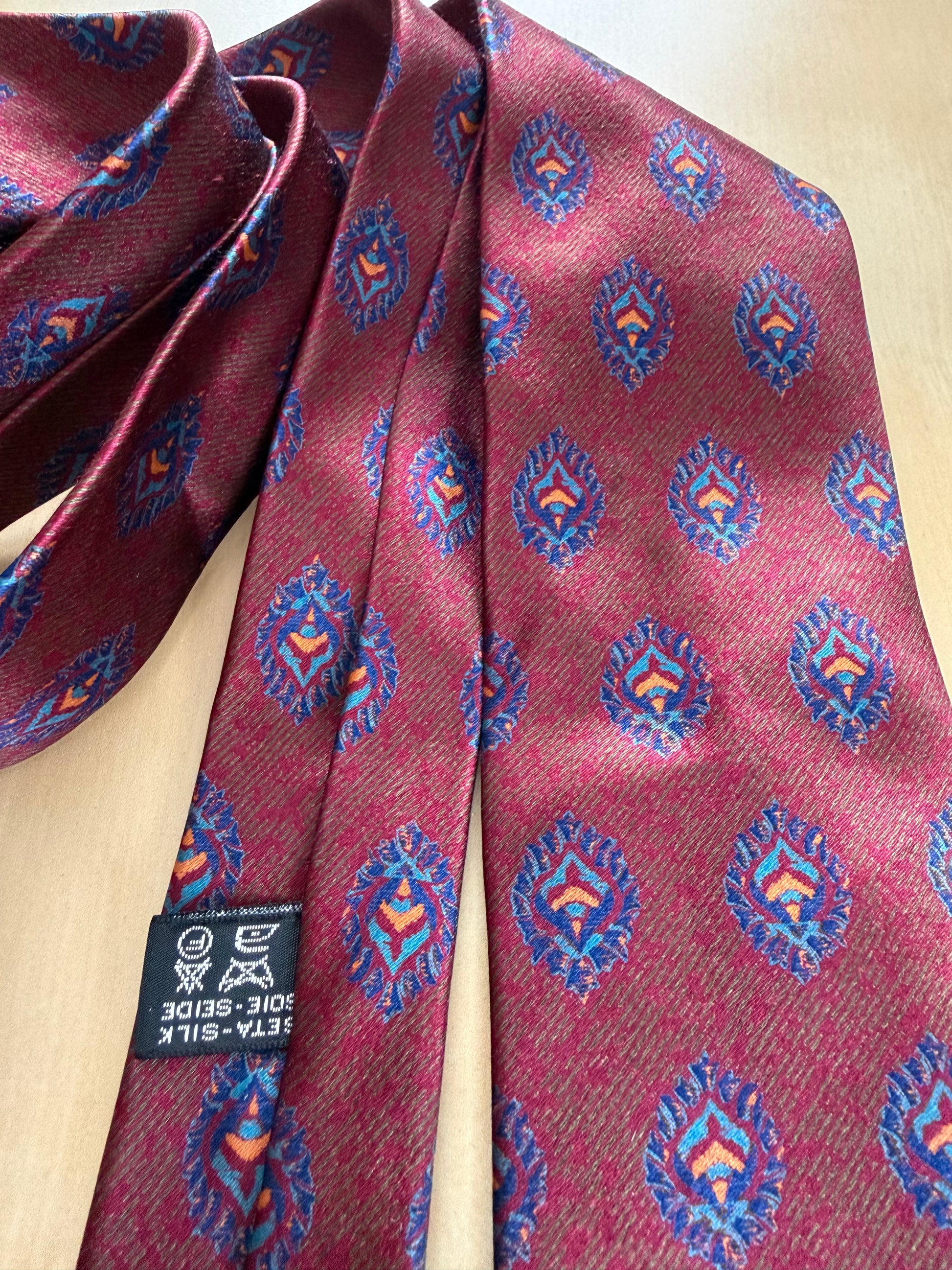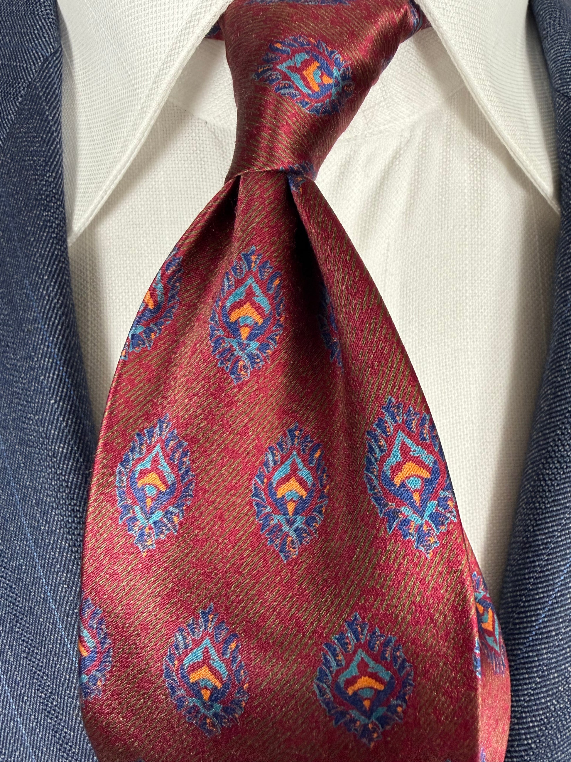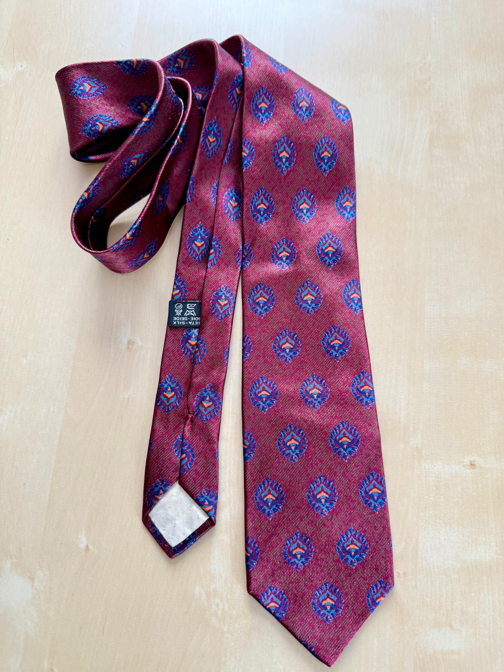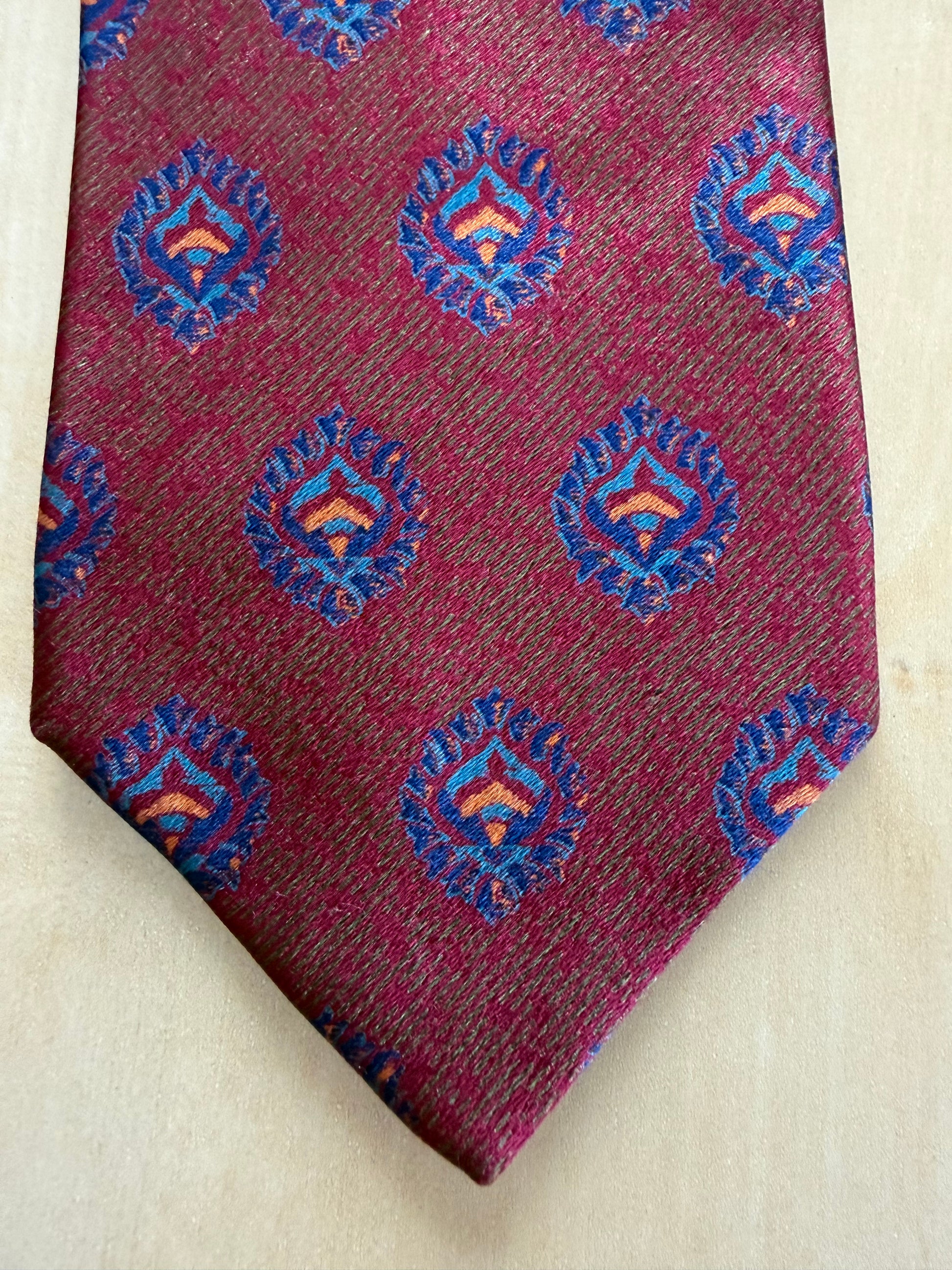 Cravatta meravigliosa, stupenda nella fantasia e al tatto morbida, come solo le cravatte vintage di una certa qualità sanno essere. E di certo sa cosa compra chi si affida alla selezione esperta, alla cortesia, alla visione storica e artigianale di chi cura Treble and Bass.. una selezione intelligente, oculata, a chilometro zero di abbigliamento e accessori vintage di elevata qualità, che vestono il corpo e nutrono l’anima del gusto della qualità e del valore artigianale di ciò che è fatto come si deve e come pochi ancora sanno fare!