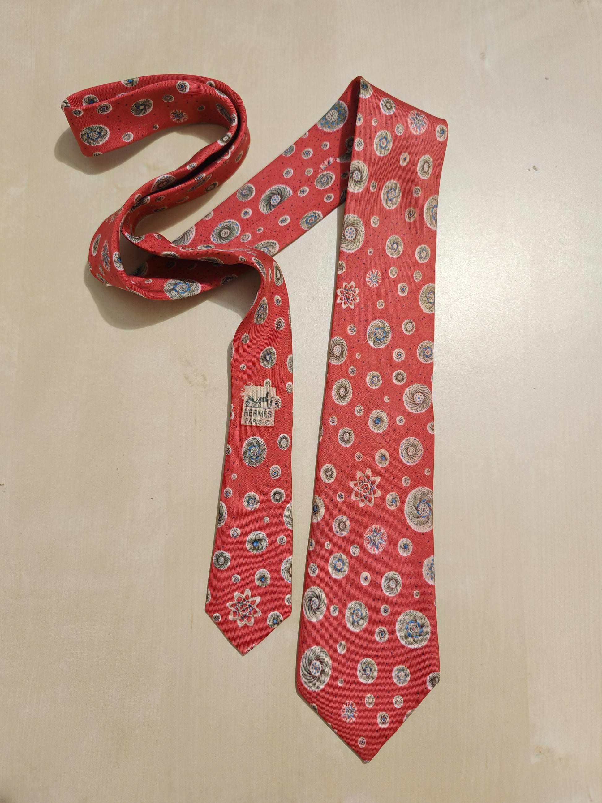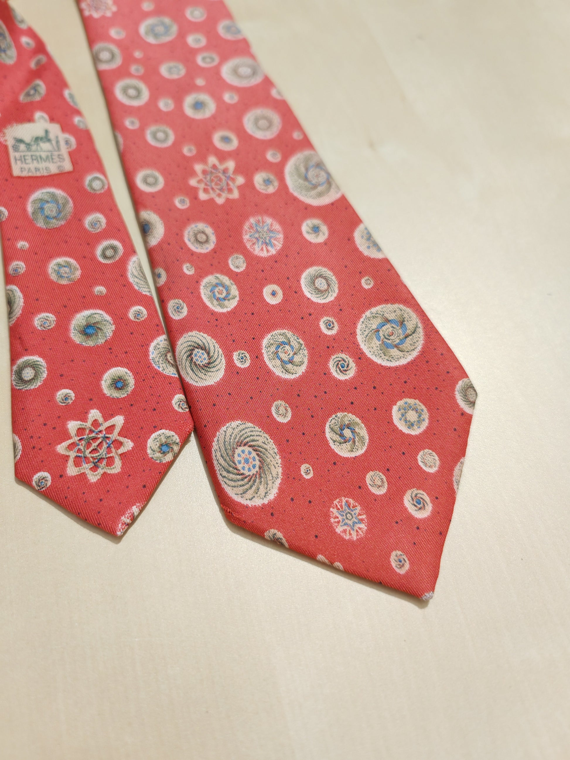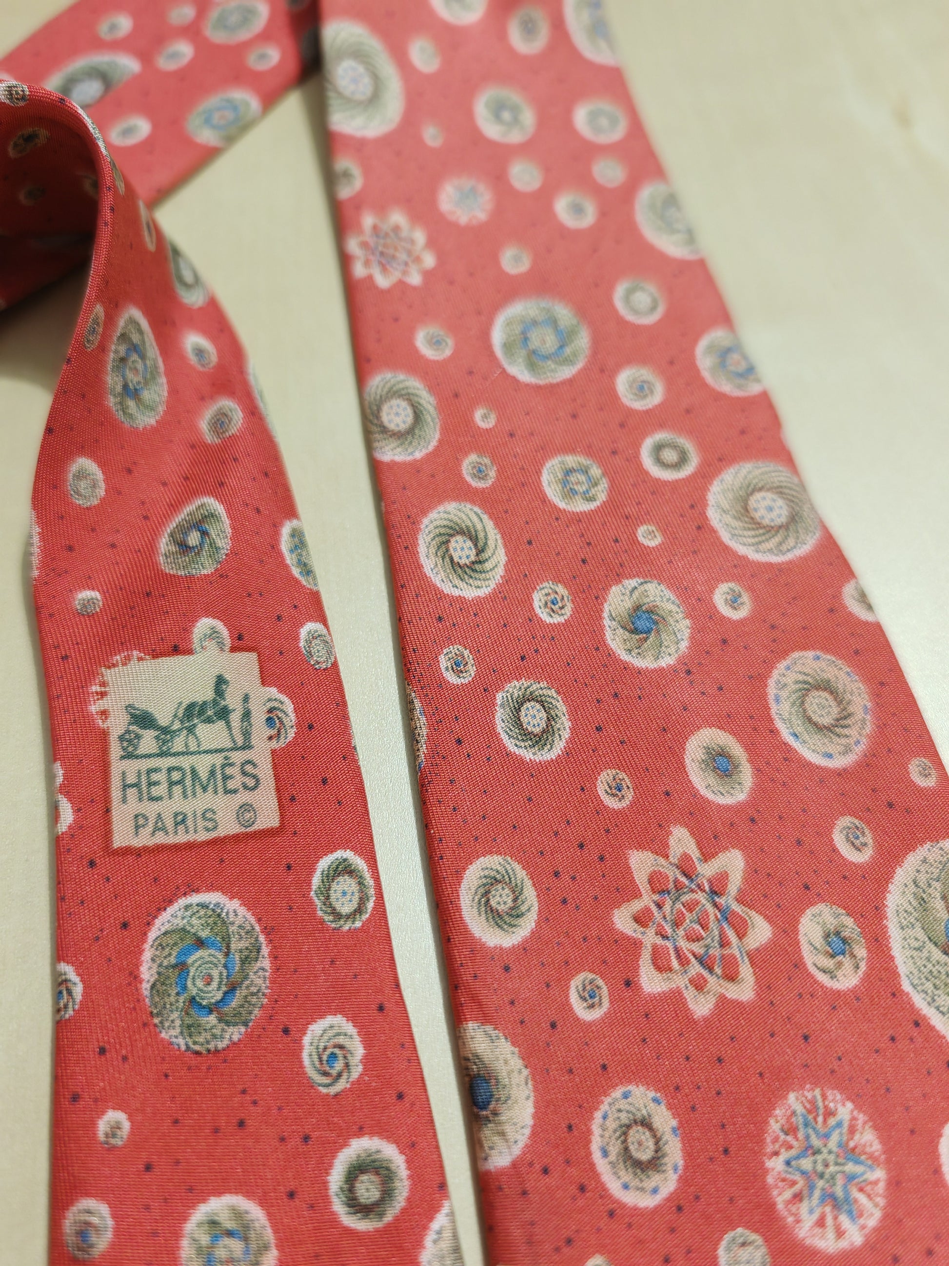 Bellissima cravatta Hermès vintage (dis. 7050 TA), in un bellissimo colore rosso corallo con fantasia a tema astronomico (galassie, orbitali, ecc.).