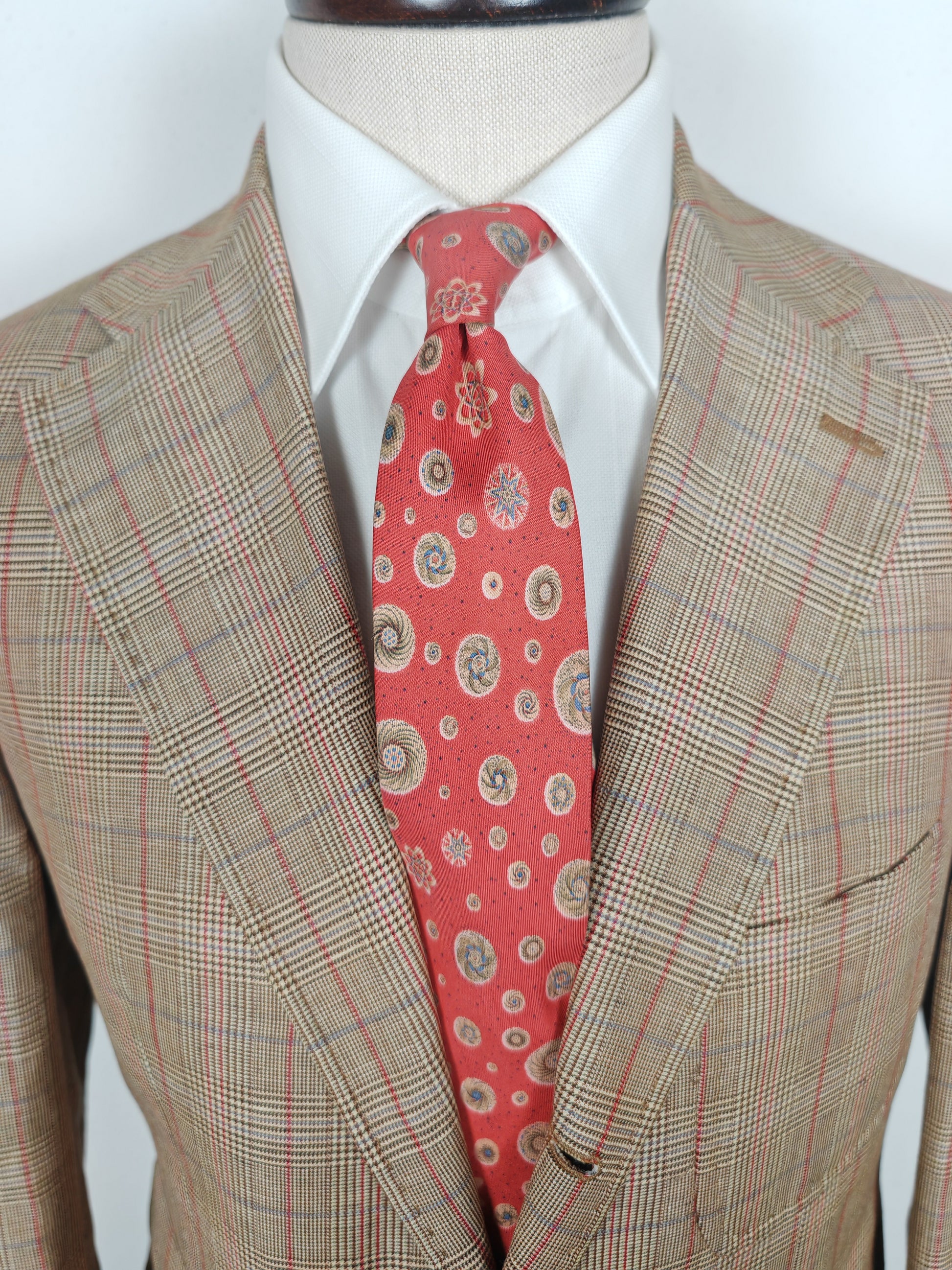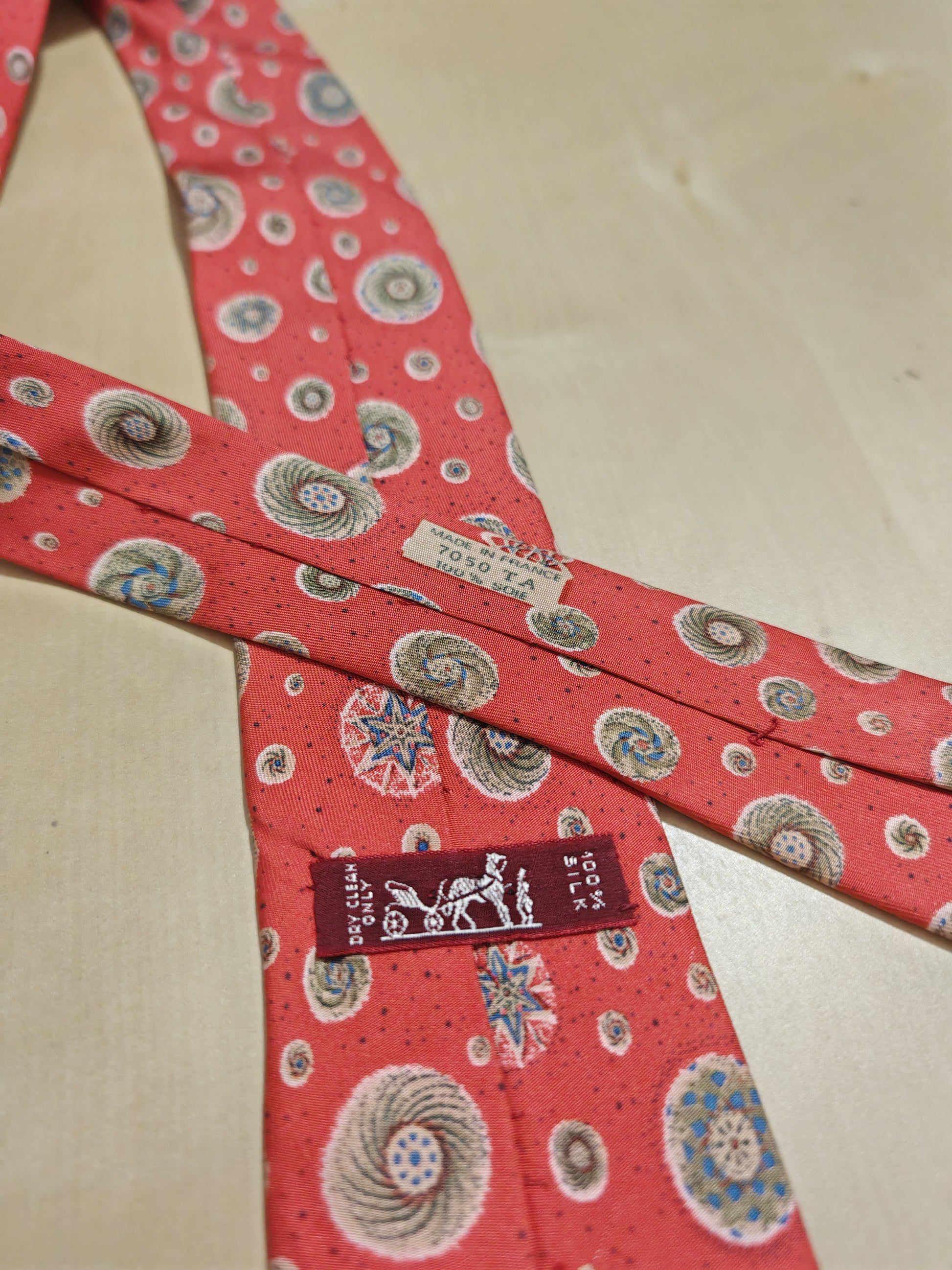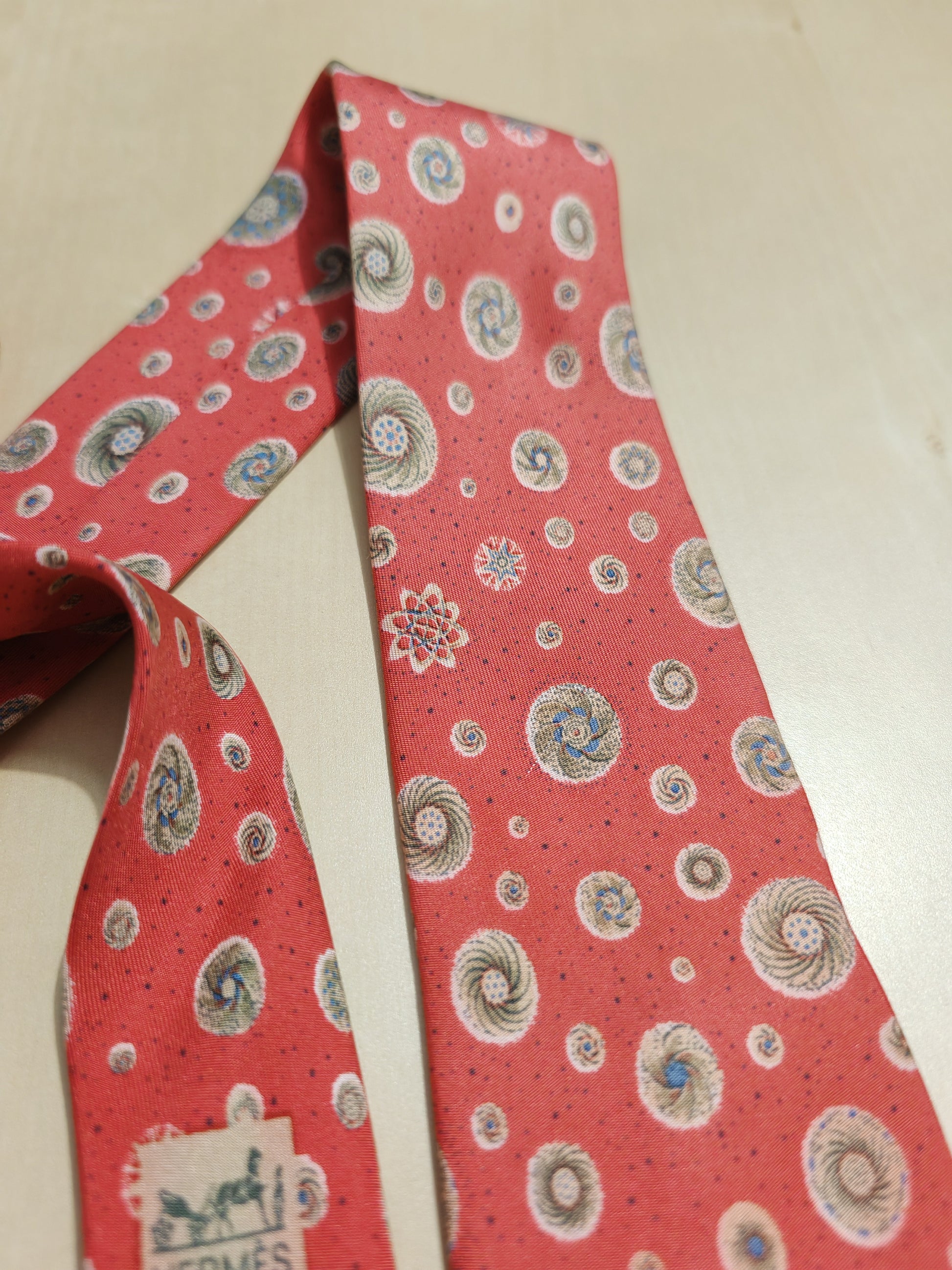 Bellissima cravatta Hermès vintage (dis. 7050 TA), in un bellissimo colore rosso corallo con fantasia a tema astronomico (galassie, orbitali, ecc.).