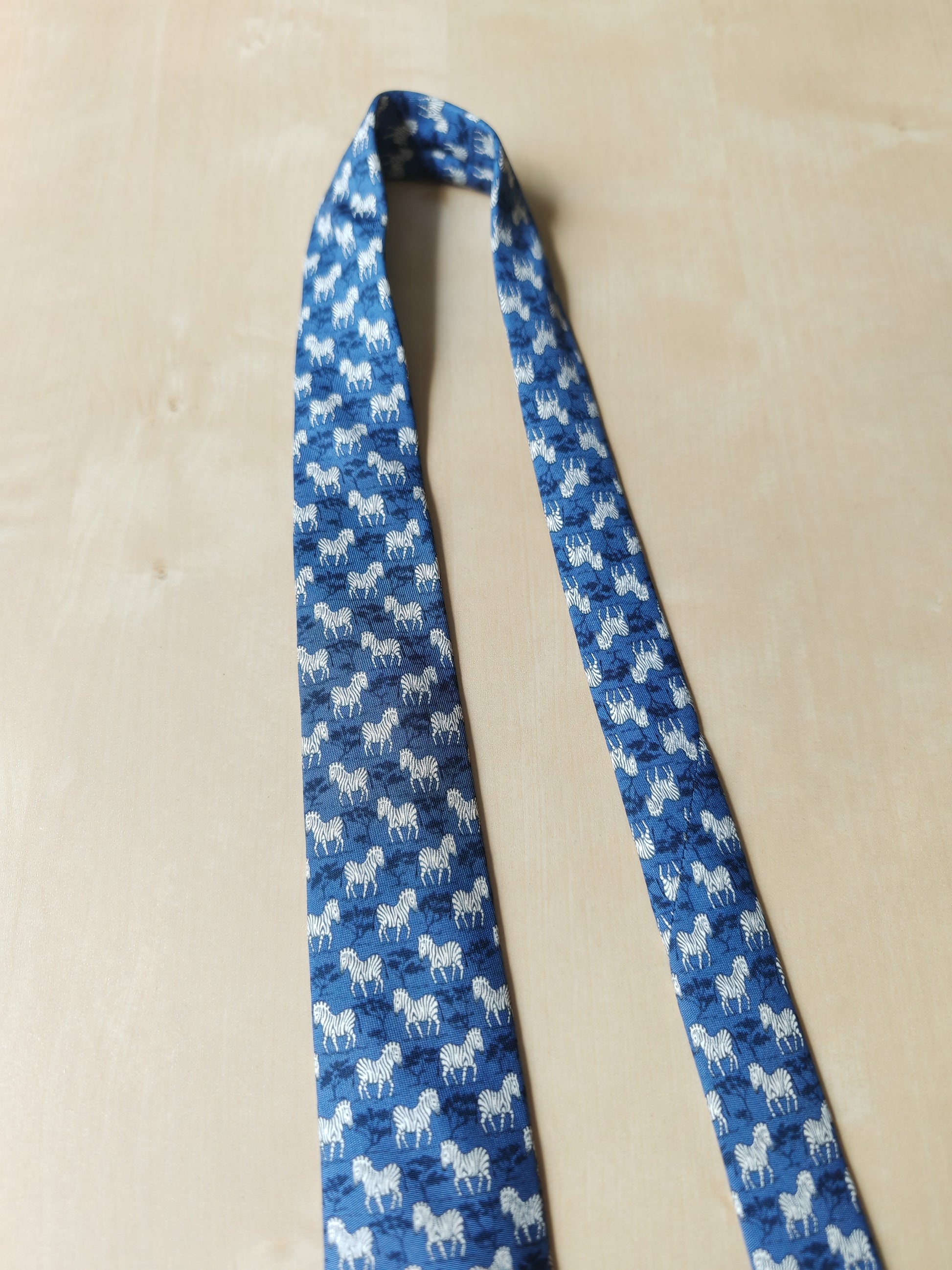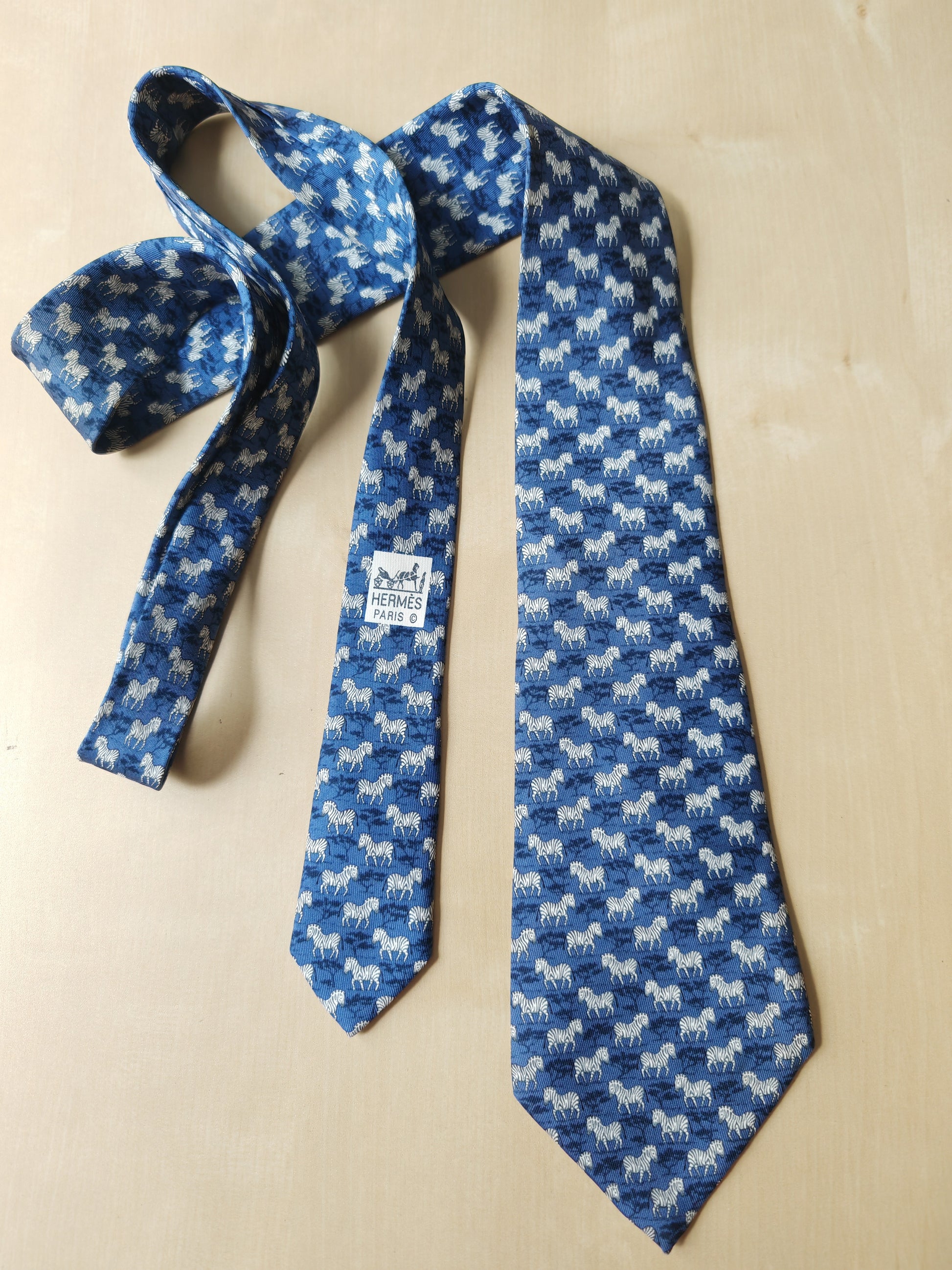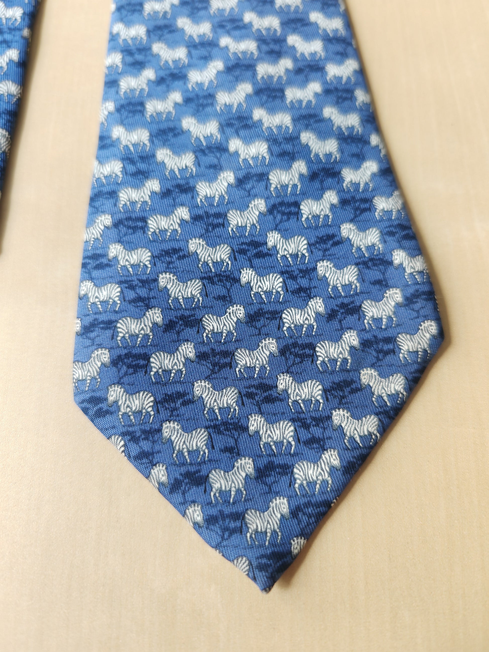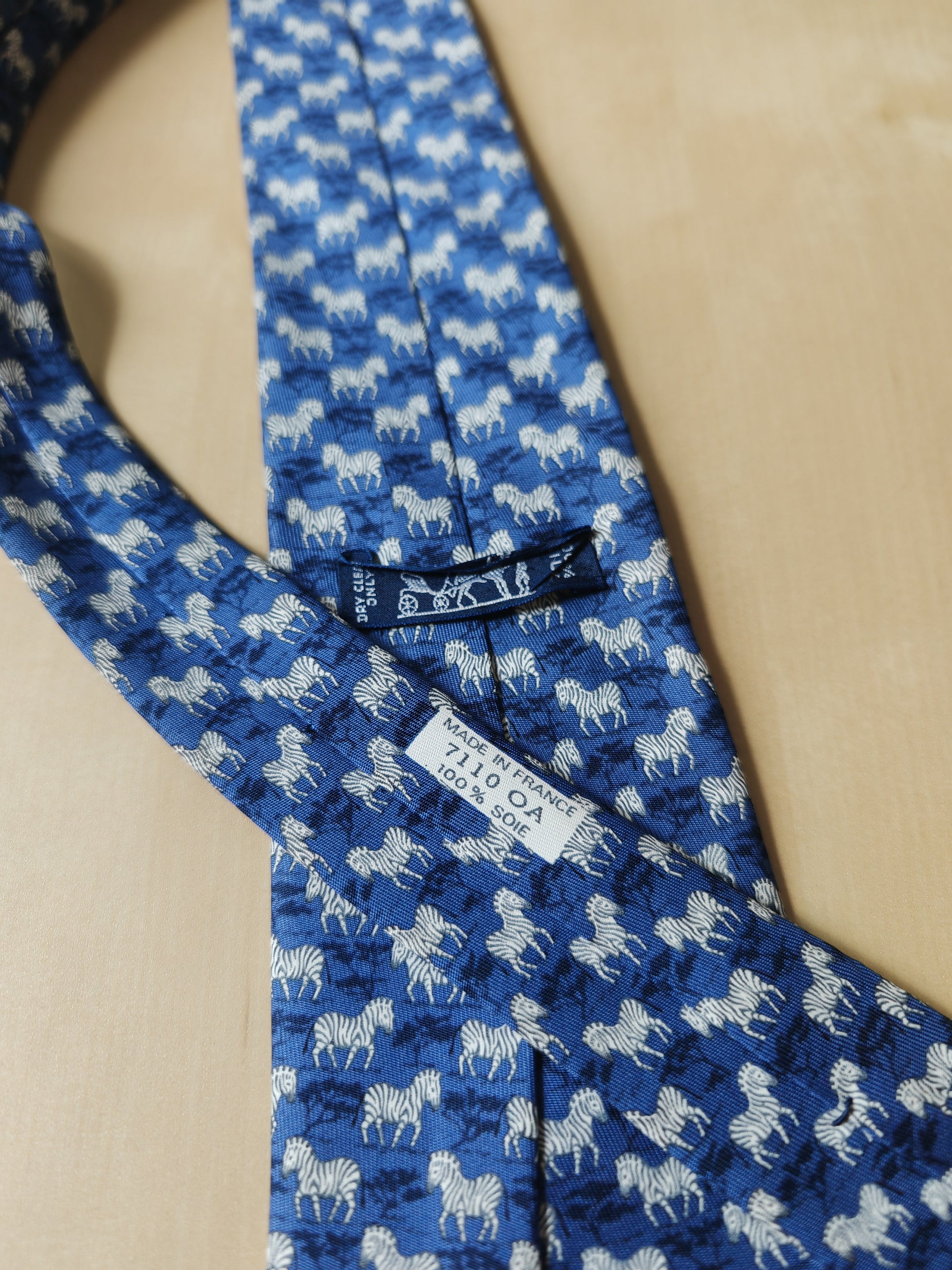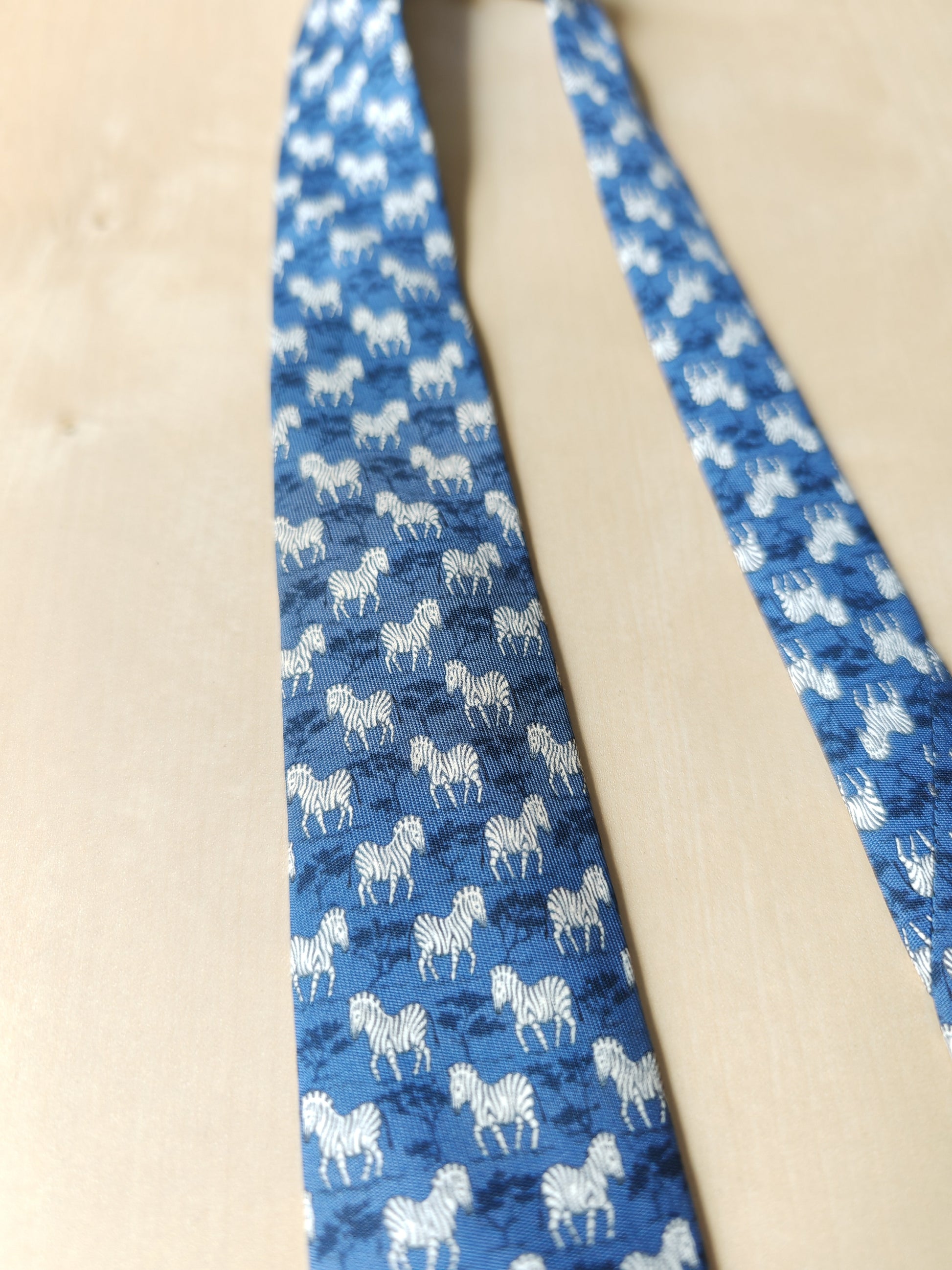 Cravatta Hermès 7110 OA, twill 100% seta con disegno di zebre e paesaggio di savana, nella colorazione blu.