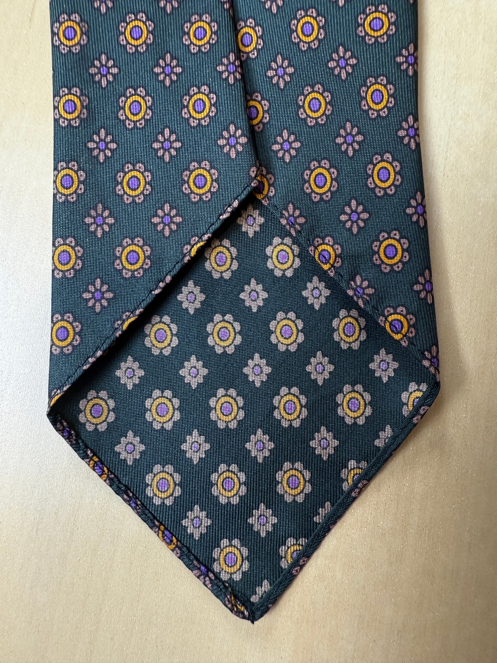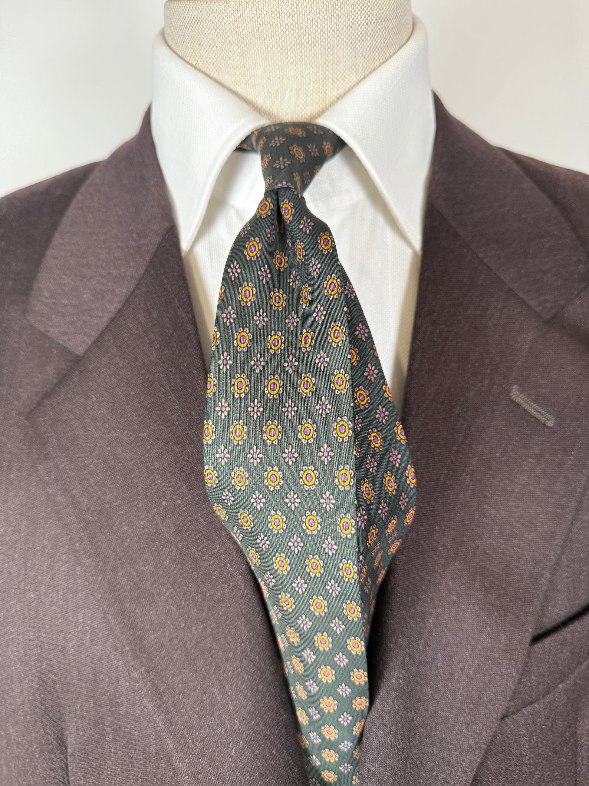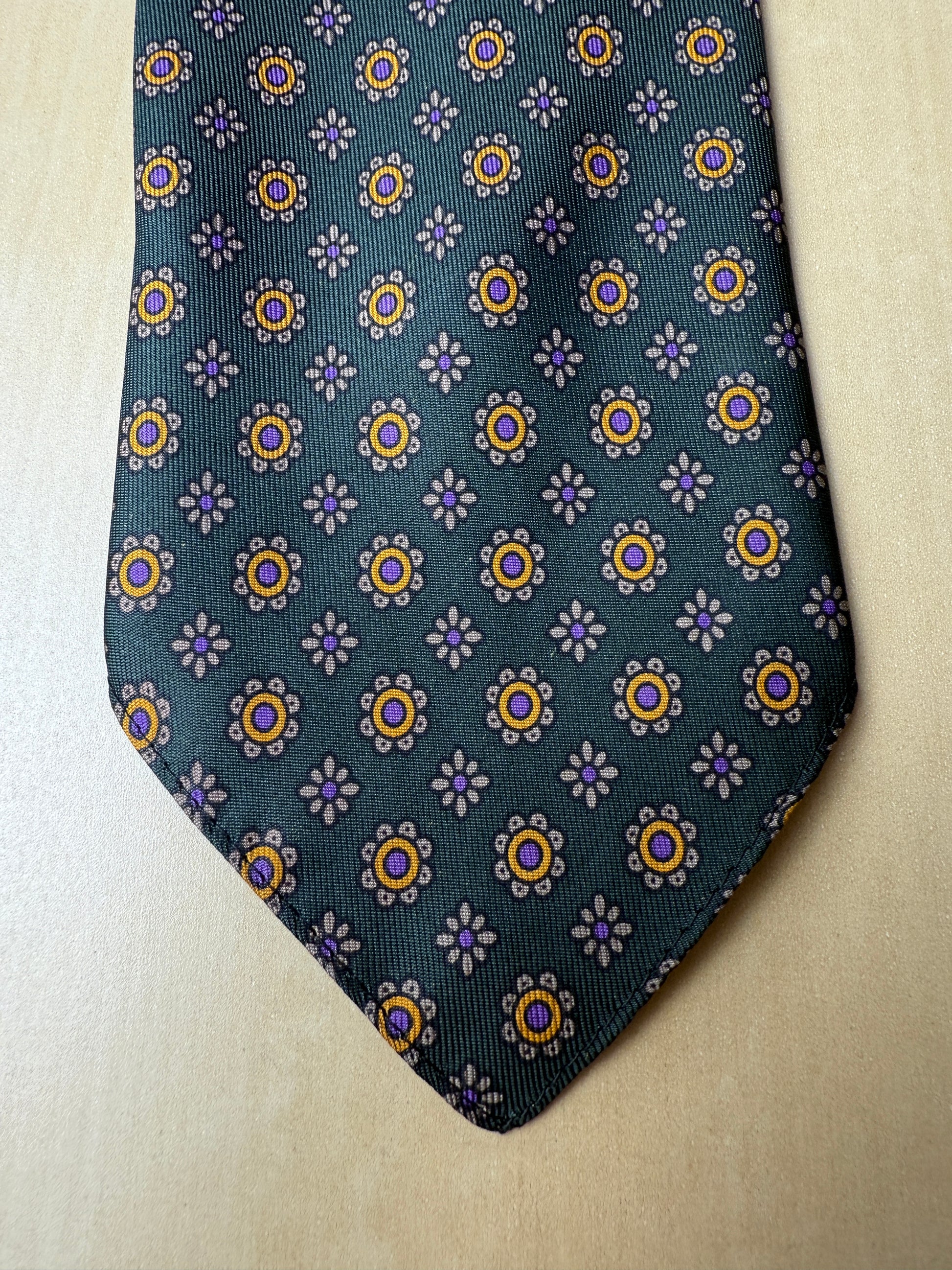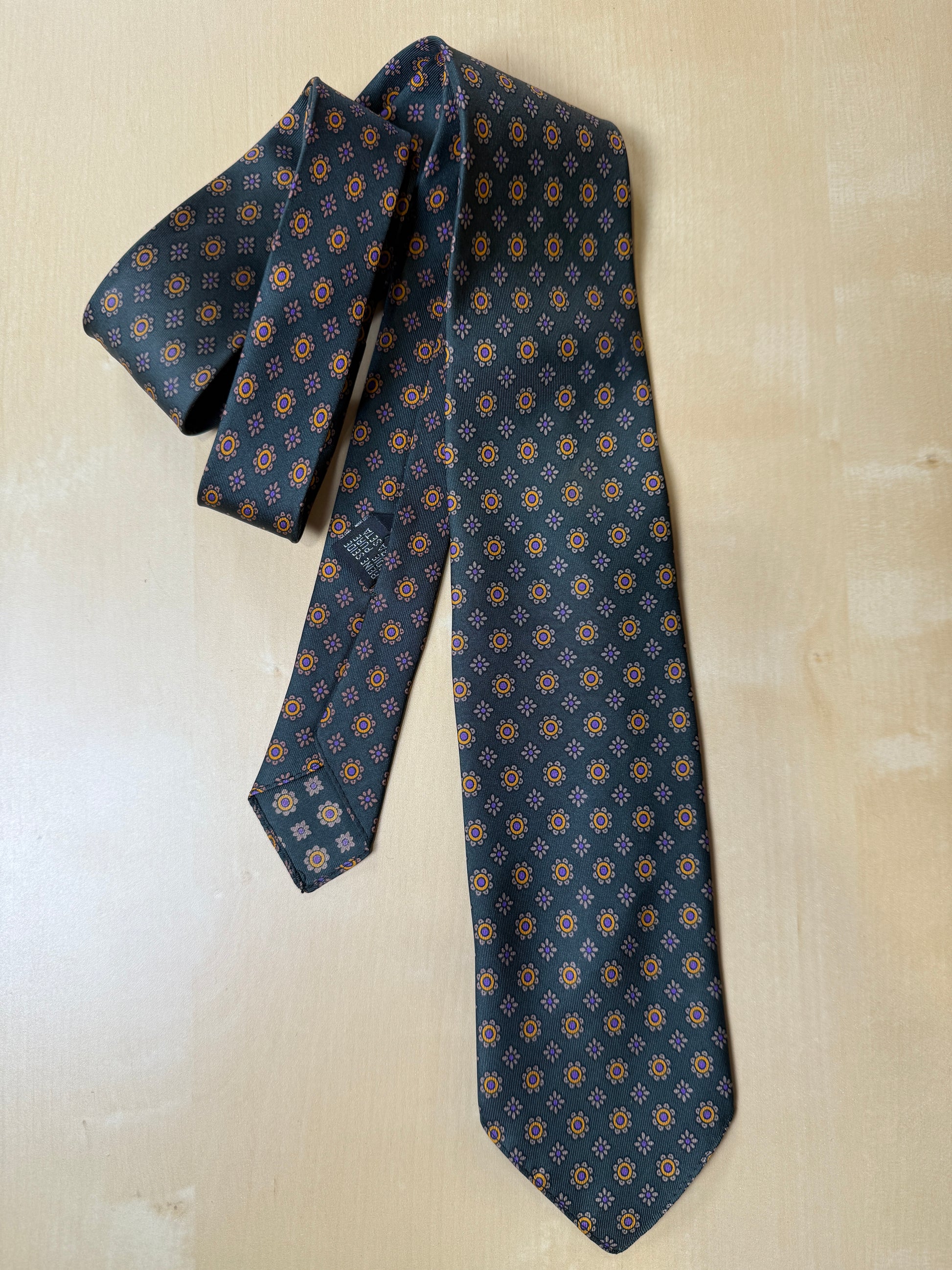 Cravatta vintage anni ‘80 Schostal made in England, in twill di pura seta colore verde scuro con micro fantasia a fiori.
