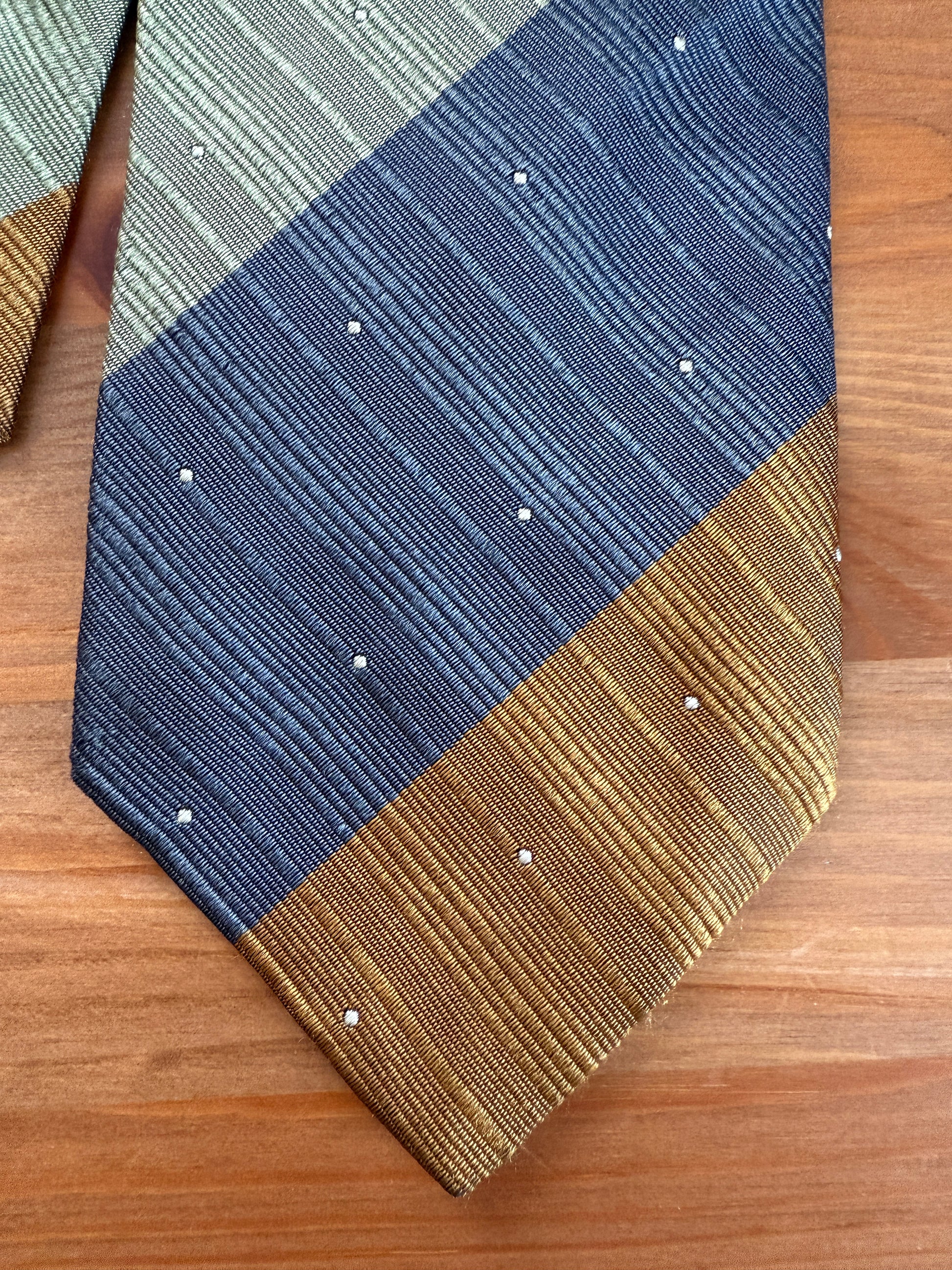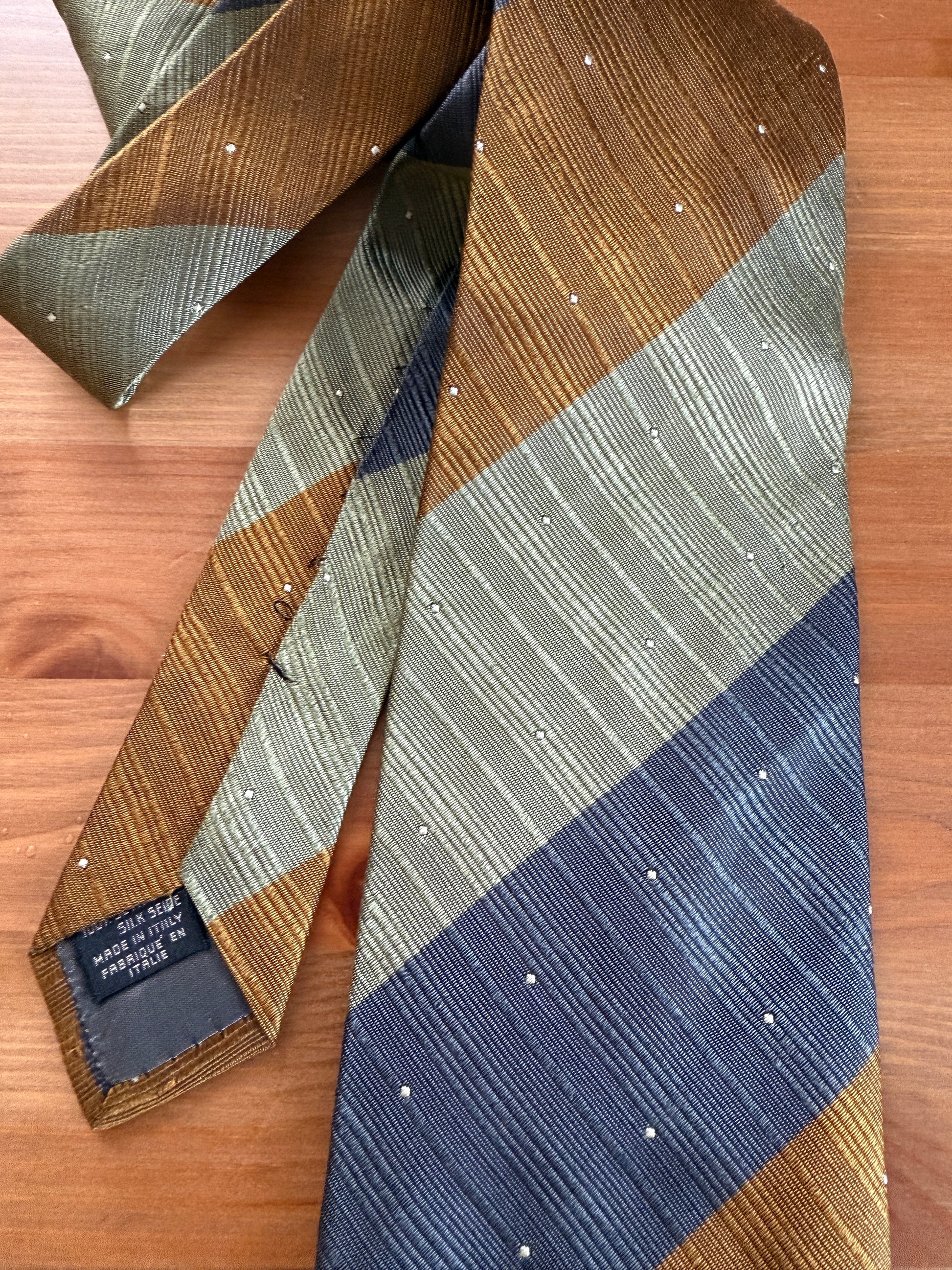 Bella fantasia a bande diagonali color oro, cachi e blu navy, con sovra fantasia a pois e disegno di un fiore sulla parte alta, ricamato a jacquard.