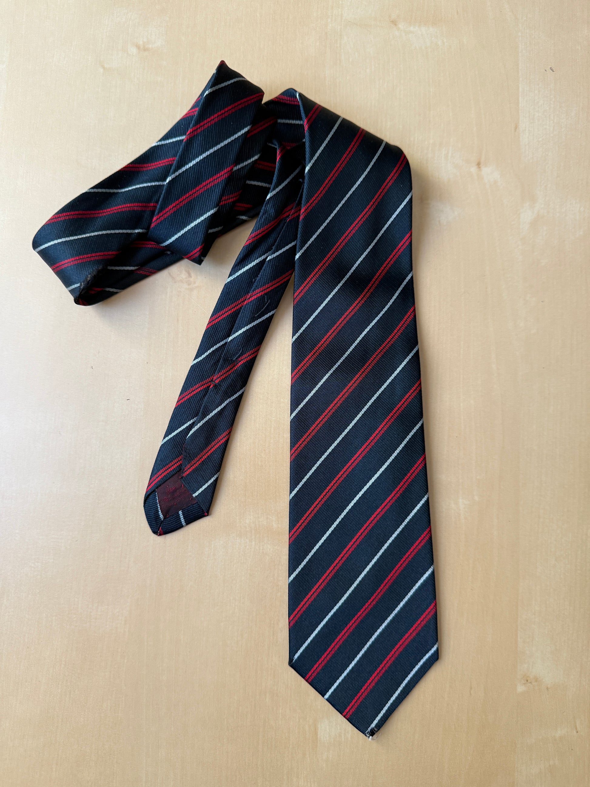 Cravatta Lanvin vintage in twill di pura seta. Fondo blu navy con righine regimental in rosso e bianco.