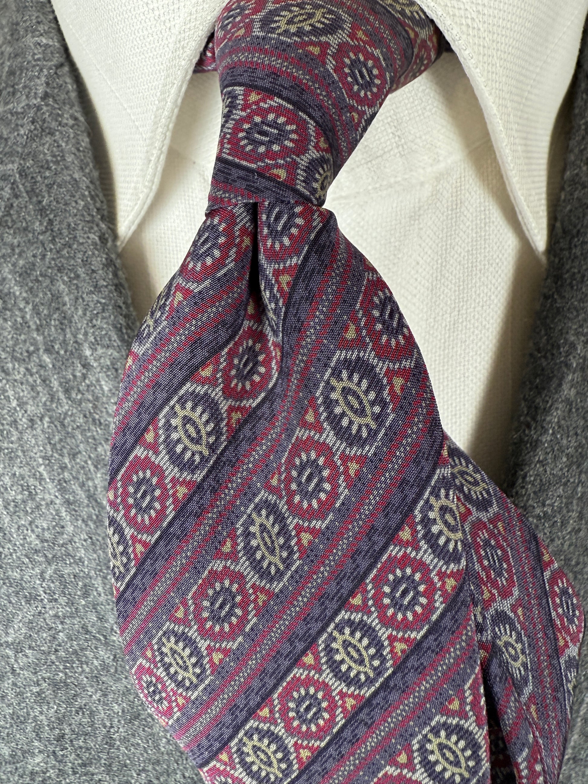 Cravatta meravigliosa, stupenda nella fantasia e al tatto morbida, come solo le cravatte vintage di una certa qualità sanno essere. E di certo sa cosa compra chi si affida alla selezione esperta, alla cortesia, alla visione storica e artigianale di chi cura Treble and Bass.. una selezione intelligente, oculata, a chilometro zero di abbigliamento e accessori vintage di elevata qualità, che vestono il corpo e nutrono l’anima del gusto della qualità e del valore artigianale di ciò che è fatto come si deve e come pochi ancora sanno fare!