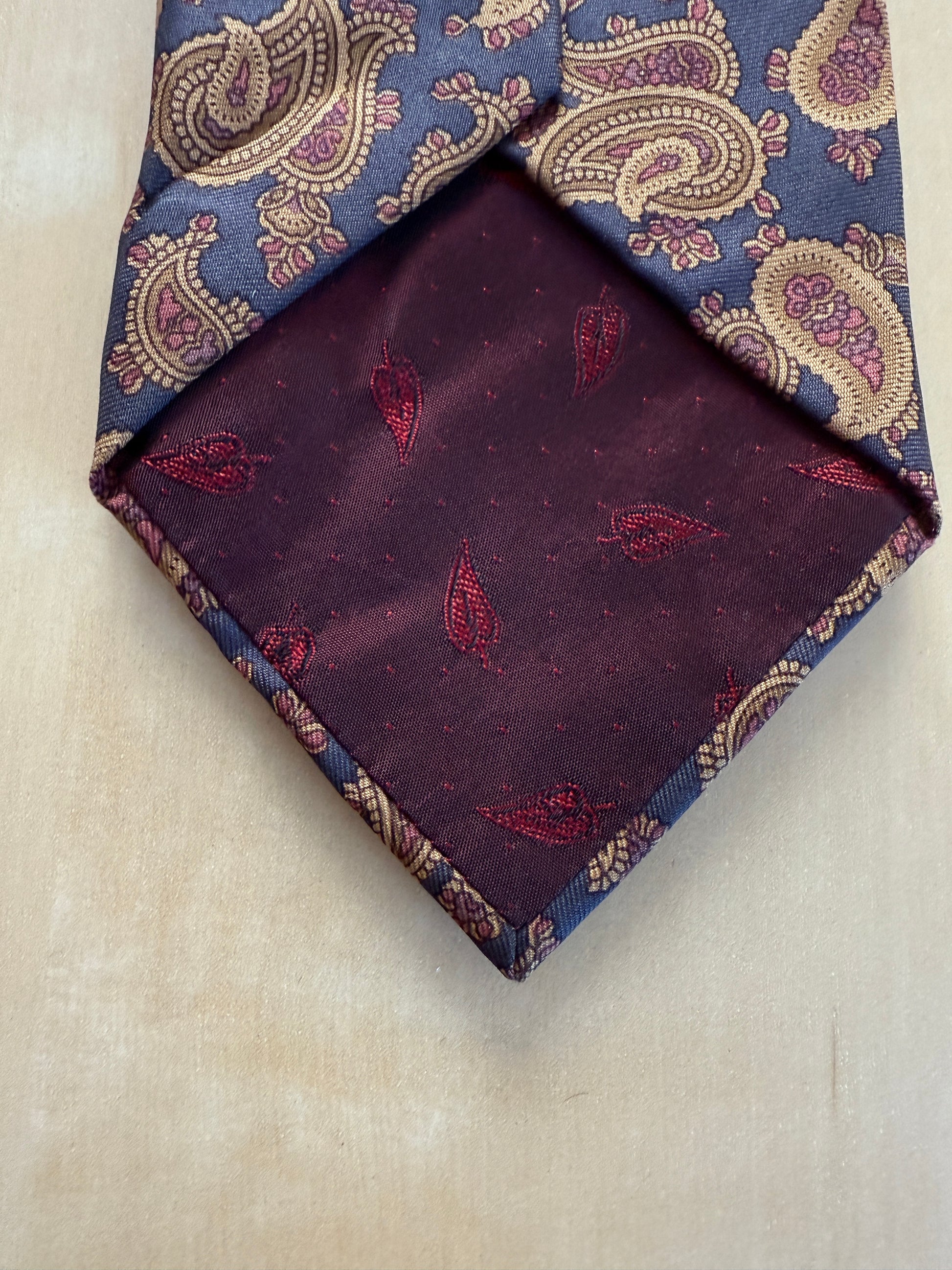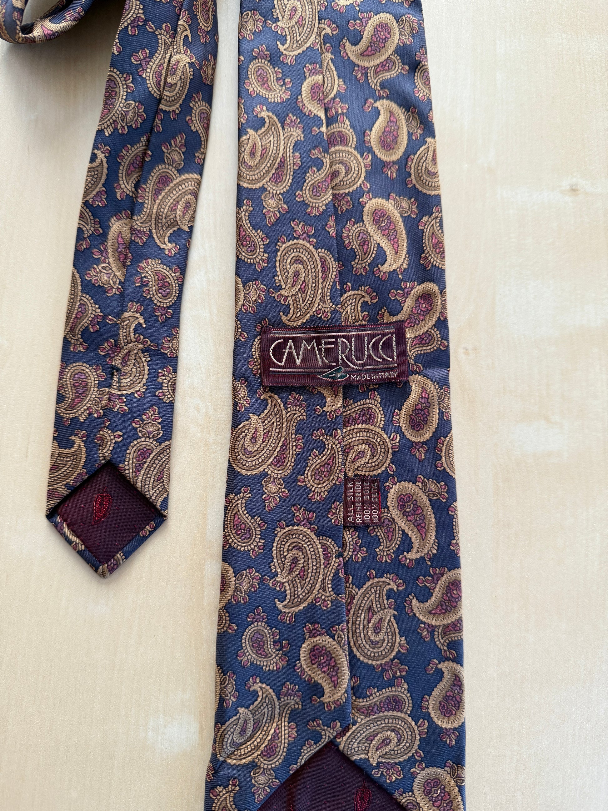 Cravatta Camerucci vintage, in twill 100% seta, fondo blu avio con bella fantasia paisley su toni terra/cachi.