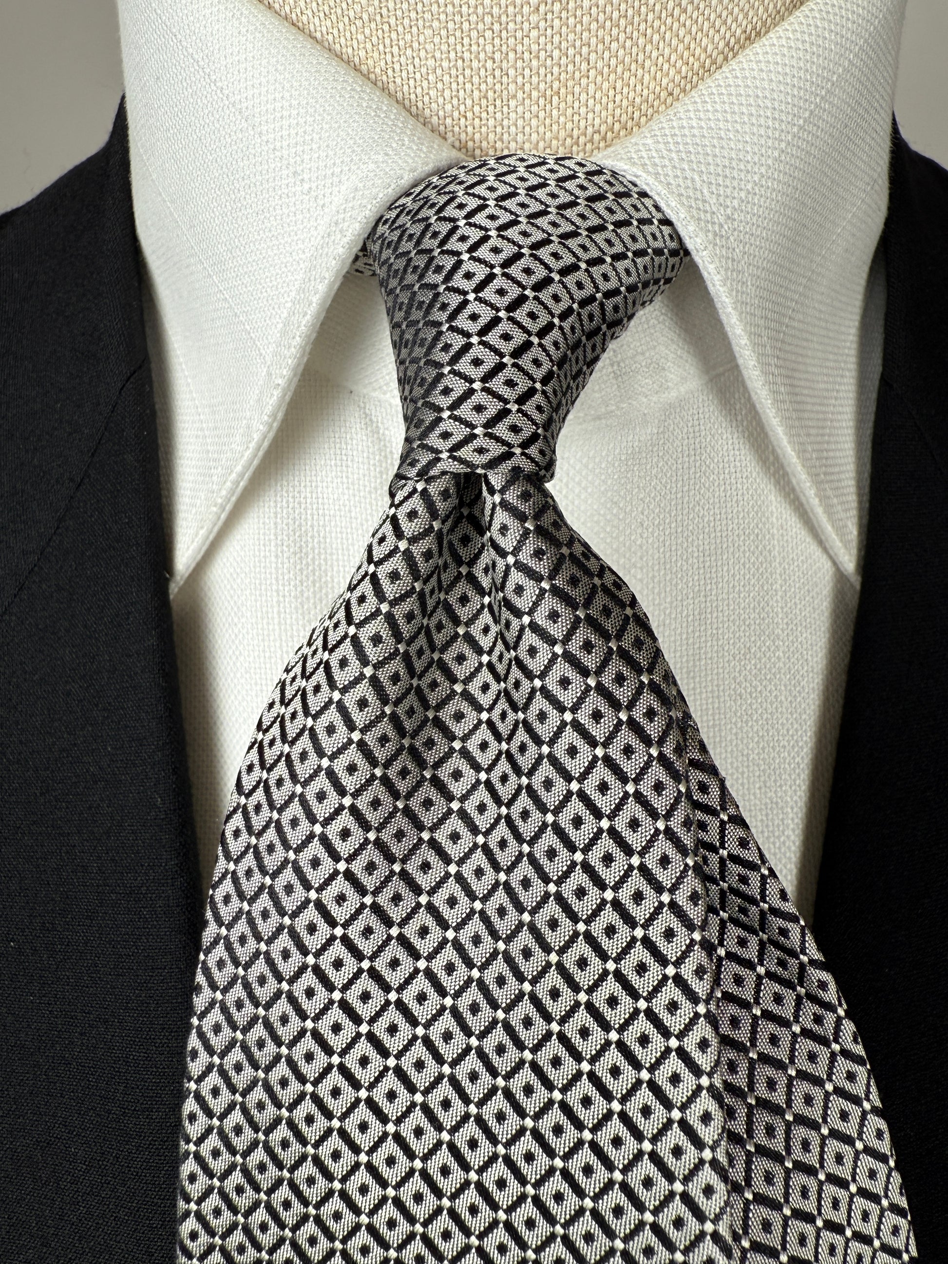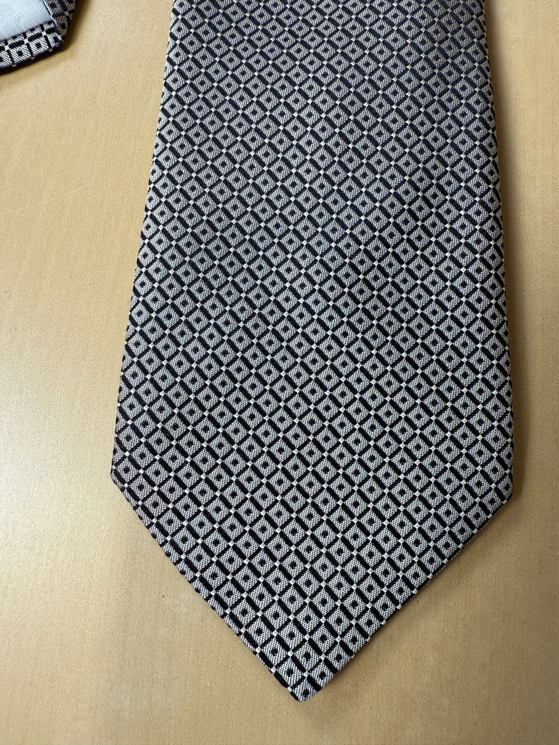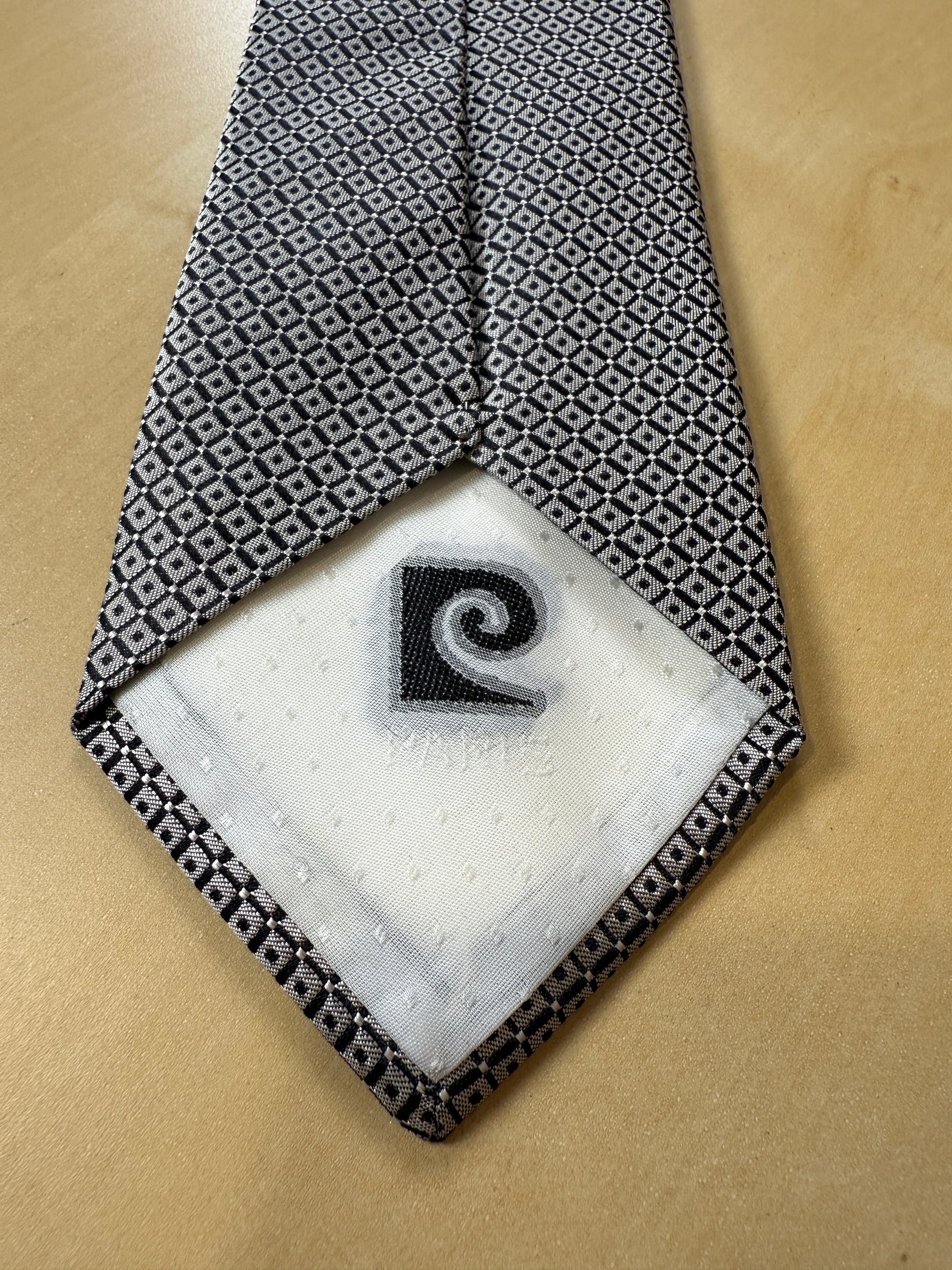 Cravatta Pierre Cardin vintage in pura seta con fantasia optical in grigio argento e nero.