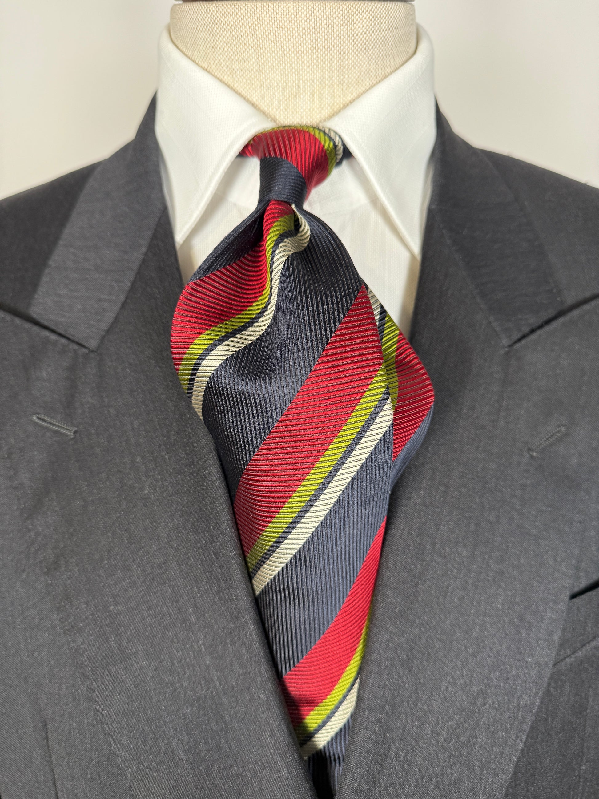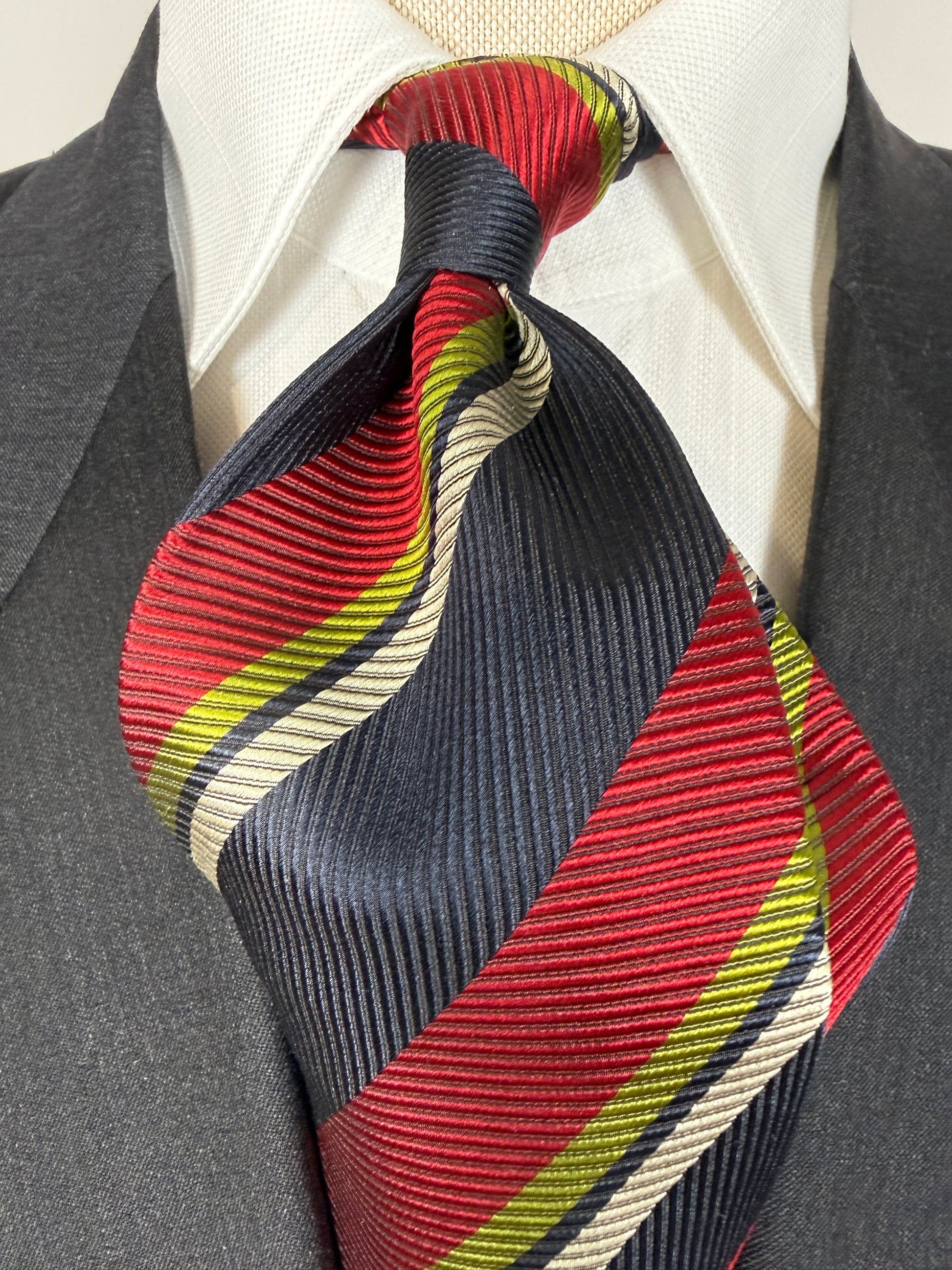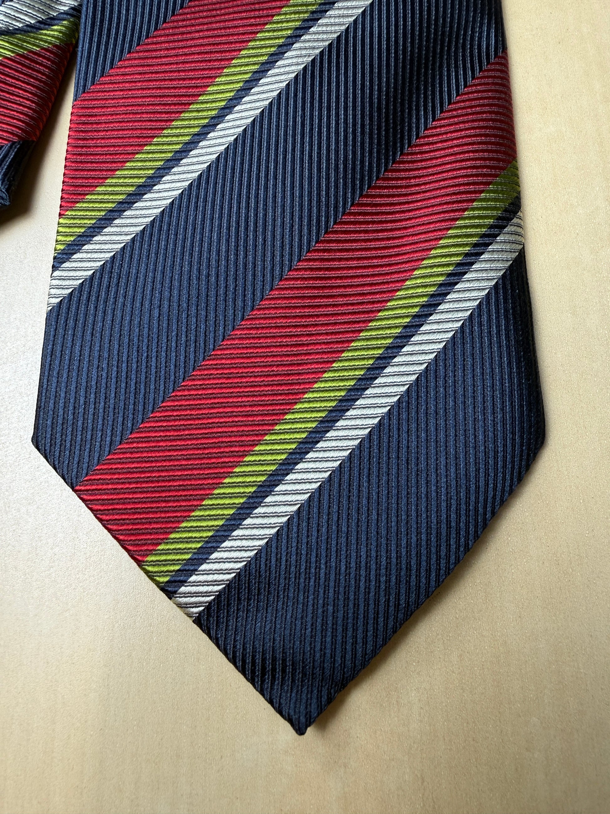 Cravatta Fabio Ferretti in pura seta cannettata, fantasia a righe regimental rosso e verde su fondo blu navy.