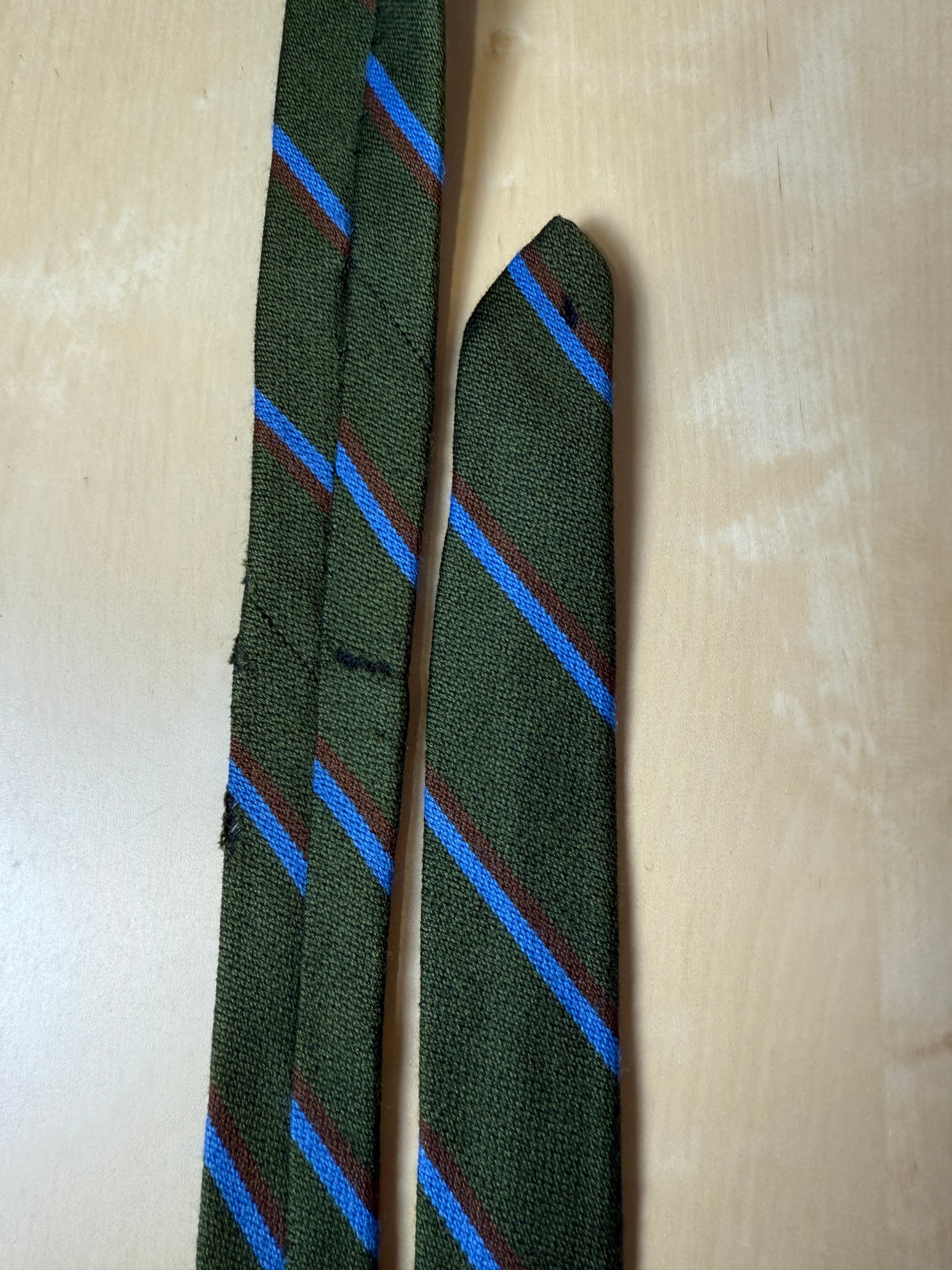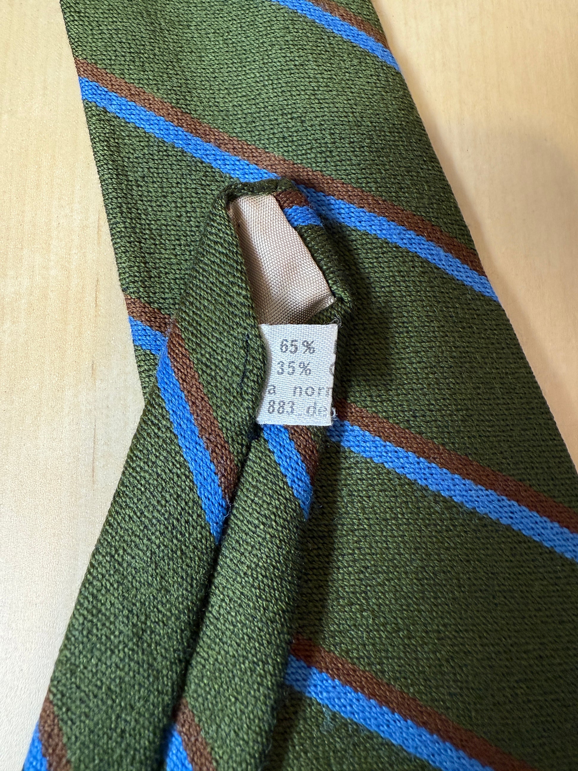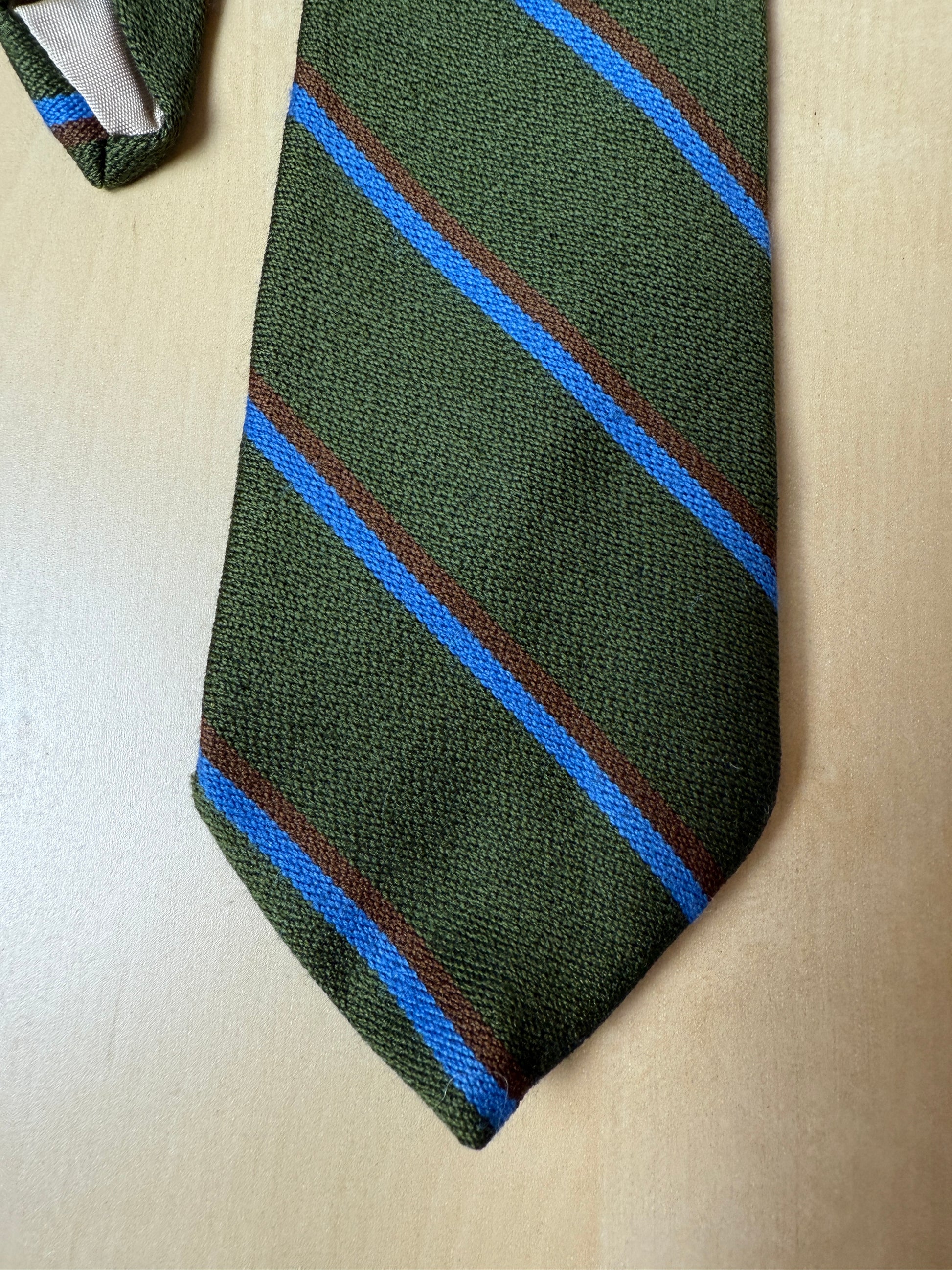 Fantasia a righe regimental in senso inverso, azzurre e marroni su fondo verde cachi.