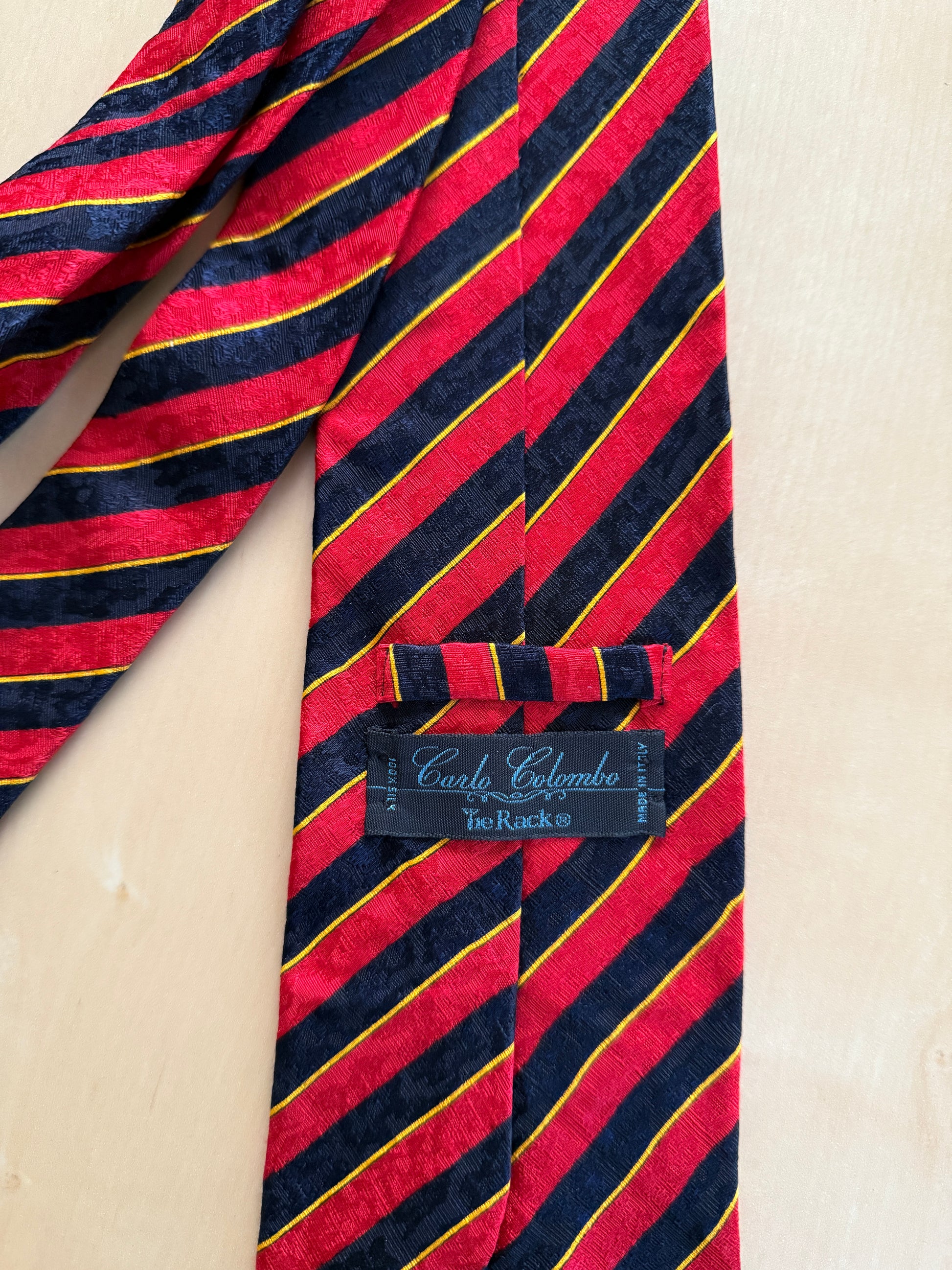 Cravatta in pura seta con delicata lavorazione jacquard, e stampa con fantasia regimental a righe rosso e navy.