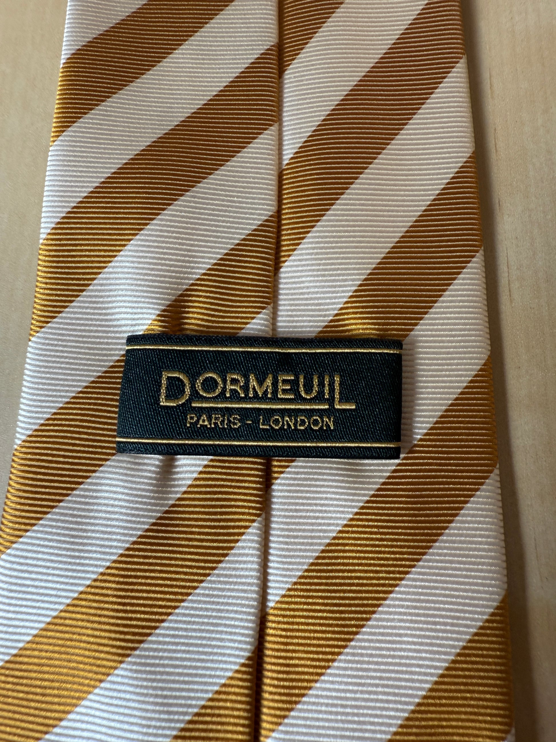Cravatta Dormeuil con bellissima fantasia a righe regimental giallo oro e panna.