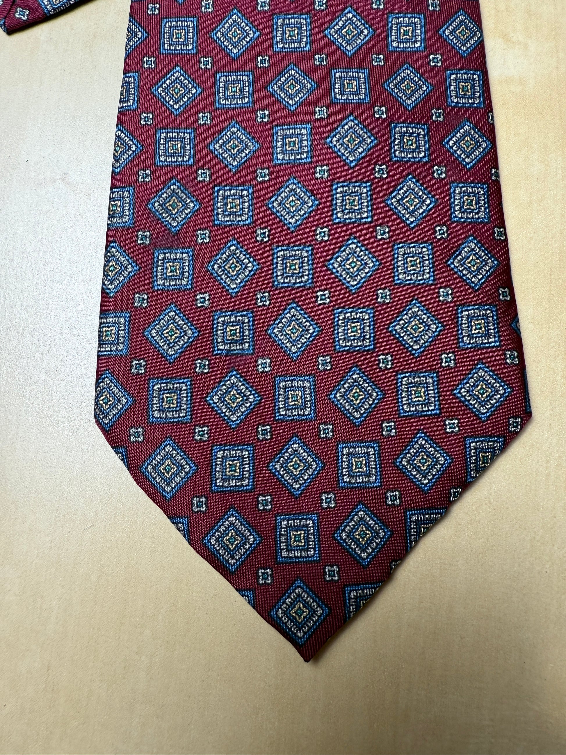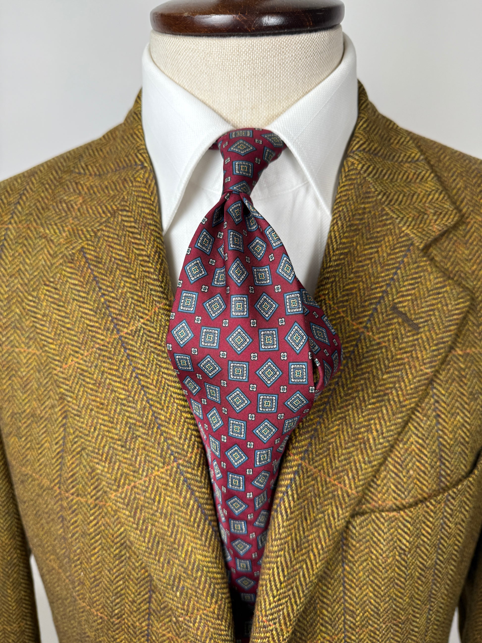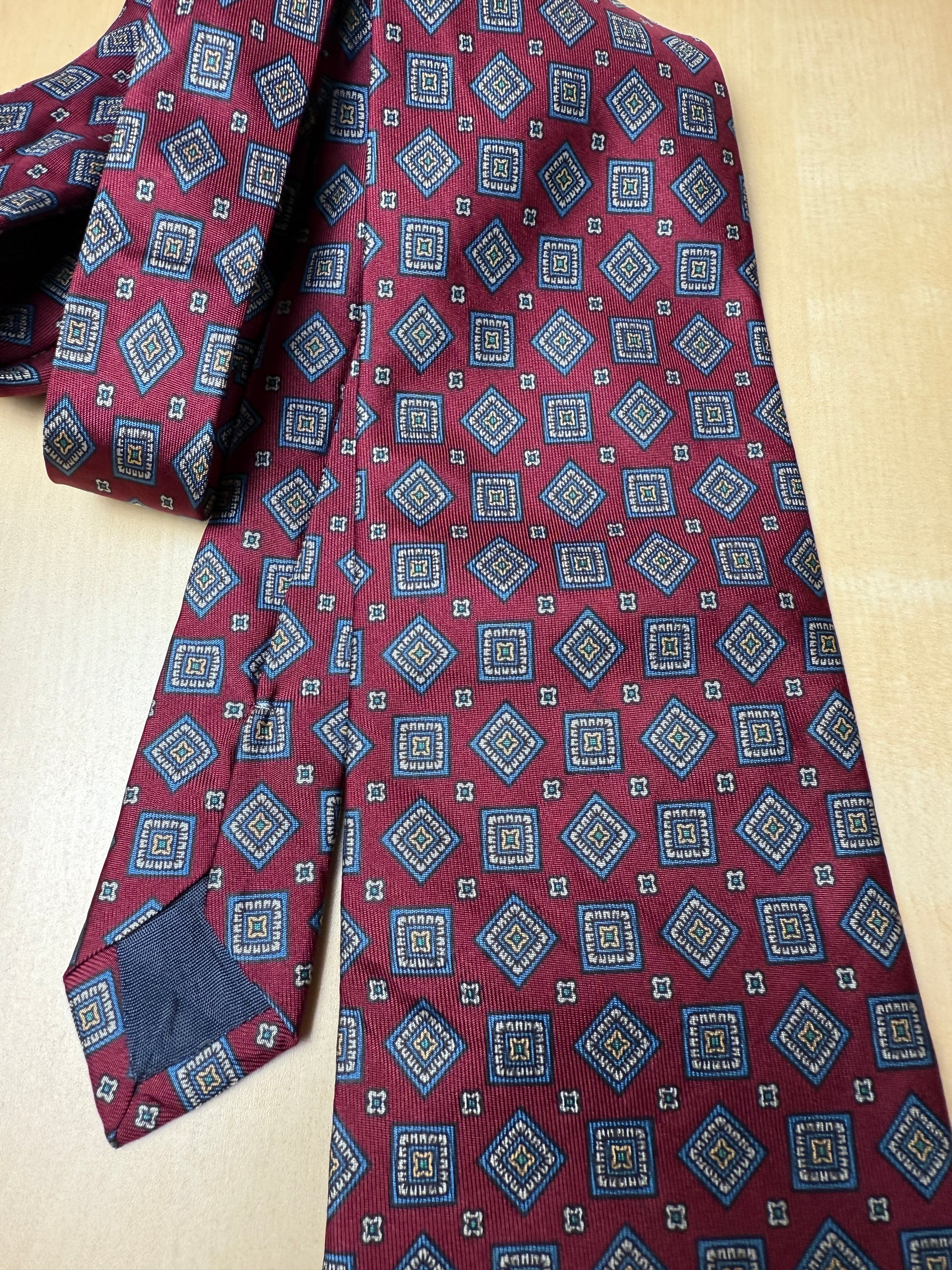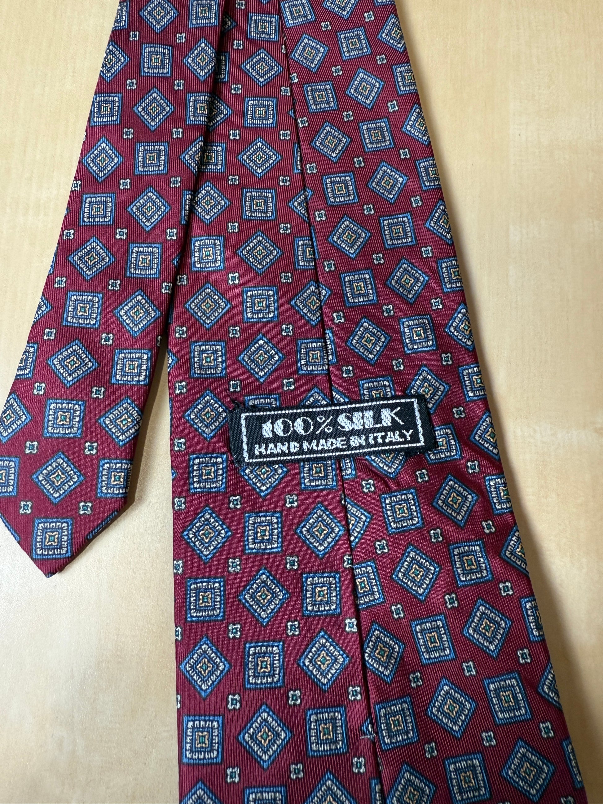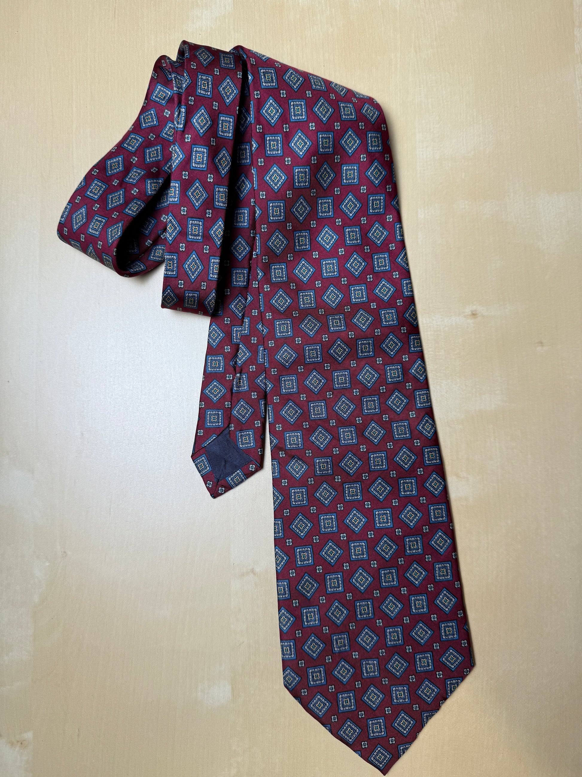 Cravatta in pura seta vintage, colore rosso scuro con micro fantasia a rombi e disegni lobati in verde.