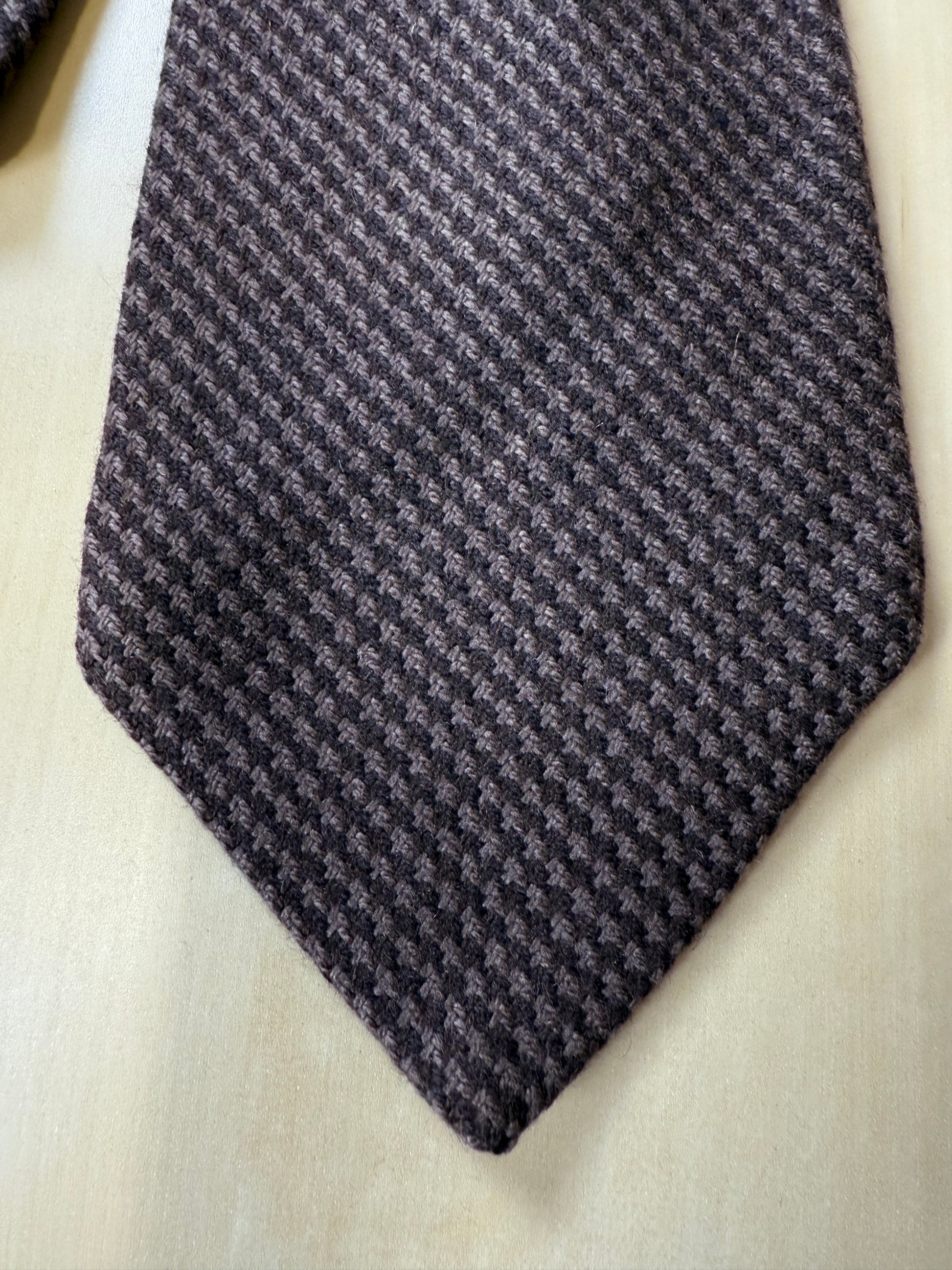 Cravatta Cramond vintage prodotta in Scozia, in 100% cashmere con lavorazione a intreccio effetto micro pied-de-poule colore marrone e nocciola.