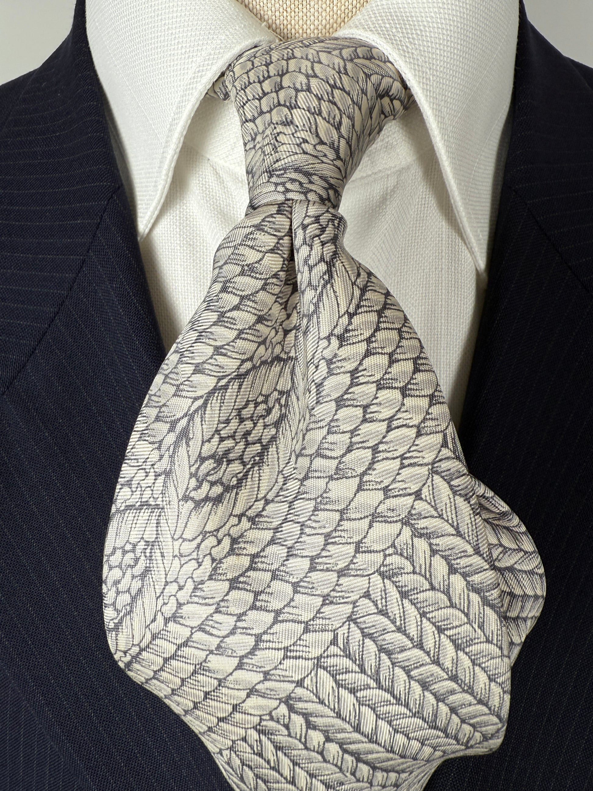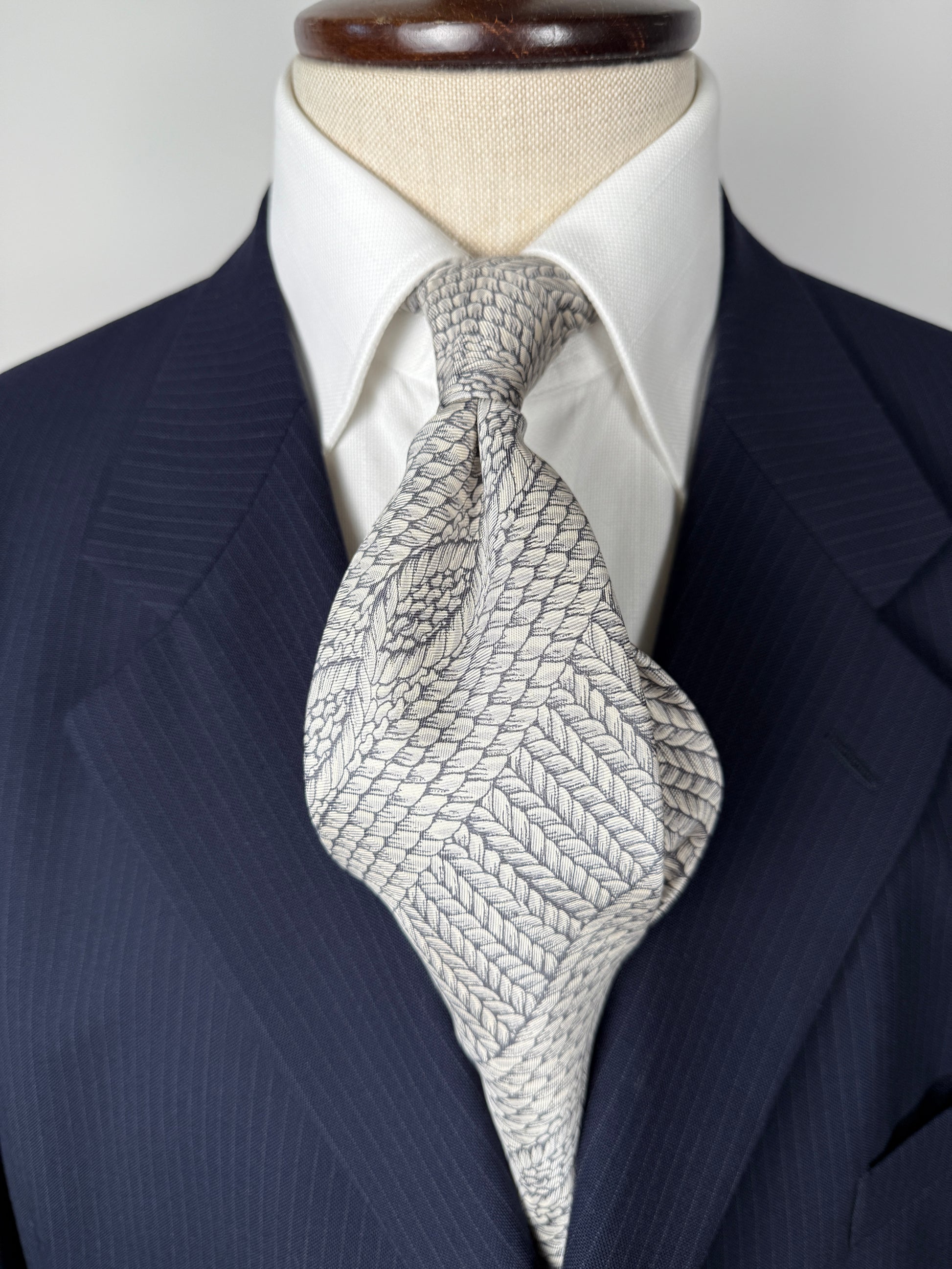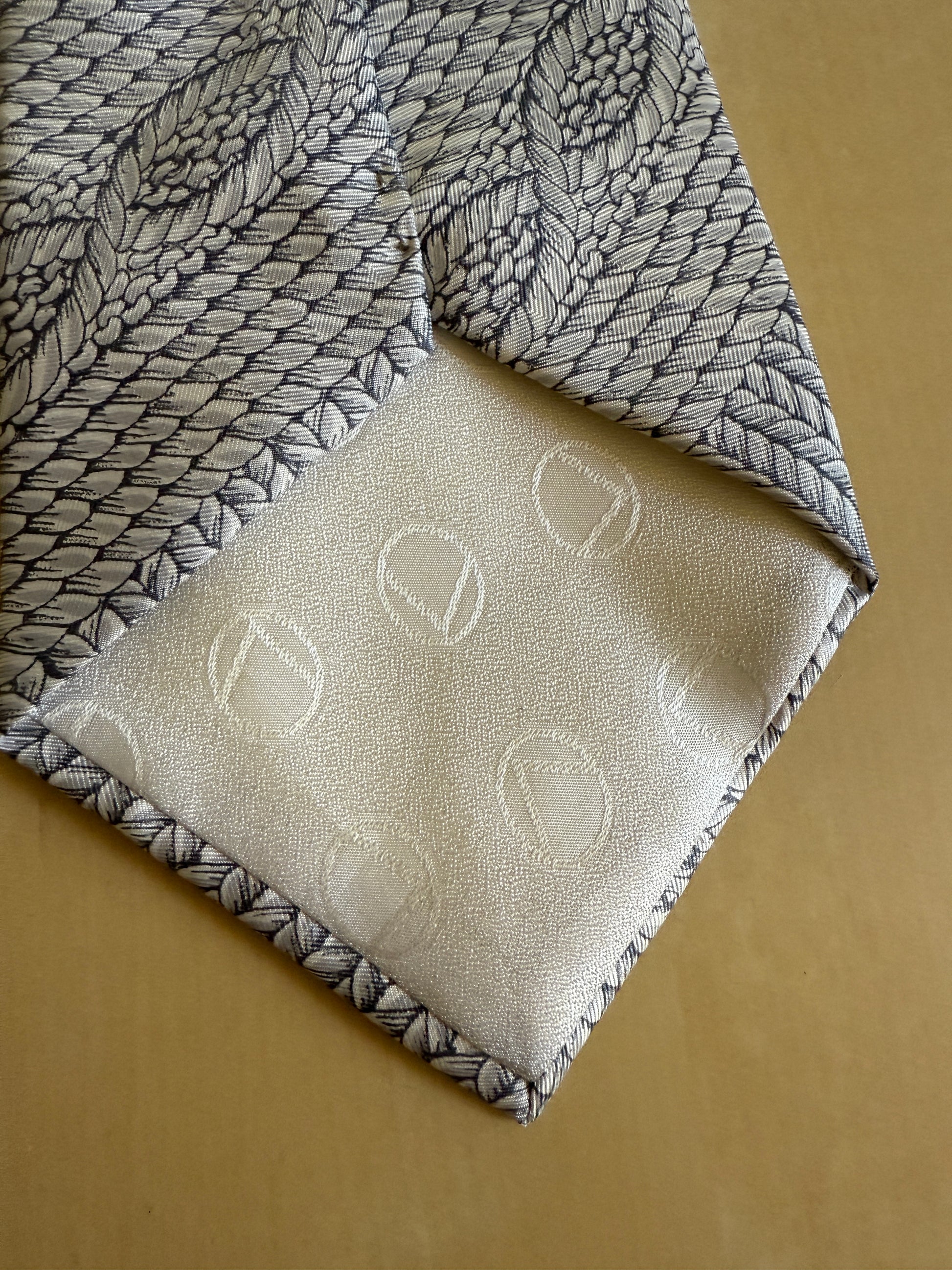 Rara cravatta Valentino fra i primi modelli anni ‘70, in pura seta, con tipica pala ampia da 12 cm e fantasia stampata effetto corda color ghiaccio.