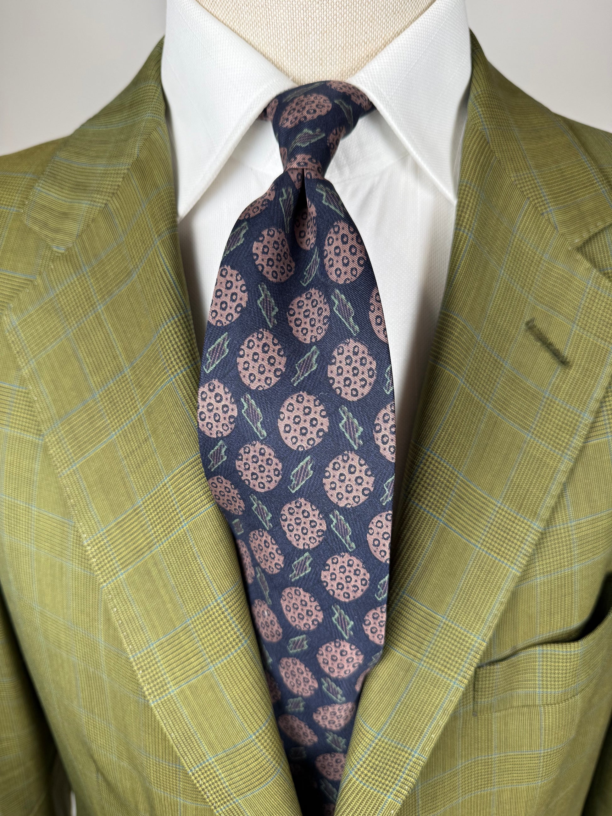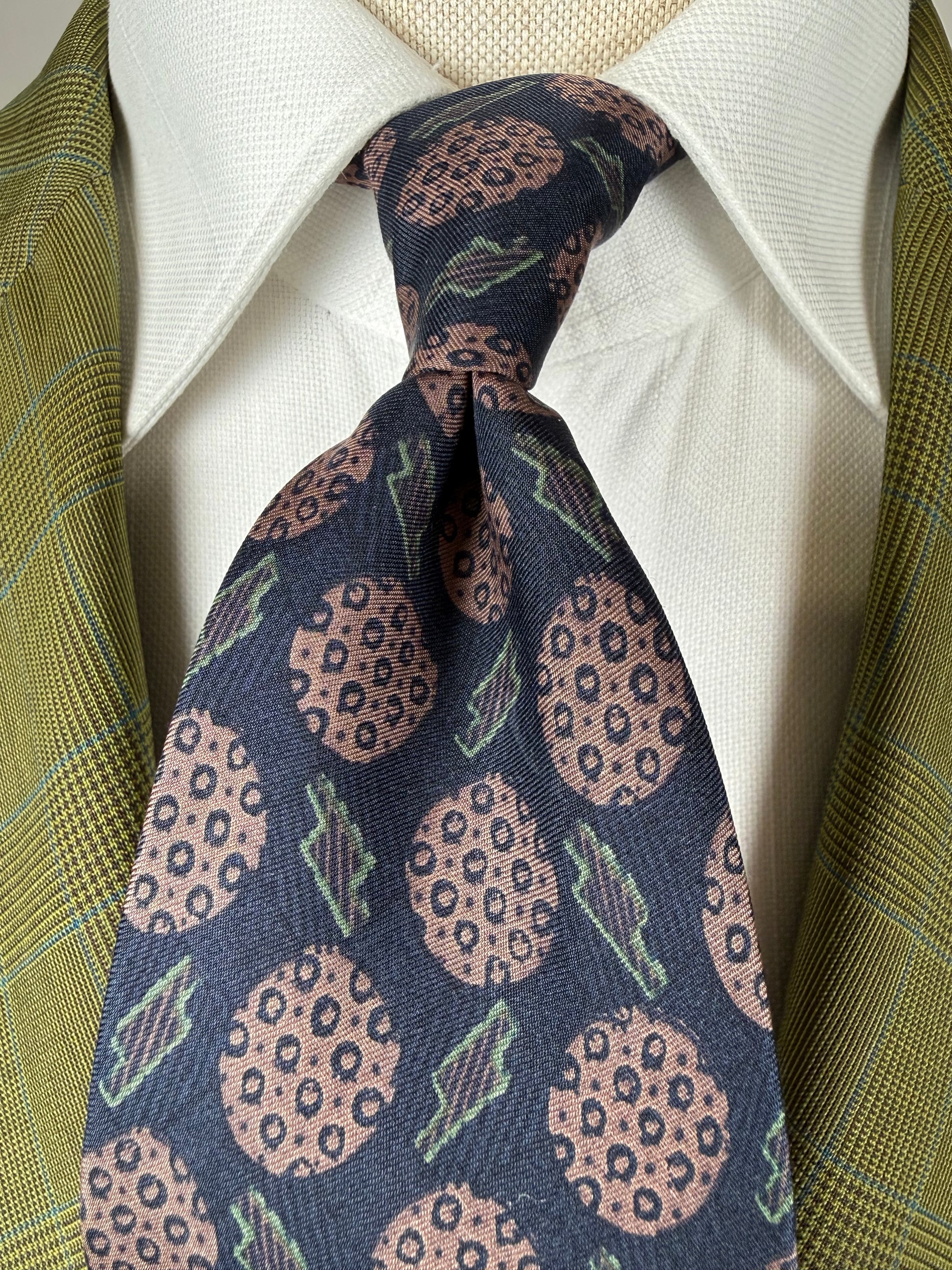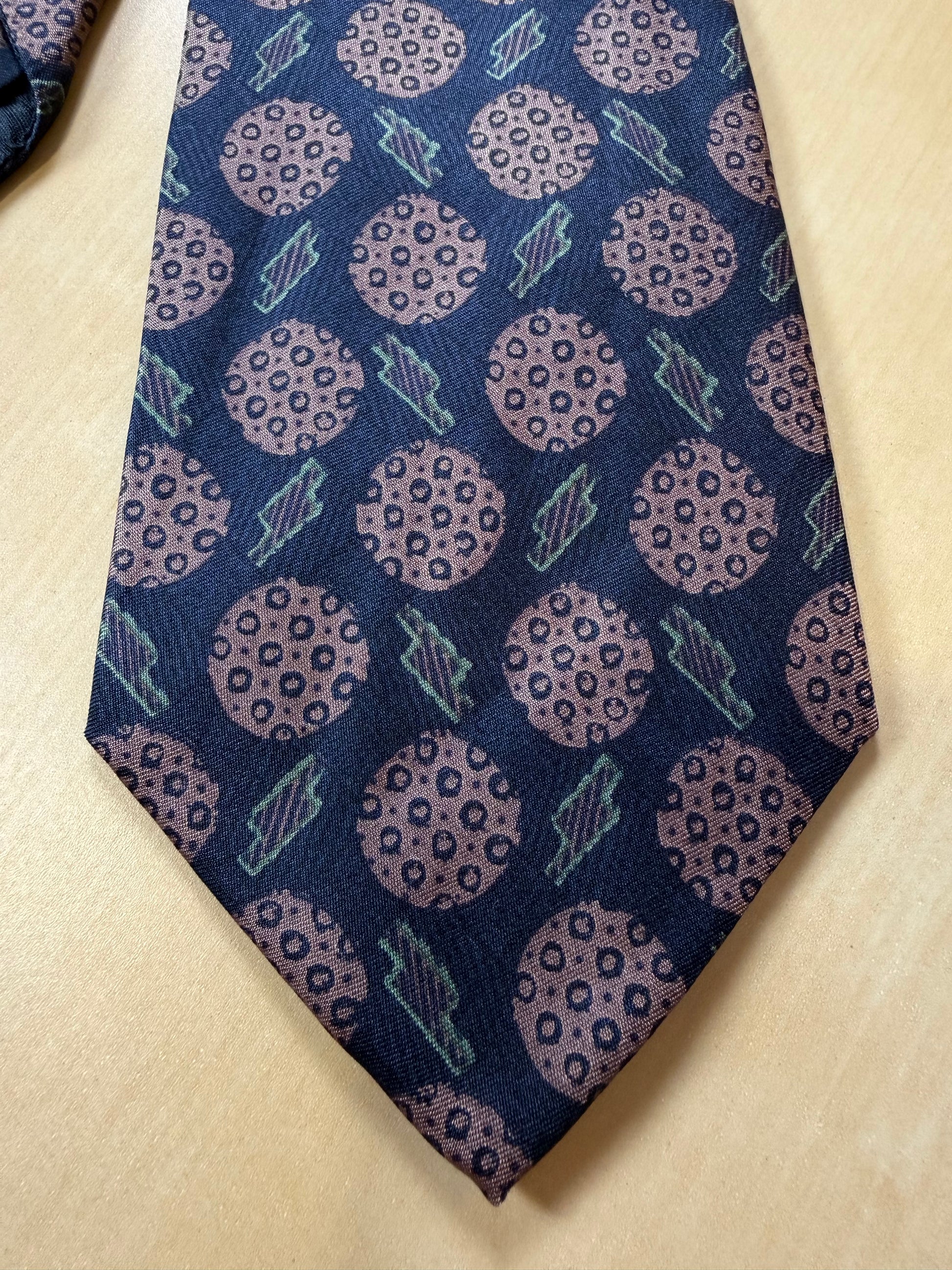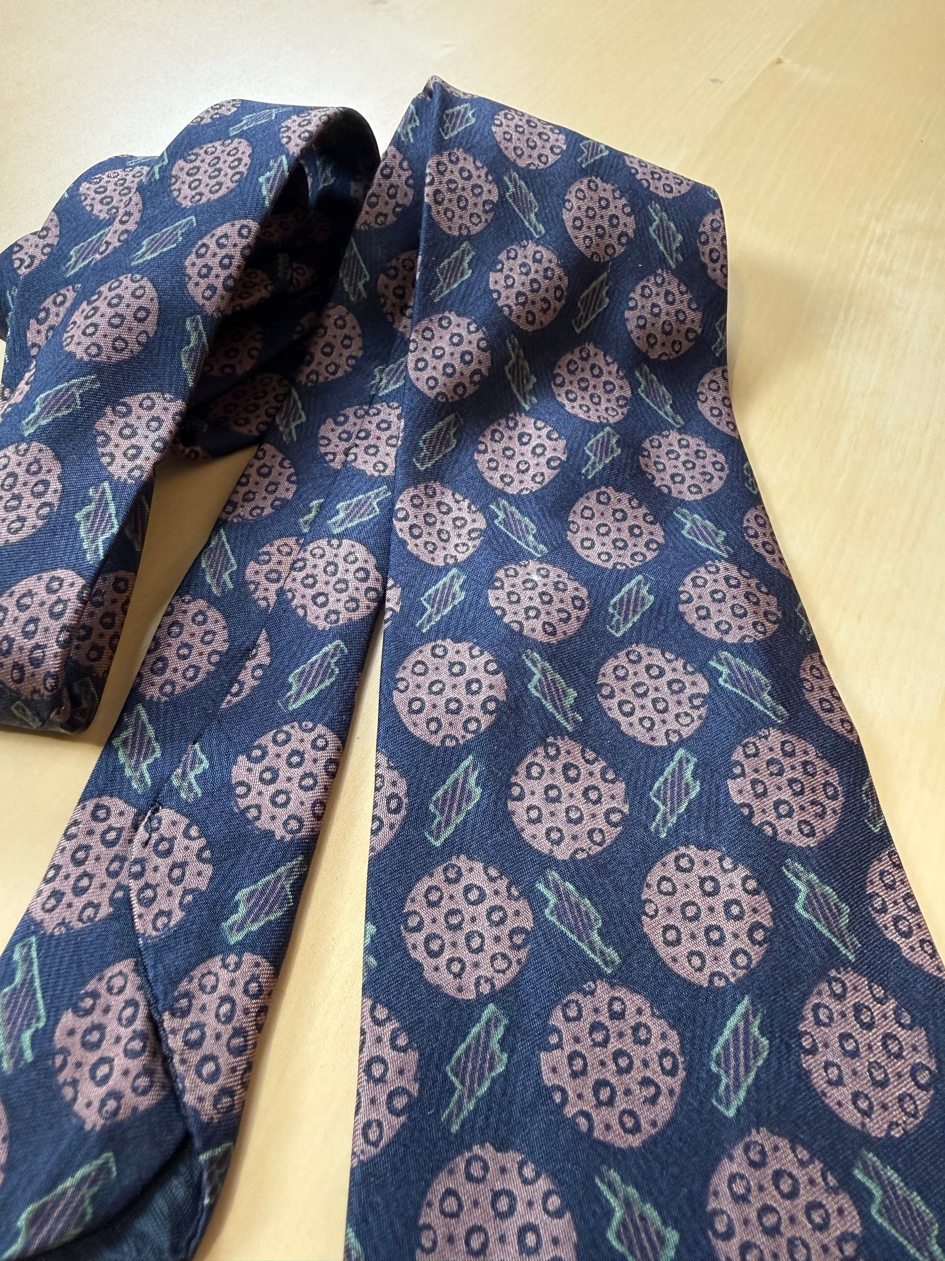 Cravatta vintage in twill 100% seta, fondo blu navy con fantasia astratta a cerchi e disegni geometrici.